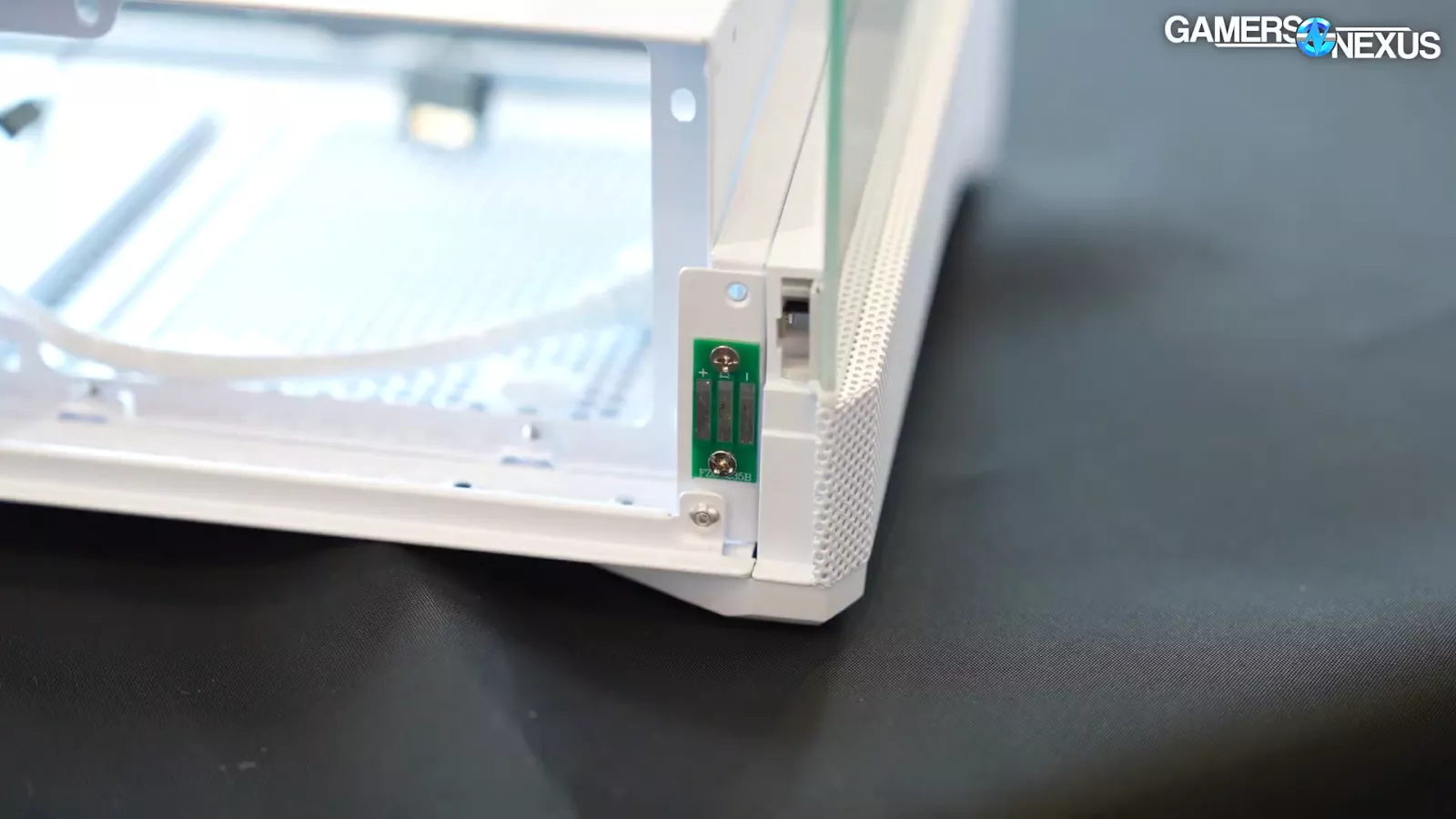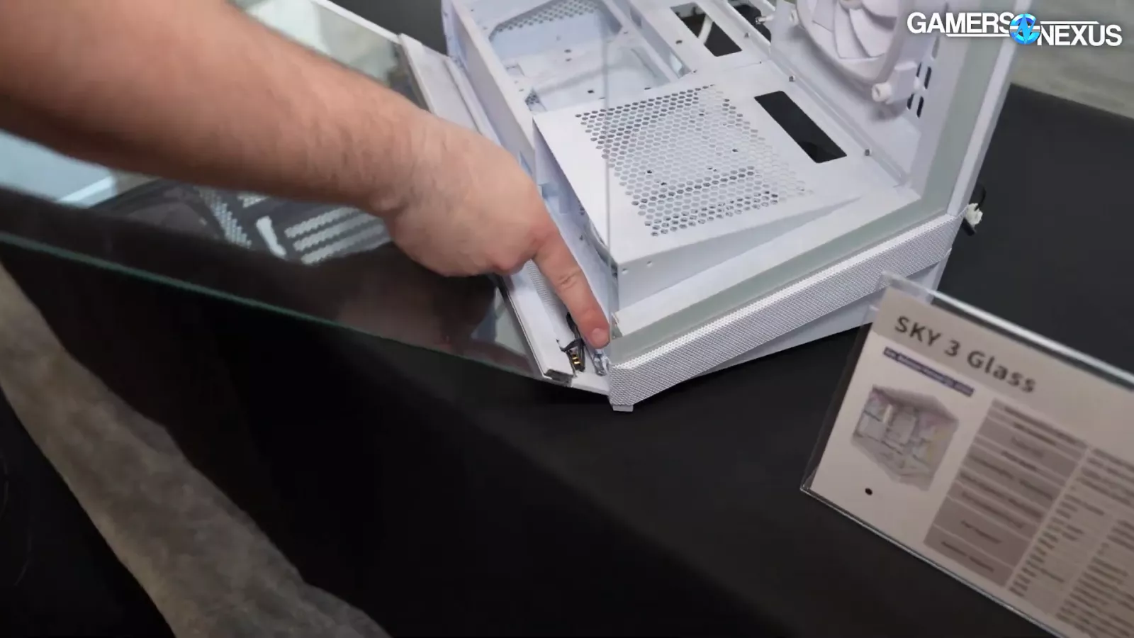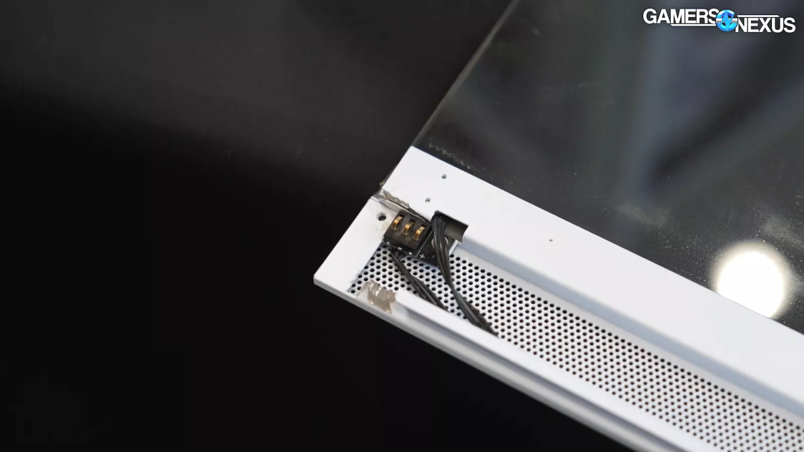 Looking at the glass side panel, we can see an alternative to traditional Pogo pins, which are used to power the case’s light strip. This design is supposed to be more resilient to damage and it’s located towards the front corner of the case and Montech says this design was incorporated to avoid breaking.