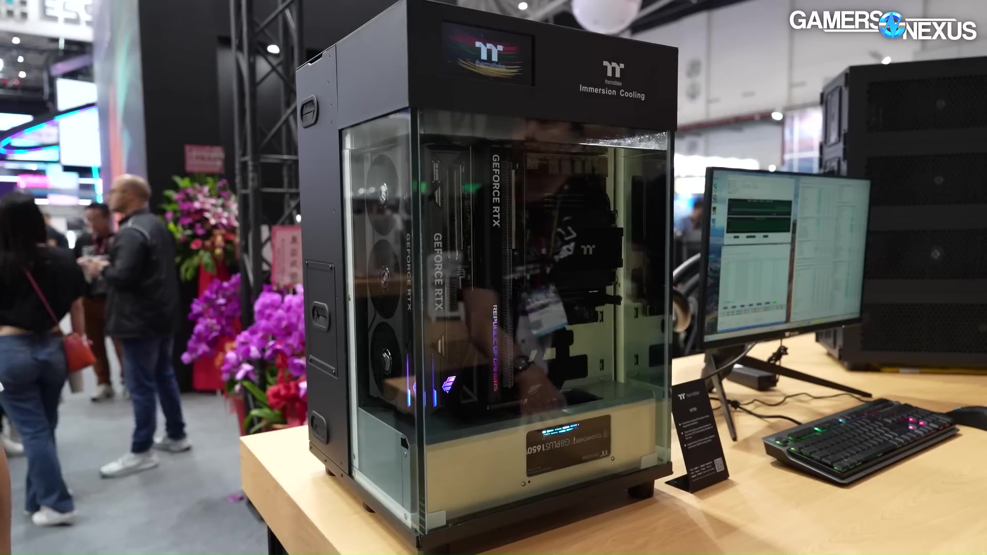 At the show floor, the company showed off a setup that offers 50 liters of “immersion cooling” within their new IX700 case. Immersion cooling means that the system is in liquid. The liquid is PA2, which is one of the more economical solutions, but is still expensive. Thermaltake tells us it's between $20 to $30 per liter.