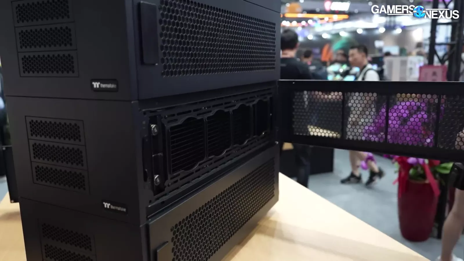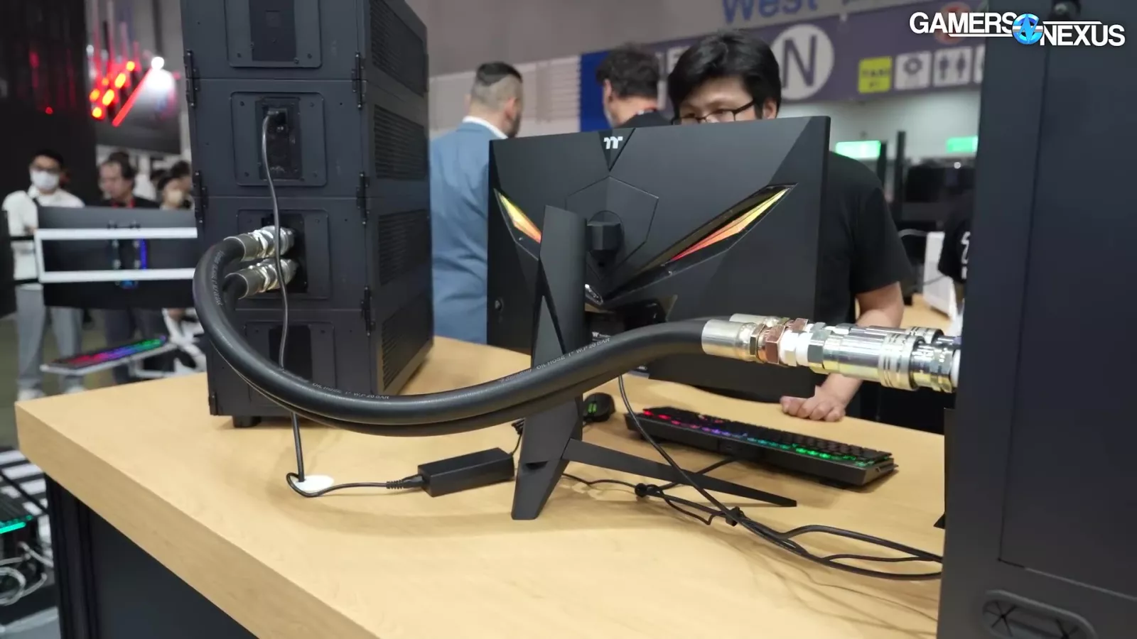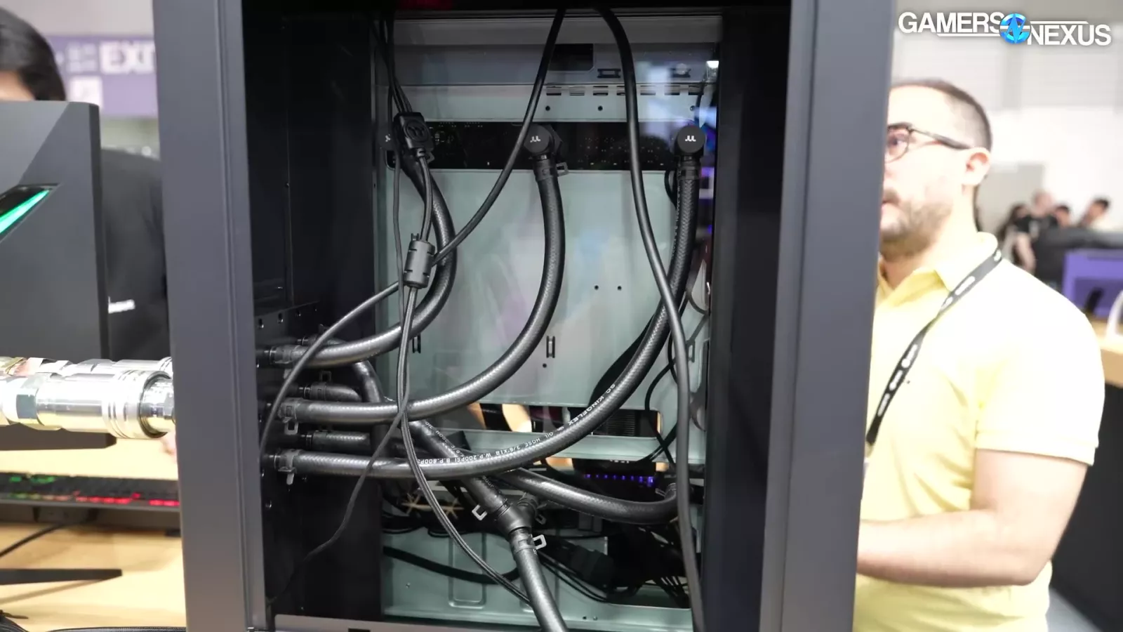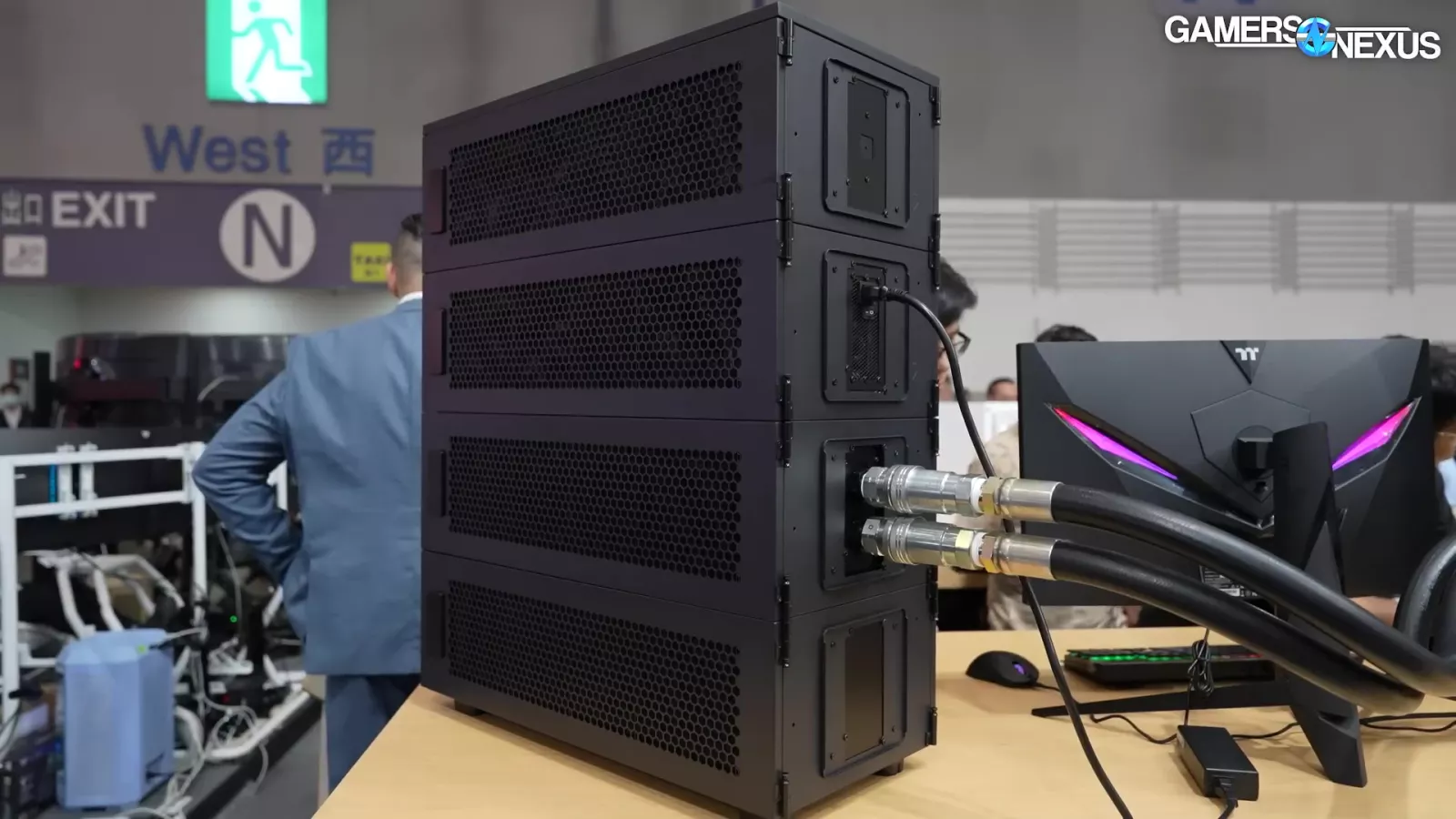 The liquid is piped through 2 gigantic pipes, which Thermaltake tells us is rated for 20 bar. That’s insane. It then connects to a massive 4-radiator system. Overall, it’s a showcase for an enterprise solution, but it’s super cool.
