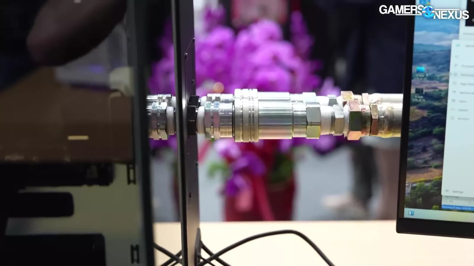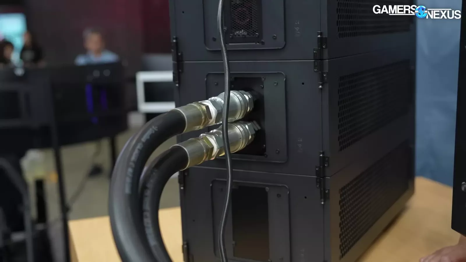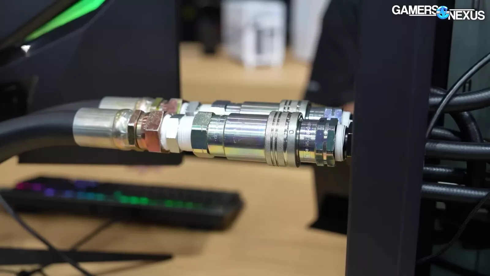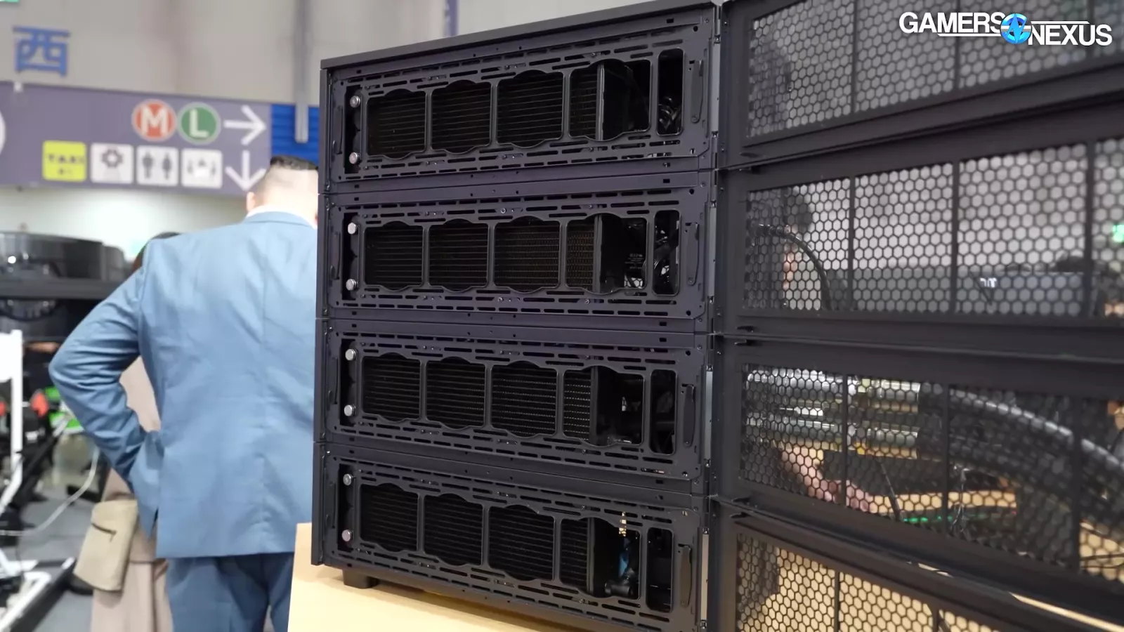The liquid is piped through 2 gigantic pipes, which Thermaltake tells us is rated for 20 bar. That’s insane. It then connects to a massive 4-radiator system. Overall, it’s a showcase for an enterprise solution, but it’s super cool.