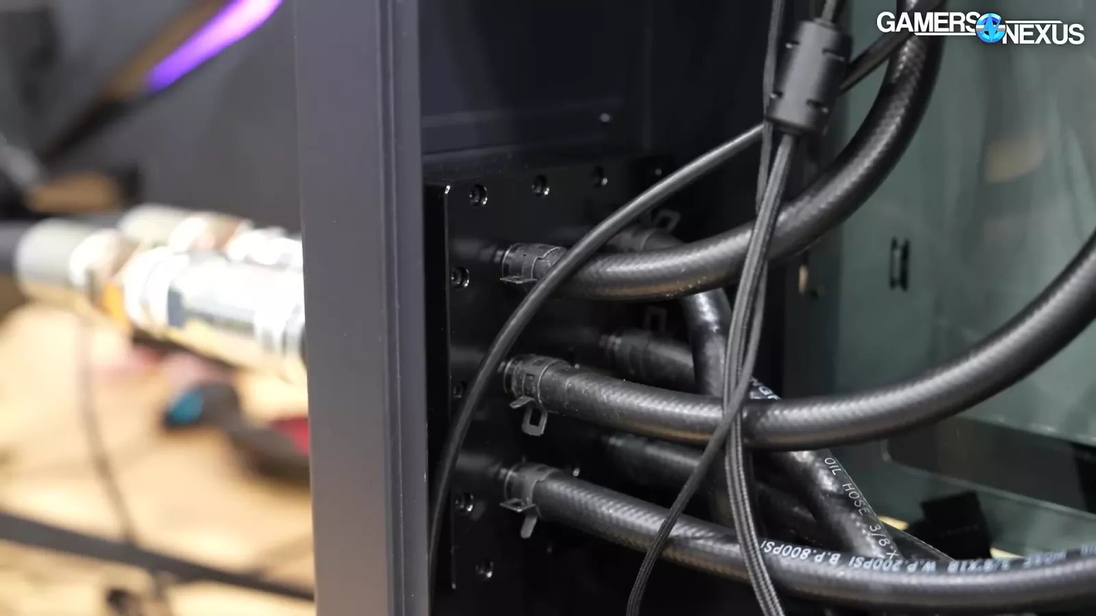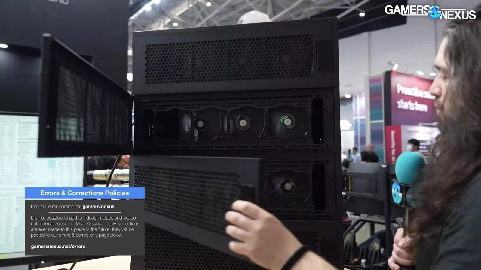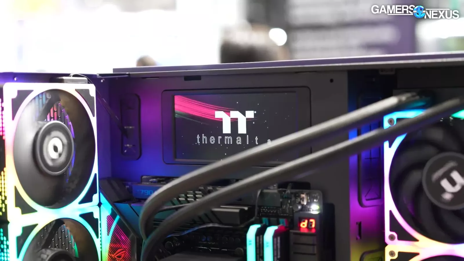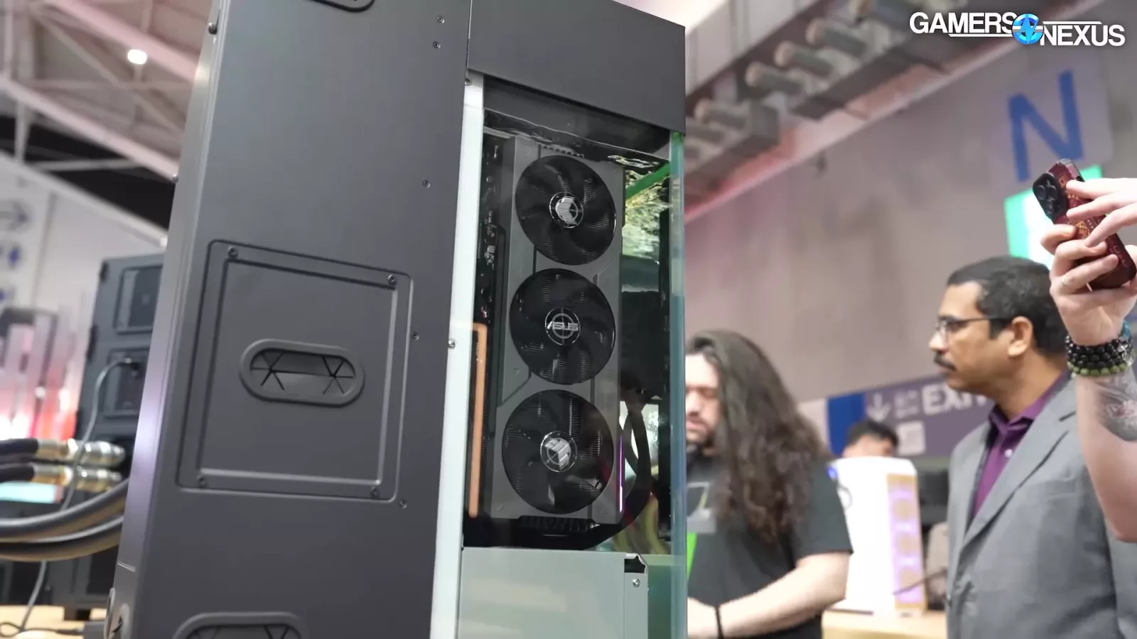 The liquid is piped through 2 gigantic pipes, which Thermaltake tells us is rated for 20 bar. That’s insane. It then connects to a massive 4-radiator system. Overall, it’s a showcase for an enterprise solution, but it’s super cool.