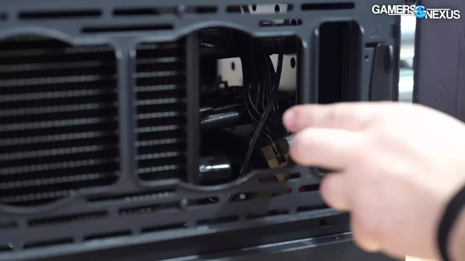 Looking inside the TR300, we can see a lot of Yeston-inspired marketing material on the pump block. In addition, the case also has a closed-off side near its front that tries to obscure the power supply and its cables because the PSU is mounted to the front and is rotated on its side. Unfortunately, this design does limit options for intake fans in the front. The case relies on bottom intake fans and some on the side. Again, unfortunately, the bottom of the TR300 is not that elevated though the TR200 does have more room to breathe, which we liked seeing.