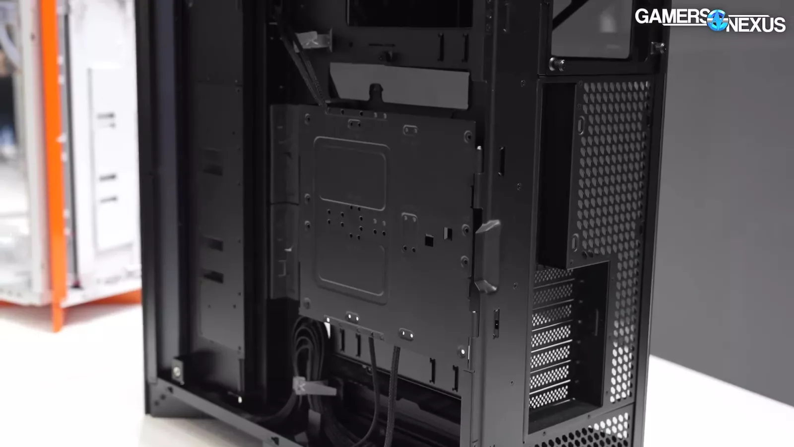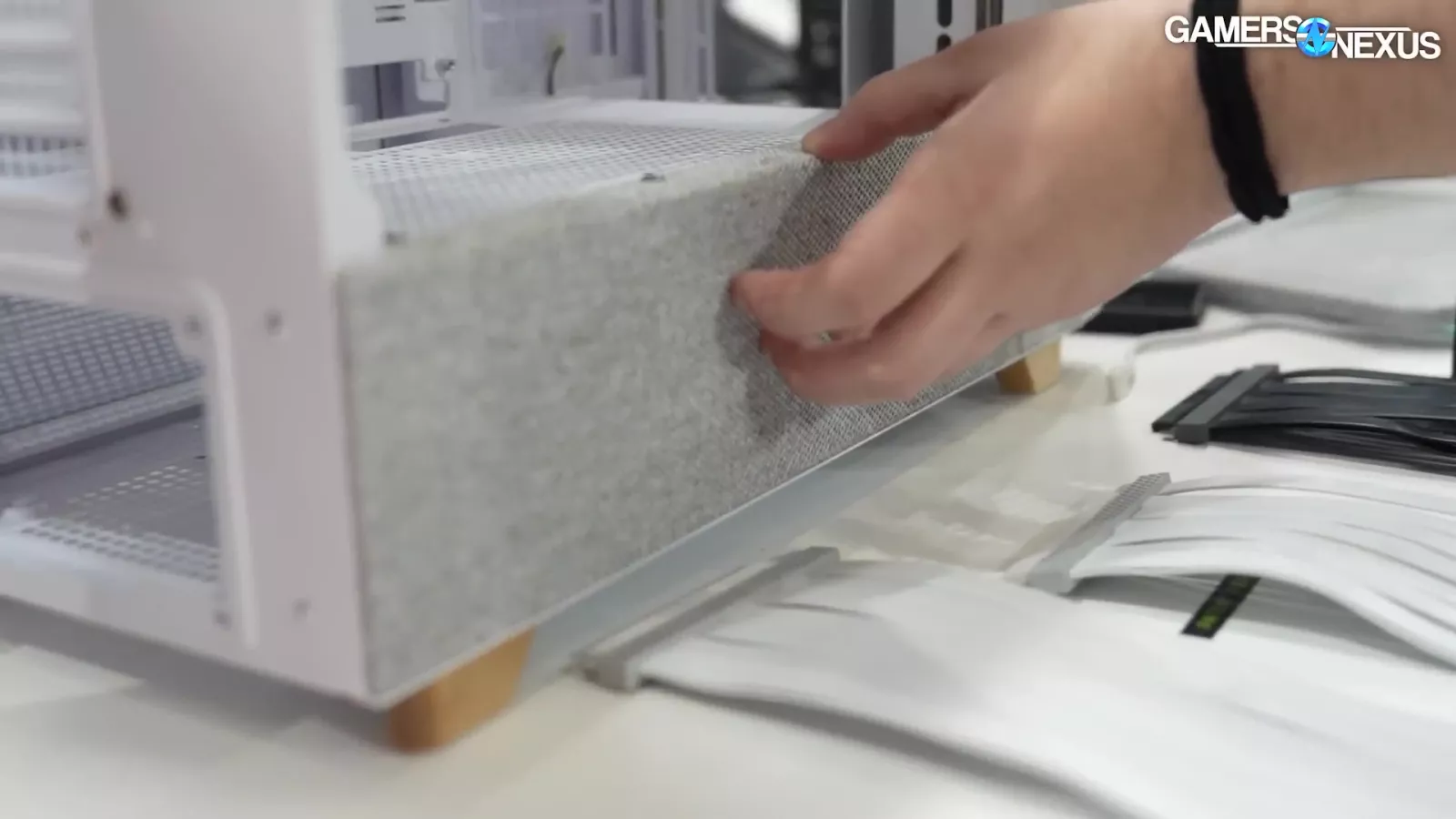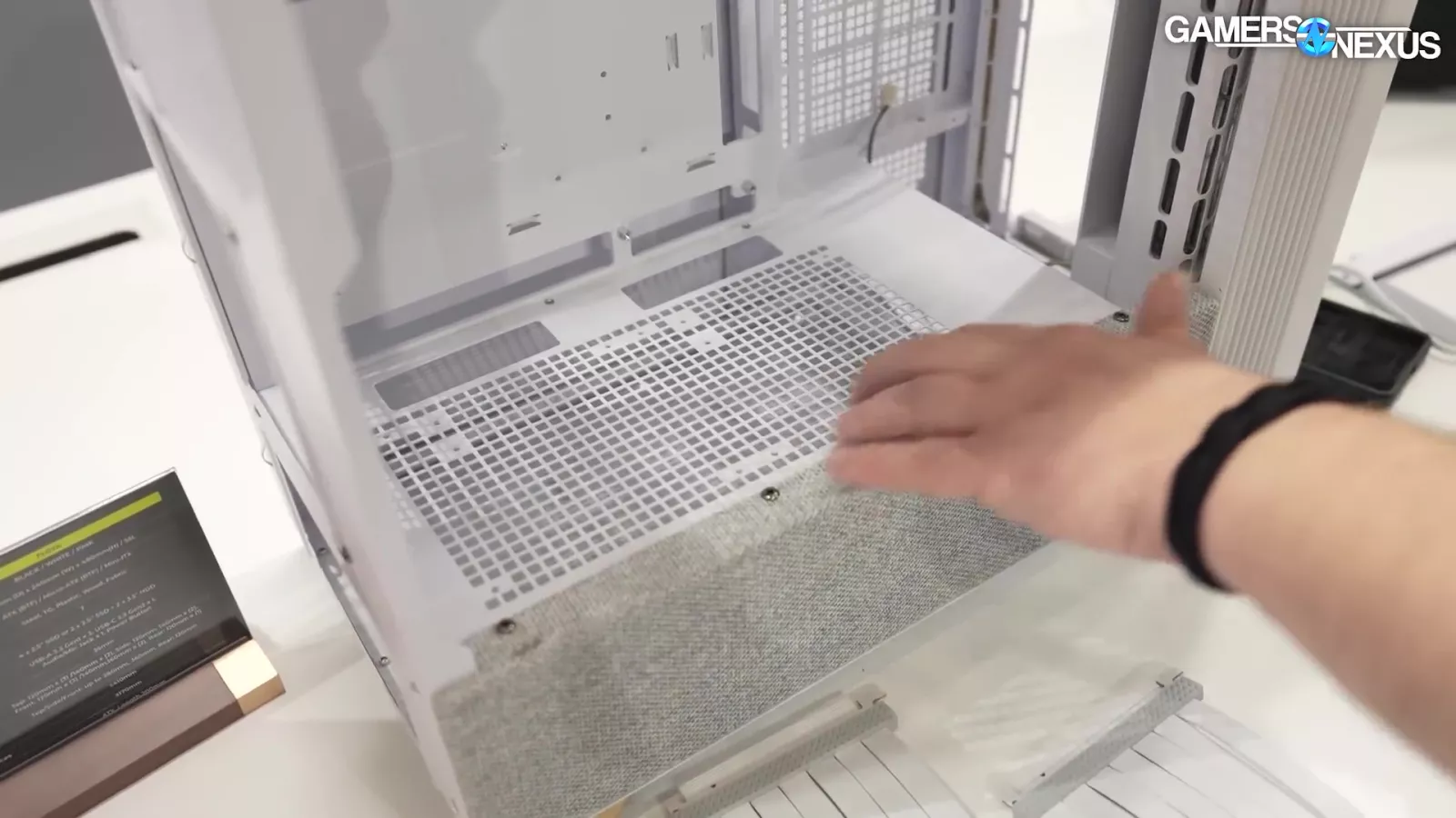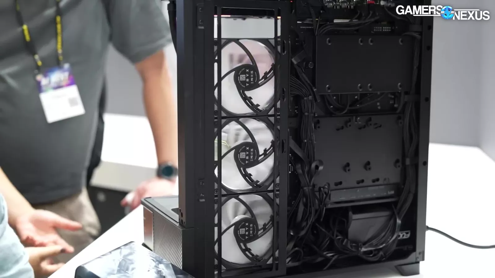 We can conceivably see, with a really good crossflow fan design and implementation, there’s a possibility that TRYX is able to improve the cooling performance across the CPU and GPU. It’s really going to depend on how the company tunes for acoustics because crossflow fans can be noisy with their drum motors, which, in this instance, are located at the very end near the power cable. In our testing, it can make some higher frequency noises. It also runs at a higher RPM. The unit we saw was running around 2,400 RPM. The benefit is that the case is able to pull in air through the front and side. The crossflow fans are also a little closer to the front of the video card and should help with GPU performance, but will depend on how TRYX engineers it.