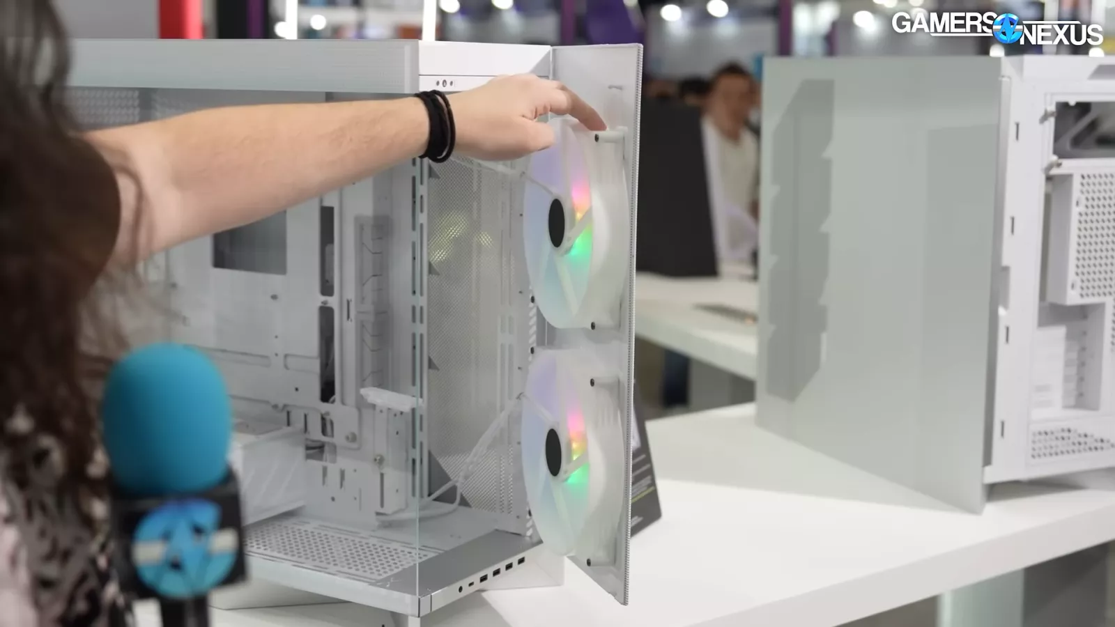 It has a hinged door as a front panel, and its airflow variant comes with two 200x38mm dual-ball-bearing fans. That’s on the thick side for fans, comparable to the fans on the Torrent. The hinging is the most interesting thing here, and it would be phenomenal if Tryx could move to pogo pins or pin-to-pad contact for the fans instead of wires, but we don’t know what the pricing impact would be.