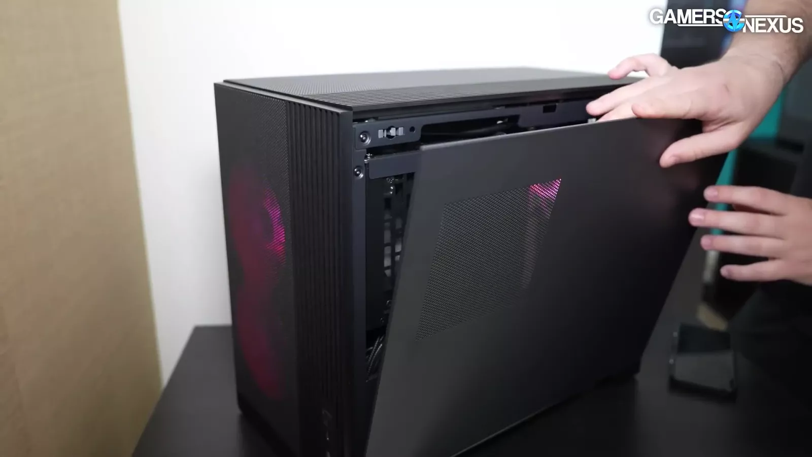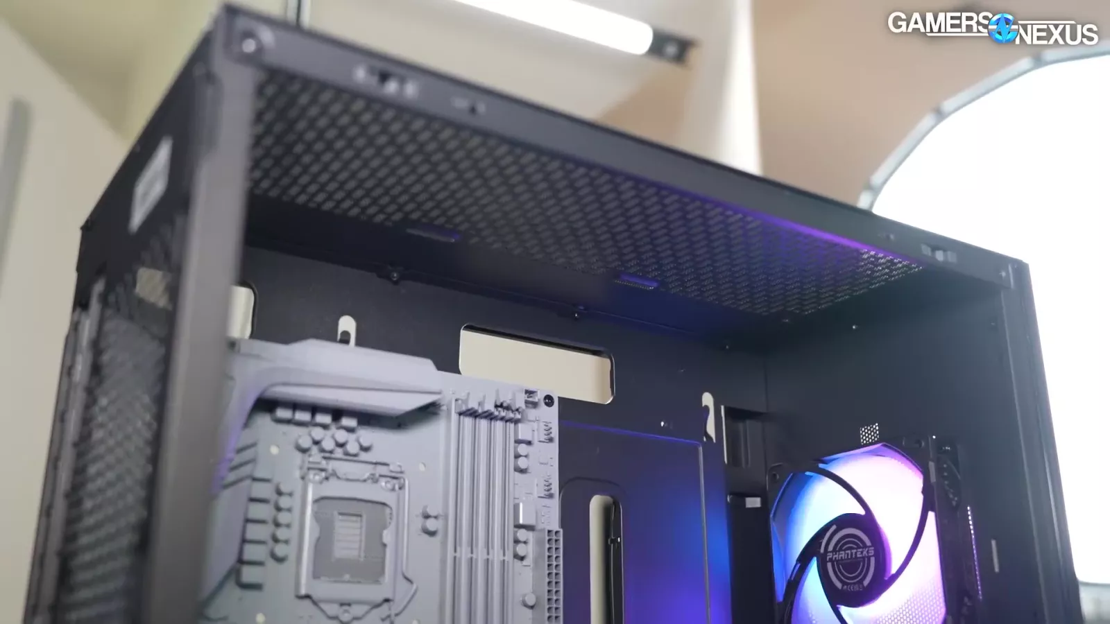 The top panel is part standard ventilation but it does have one side that provides less airflow, which covers where the PSU would exhaust out of. The side panel does have punch-outs for the PSU, however. We don’t test power supplies, though that may change in the future. Power supplies can take a lot of thermal abuse, however, so we’re not super concerned here.