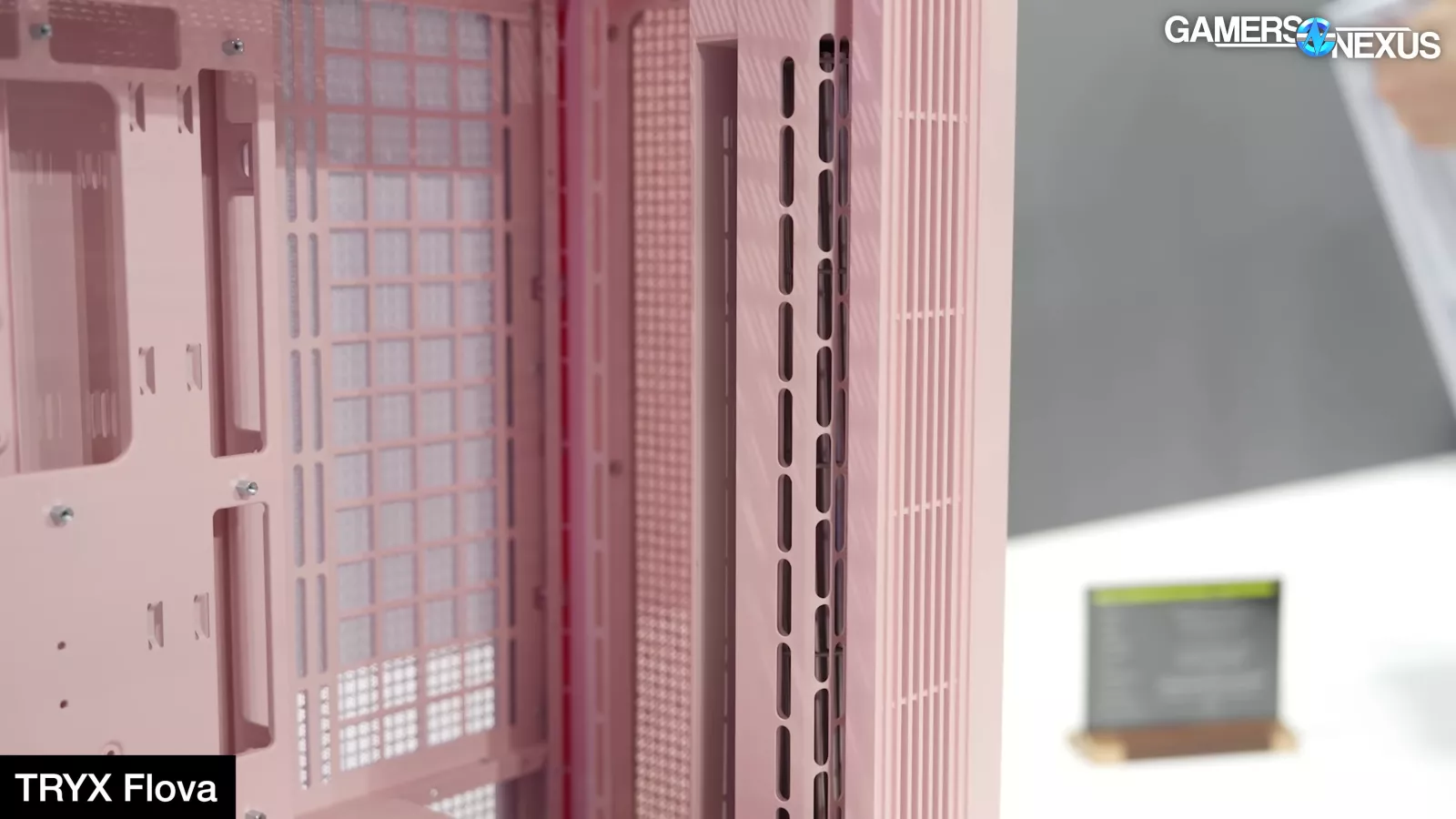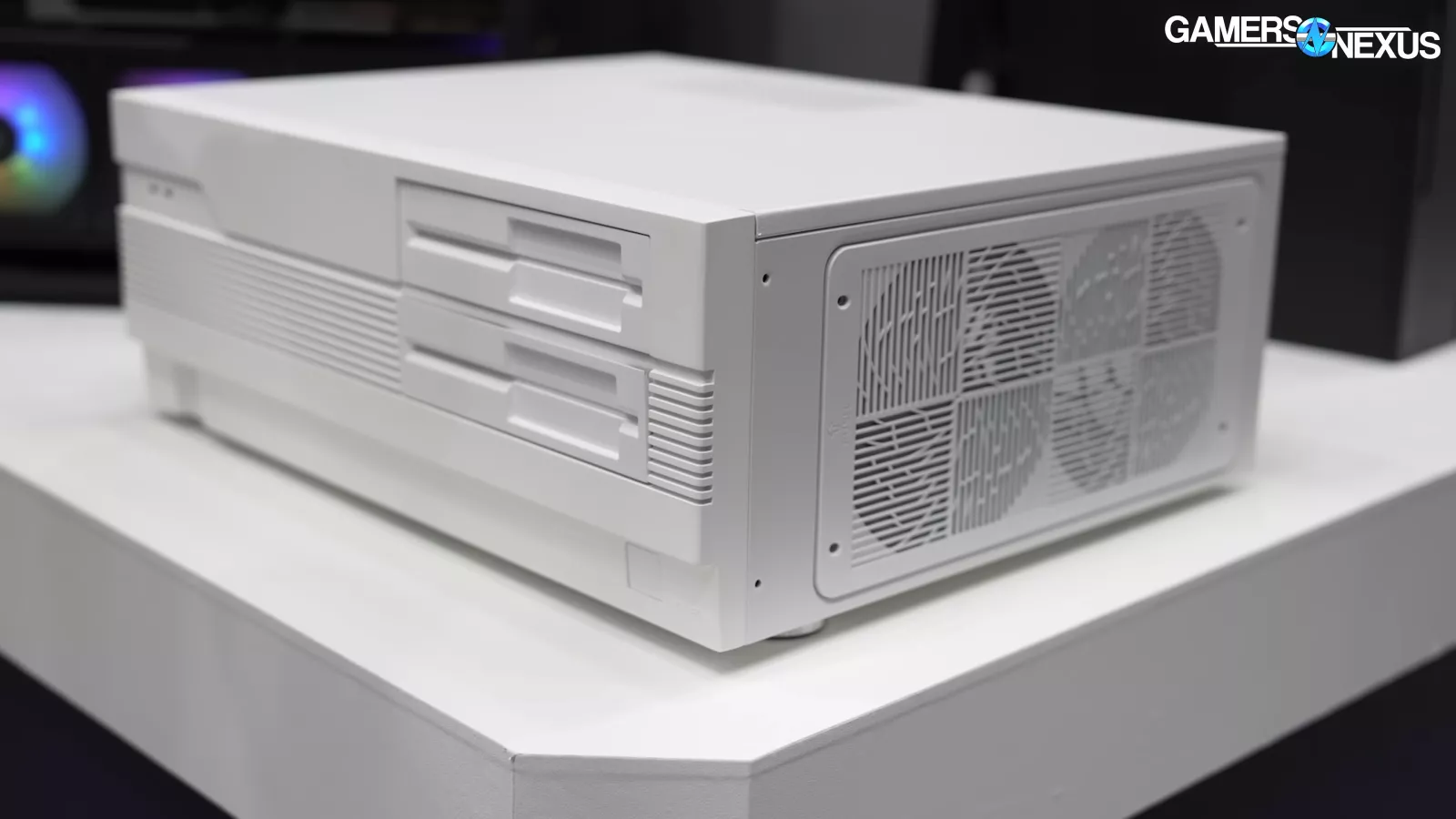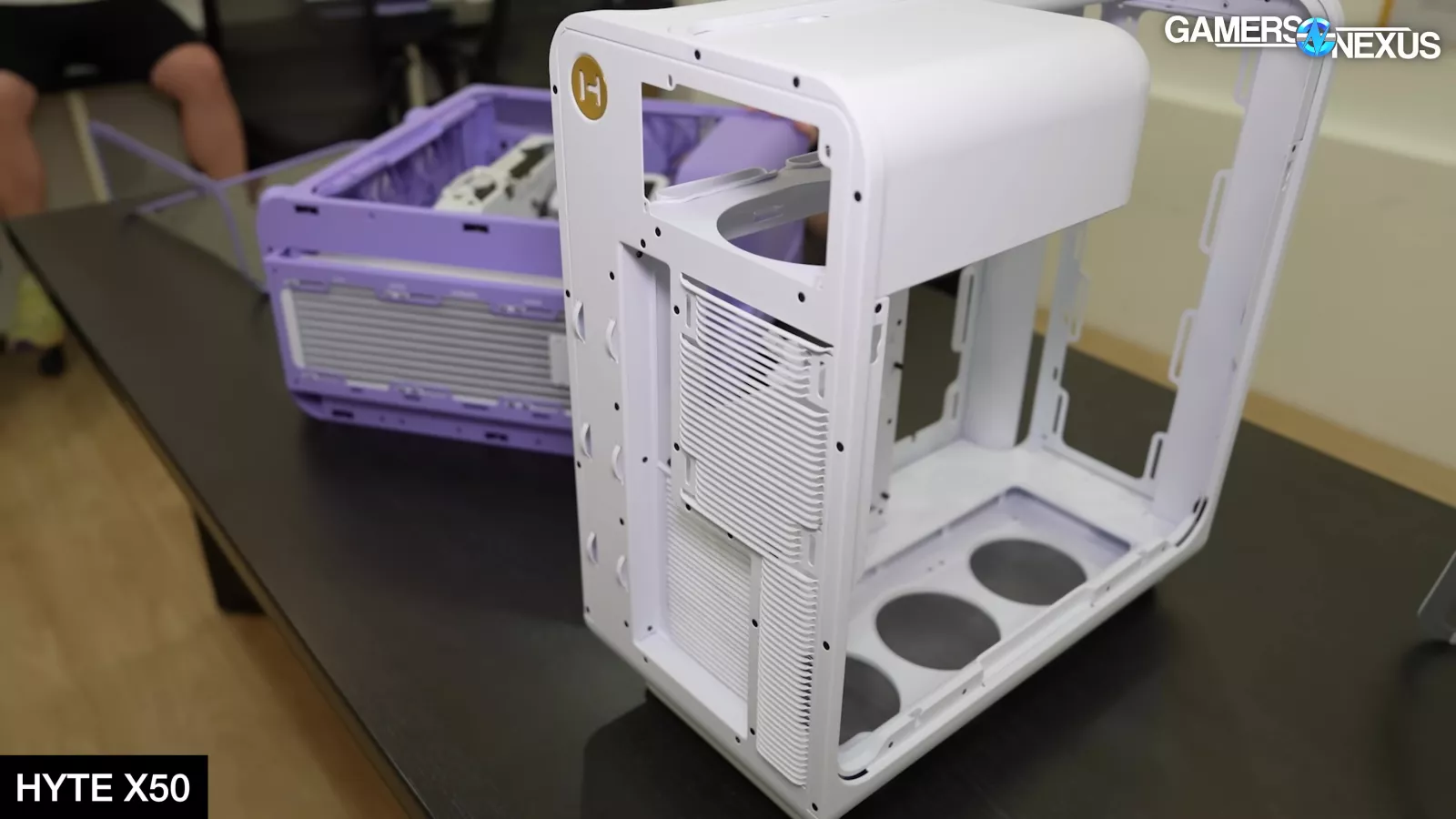 Hyte showcased its new X50 case, which is its most mechanically complicated product to manufacture to-date. The X50 uses a bubbly external look while attempting to be the highest-performing case on benchmark charts. Hyte uses a front panel that’s perforated all the way around the apex of the turn, leaving only a small strip at the mounting point for rigidity. The case also has louvered slats at the back, including for the PCIe slots, which add mechanical and manufacturing complexity but strengthen the chassis structure while improving airflow performance. Hyte noted that its intent, which we’ll test in our review, is to help project air away from the system, highlighting that there’s always focus on reducing intake impedance but noting that exhaust impedance is similarly important.