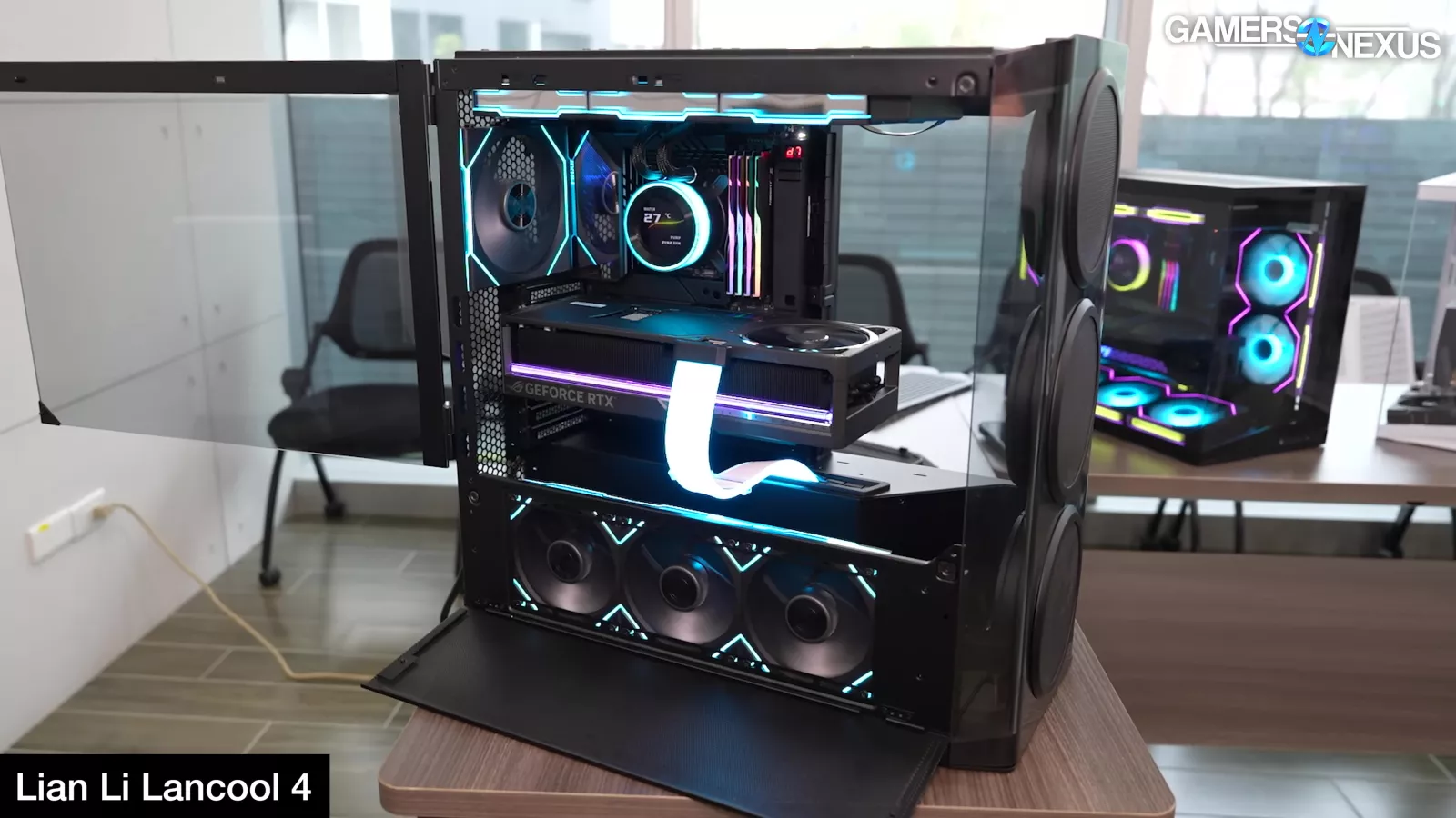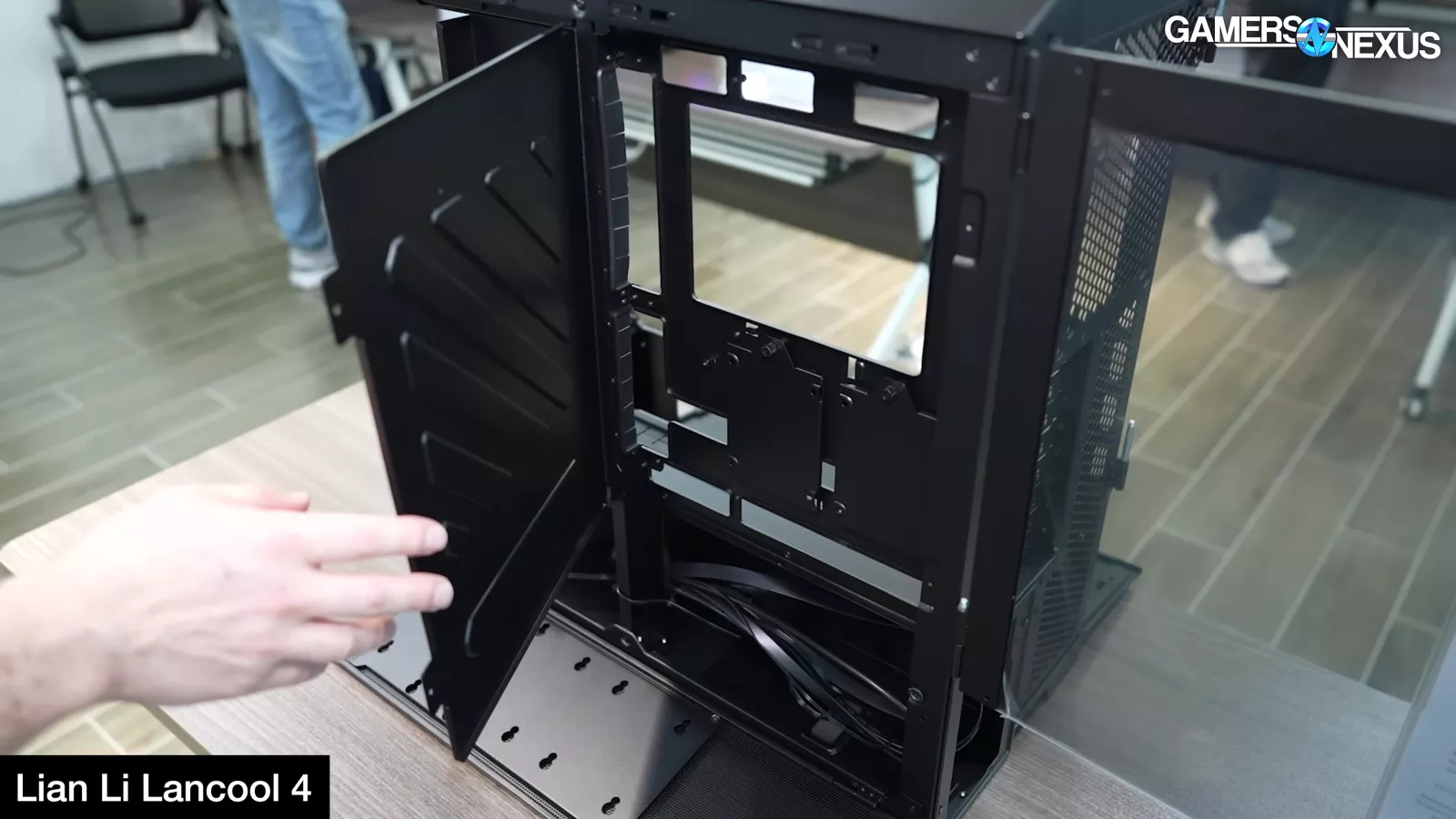 A pogo pin setup allows the front panel to transfer power without use of a cable, followed by a mix of painted glass and plastic covers to hide cables daisy chaining the fans. Lian Li is considering including 3x 140x30mm front fans and 3x 120x25 side fans, with a pricing target at $130 including all 6 of these fans. This would be extremely competitive if they can do it. Lian Li has committed on camera with us to a 5-year warranty for the fans.