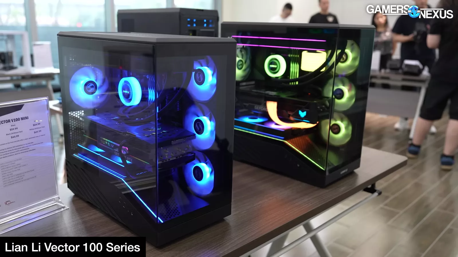 Lian Li had a few honorable mentions at the show: Its O11 Mini V2 made an appearance and manages to cram an ATX power supply into the case by punching out space in the side panel. The Mini V2 should be $90 without fans and $100 with 5x 120 fans. The Dan Case B4 was also an interesting showing, mostly for its ability to attach feet and switch to a much higher volume vertical orientation. It makes use of the space provided by the feet by also including a radiator extension chamber to support a 360mm radiator on the side. More interestingly to us, the Vector 100 and Vector 100 Mini cases are extremely cheap. The Vector 100 Mini micro-ATX case is intended to sell for $45 without fans, making it a direct competitor to Thermalright’s new mATX case.