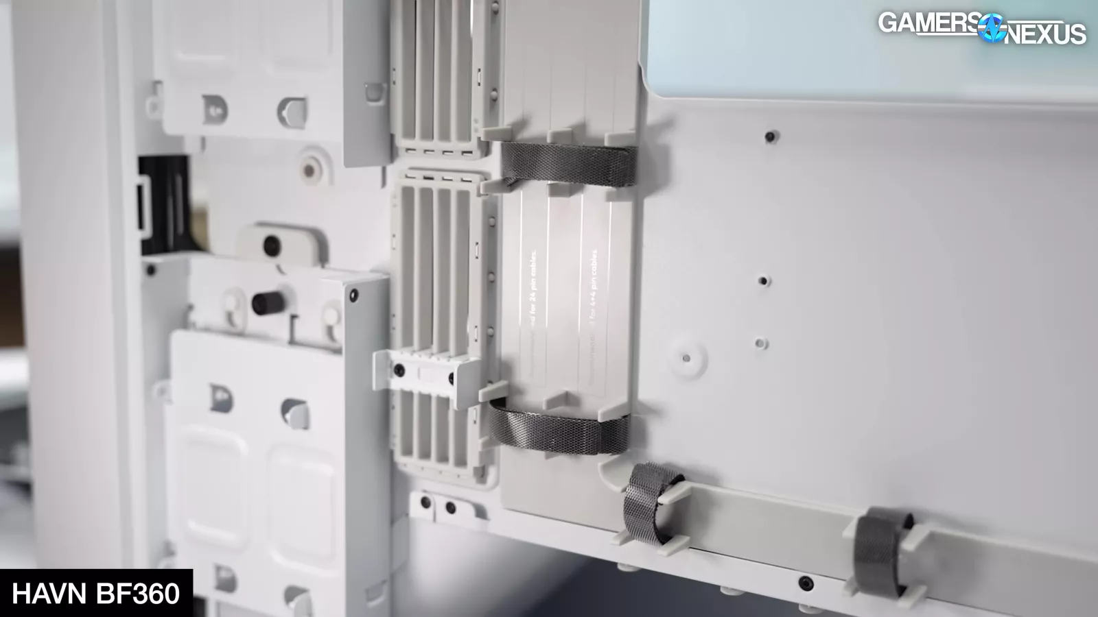 HAVN has brought over smaller attention to detail embellishments on this case from the HS 420, including molded text in the plastic cable routing channels to guide novice users to potentially optimal routing pathways. For looks, HAVN is going for white and black, but with a faked stone-looking front panel. Pulling that front panel reveals the steel plate above the top 180mm fan, serving to prevent re-circulation and force air intake through the ideal channels.