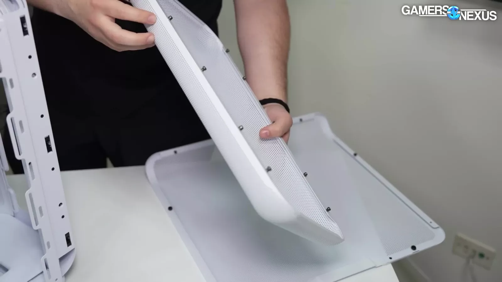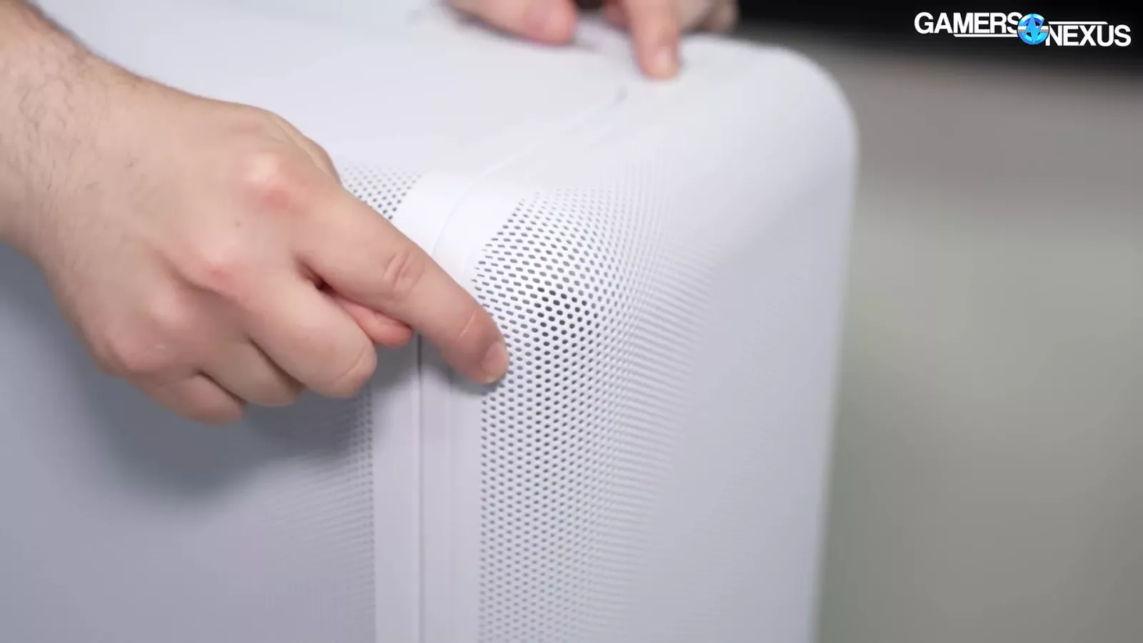 Looking at the final front panel design, there’s about 40mm of mesh depth and that’s stamped into a piece of steel that was at one point a solid piece. The company then folds the remaining solid piece, which have studs in them that click into clips.
