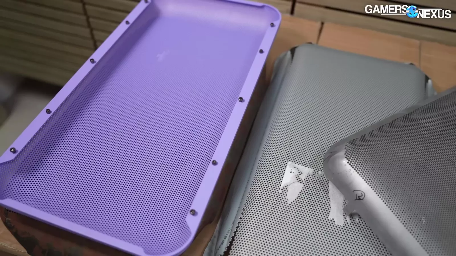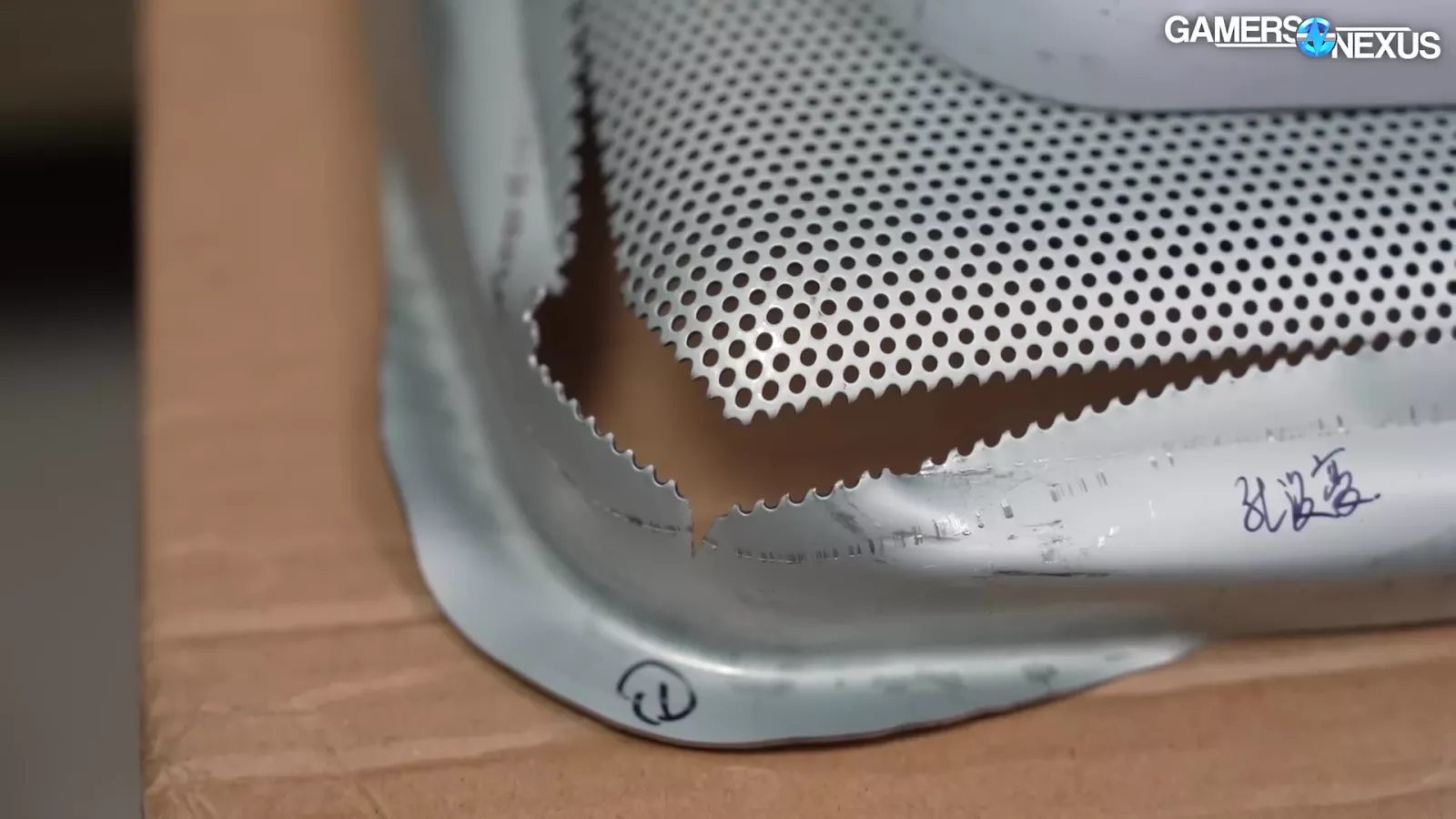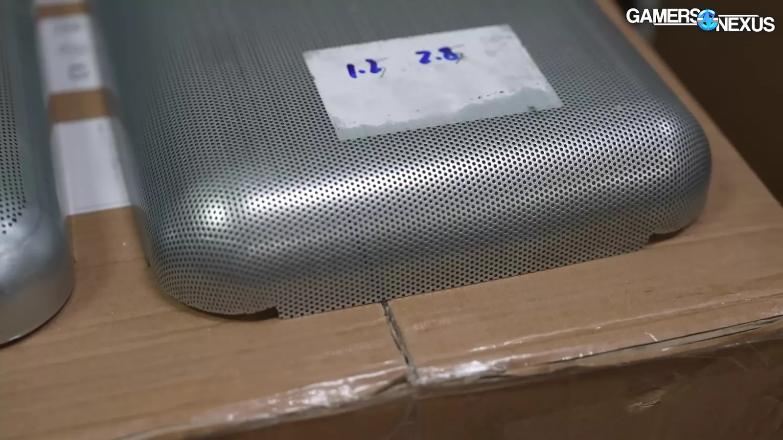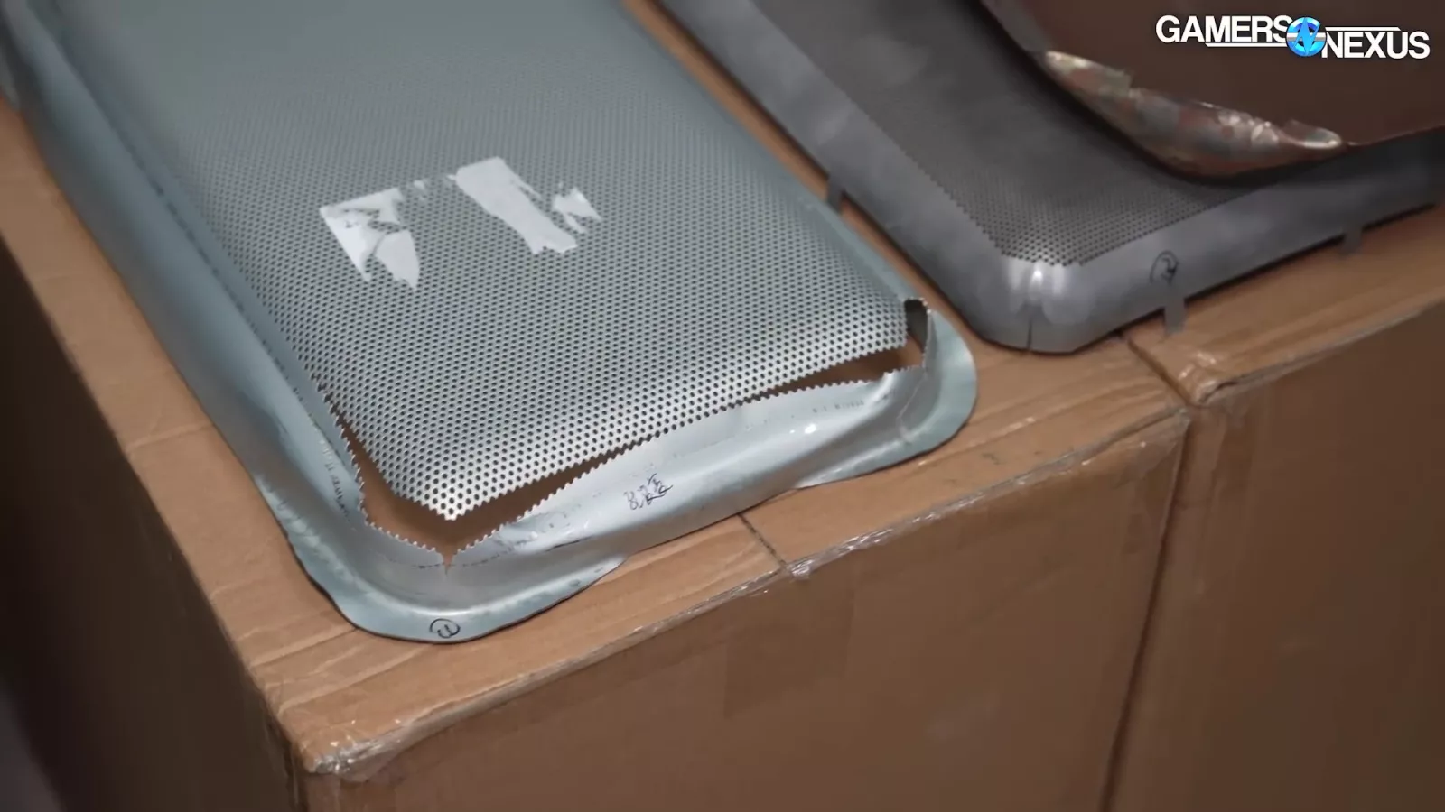 Another unit we looked at used lower porosity mesh on the edges, which is what the factory Hyte worked with said was the limit of what it could do. Hyte couldn’t accept this design, however, as they were targeting over 40% porosity. Teller says the X50’s final design ended up having about 45% porosity with 2mm holes and 3mm spacing.