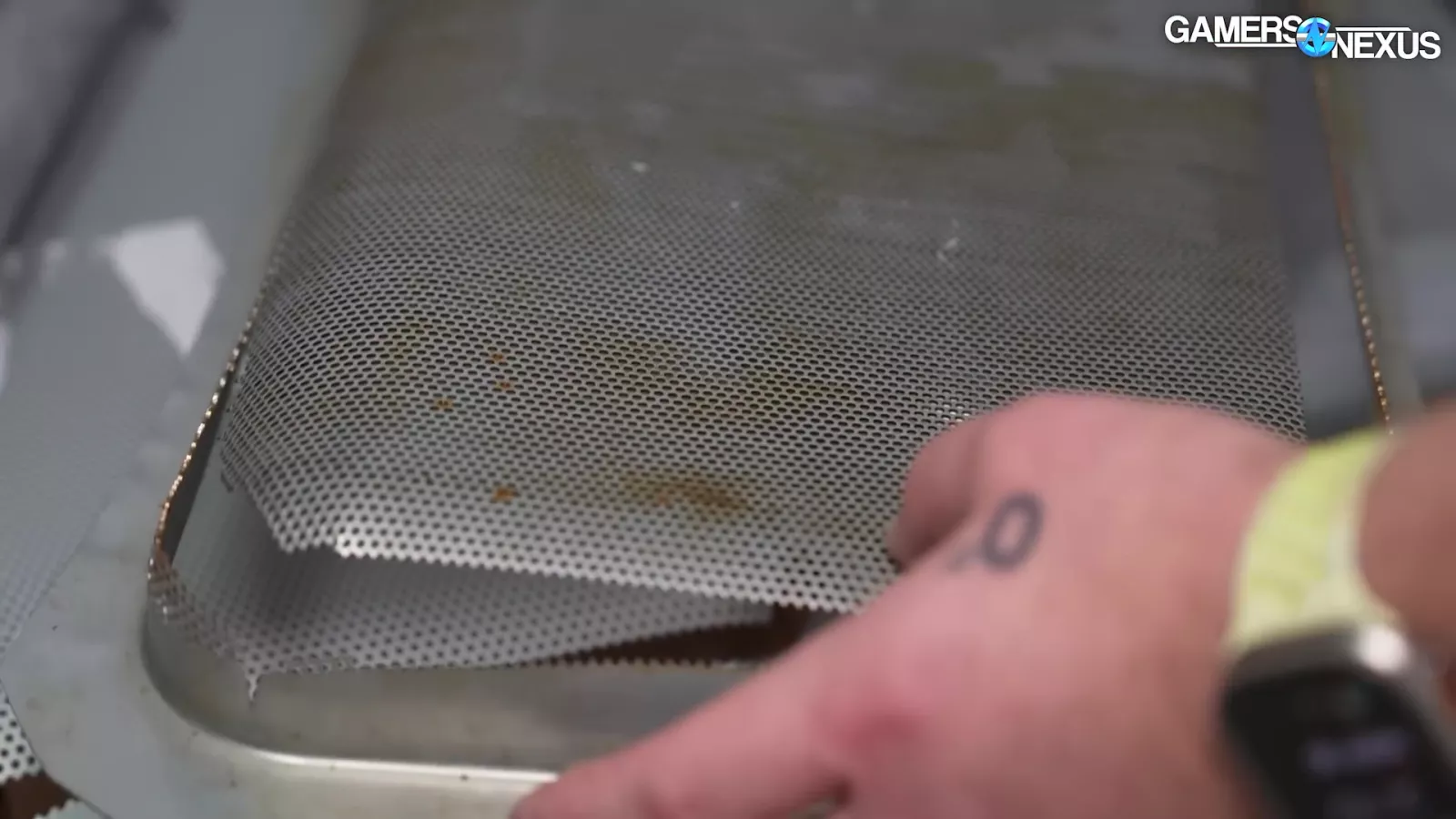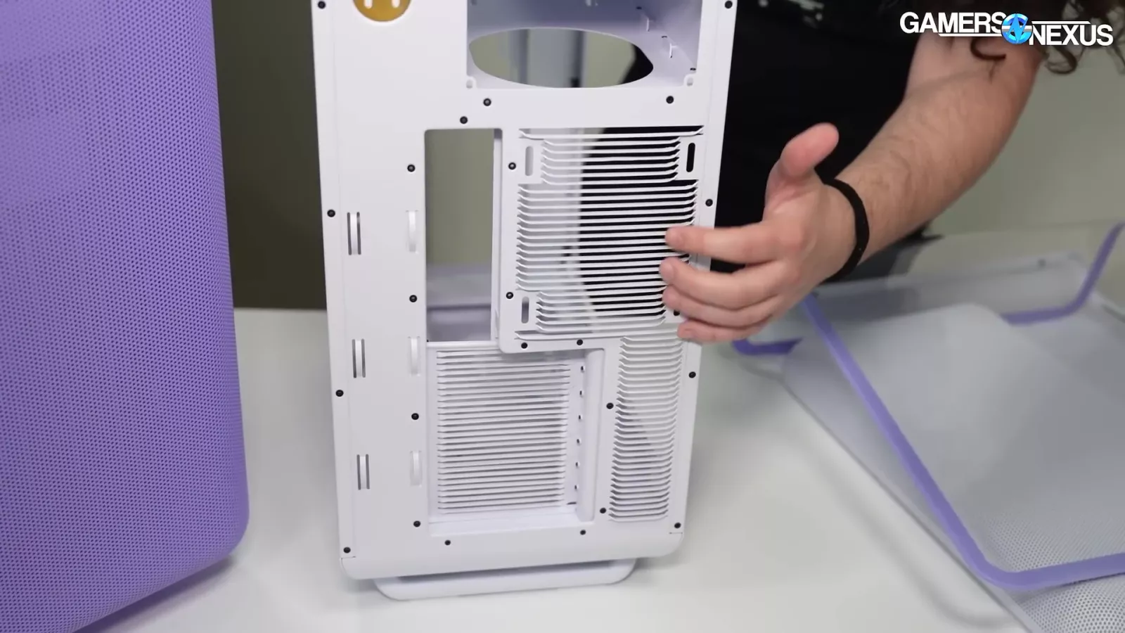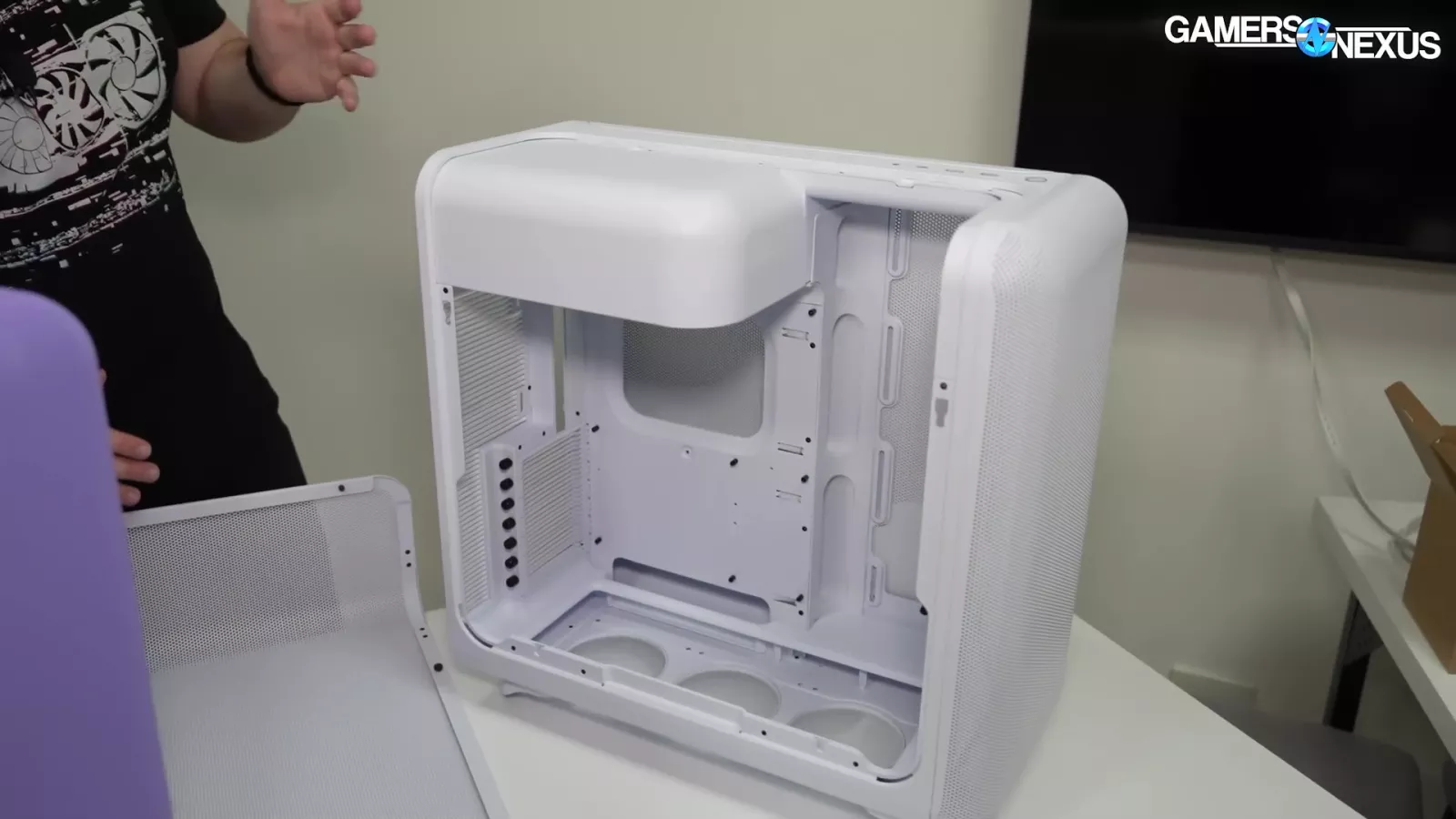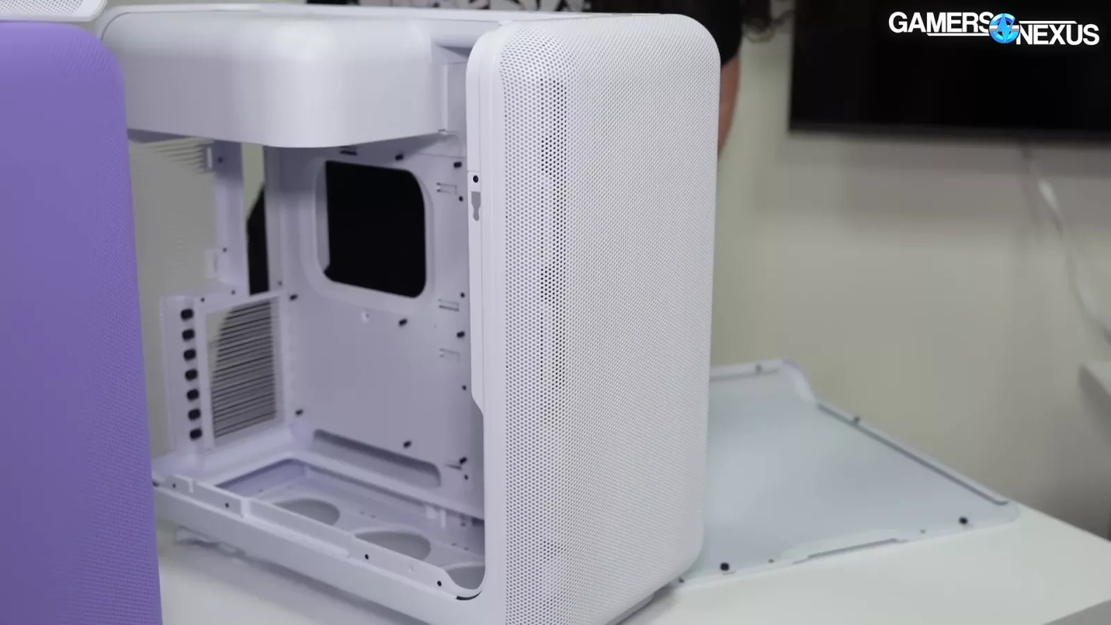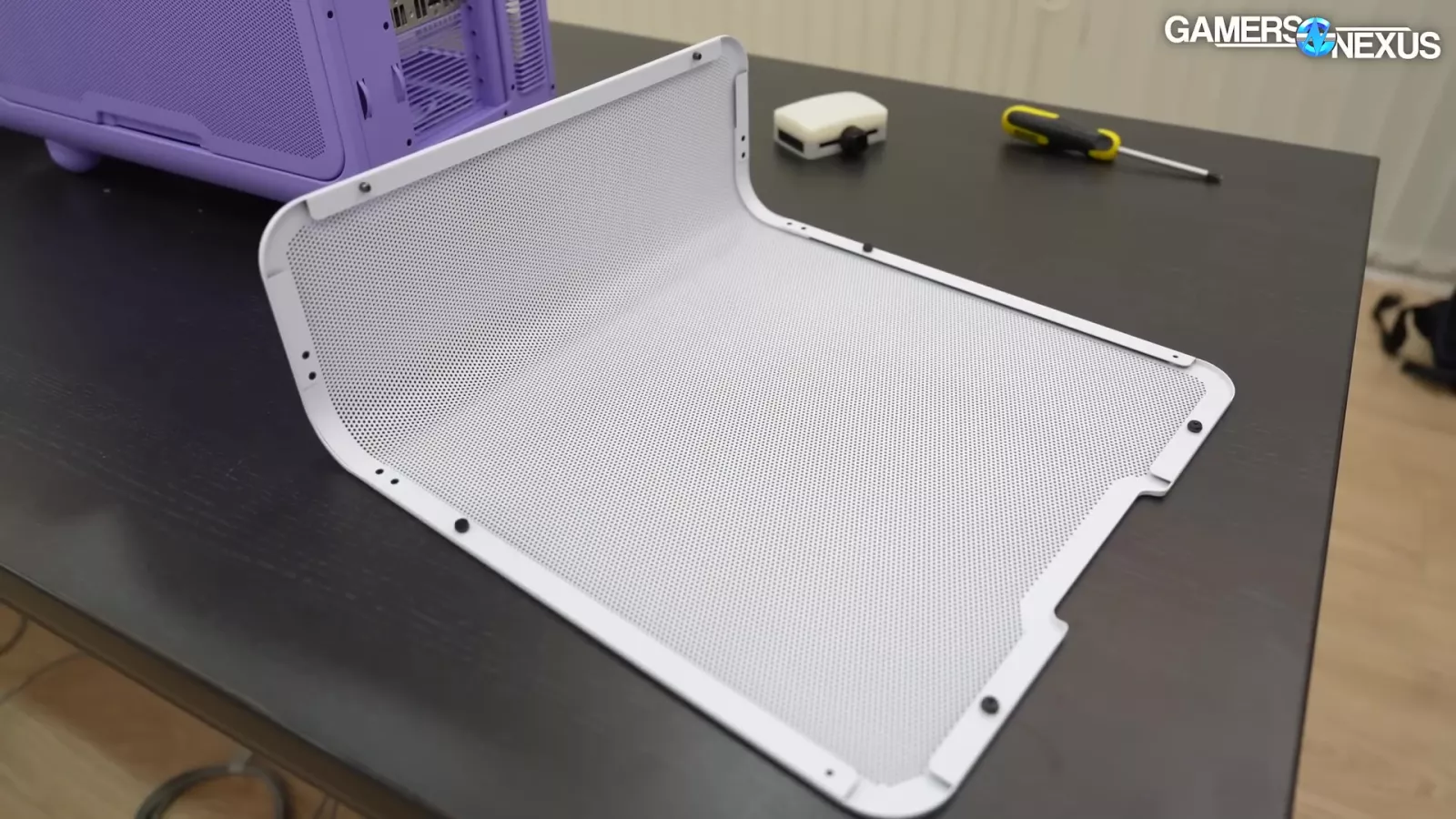 Another unit we looked at used lower porosity mesh on the edges, which is what the factory Hyte worked with said was the limit of what it could do. Hyte couldn’t accept this design, however, as they were targeting over 40% porosity. Teller says the X50’s final design ended up having about 45% porosity with 2mm holes and 3mm spacing.