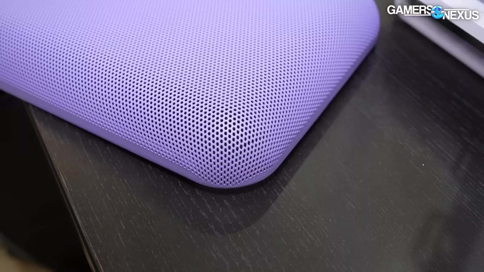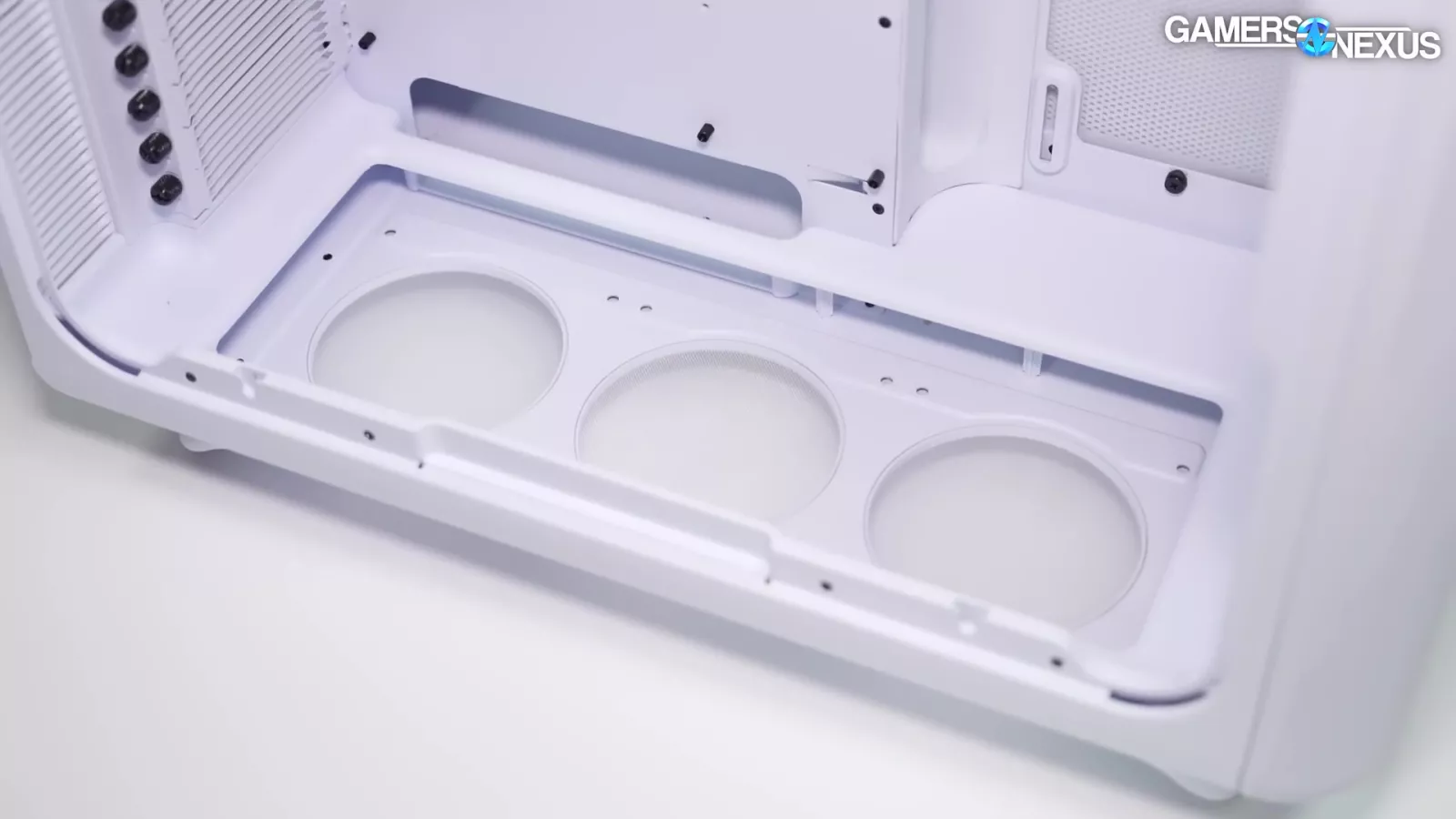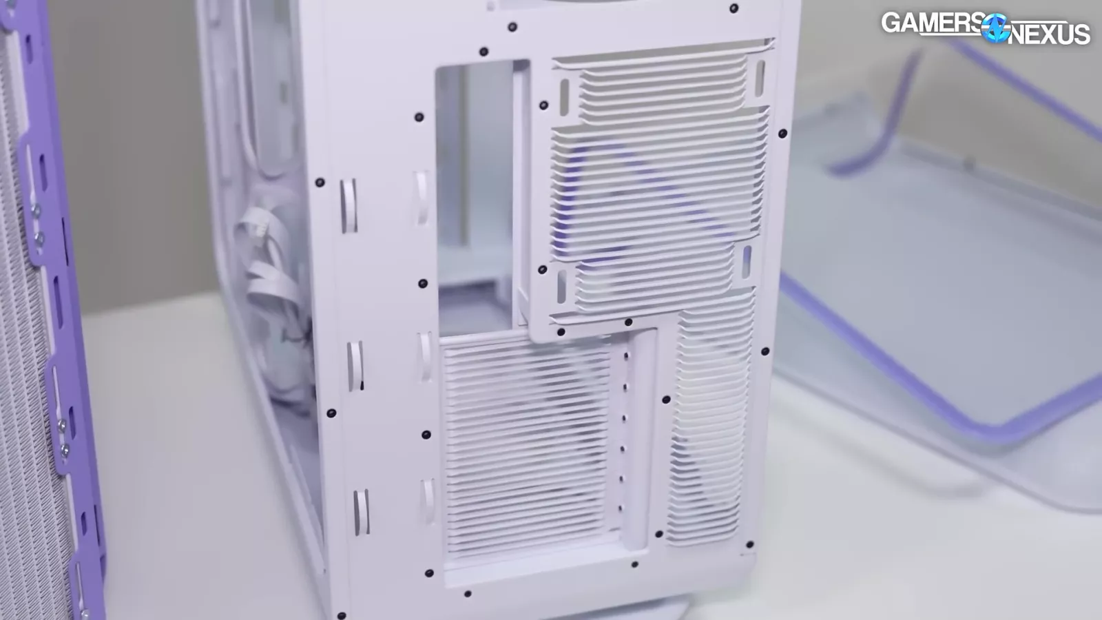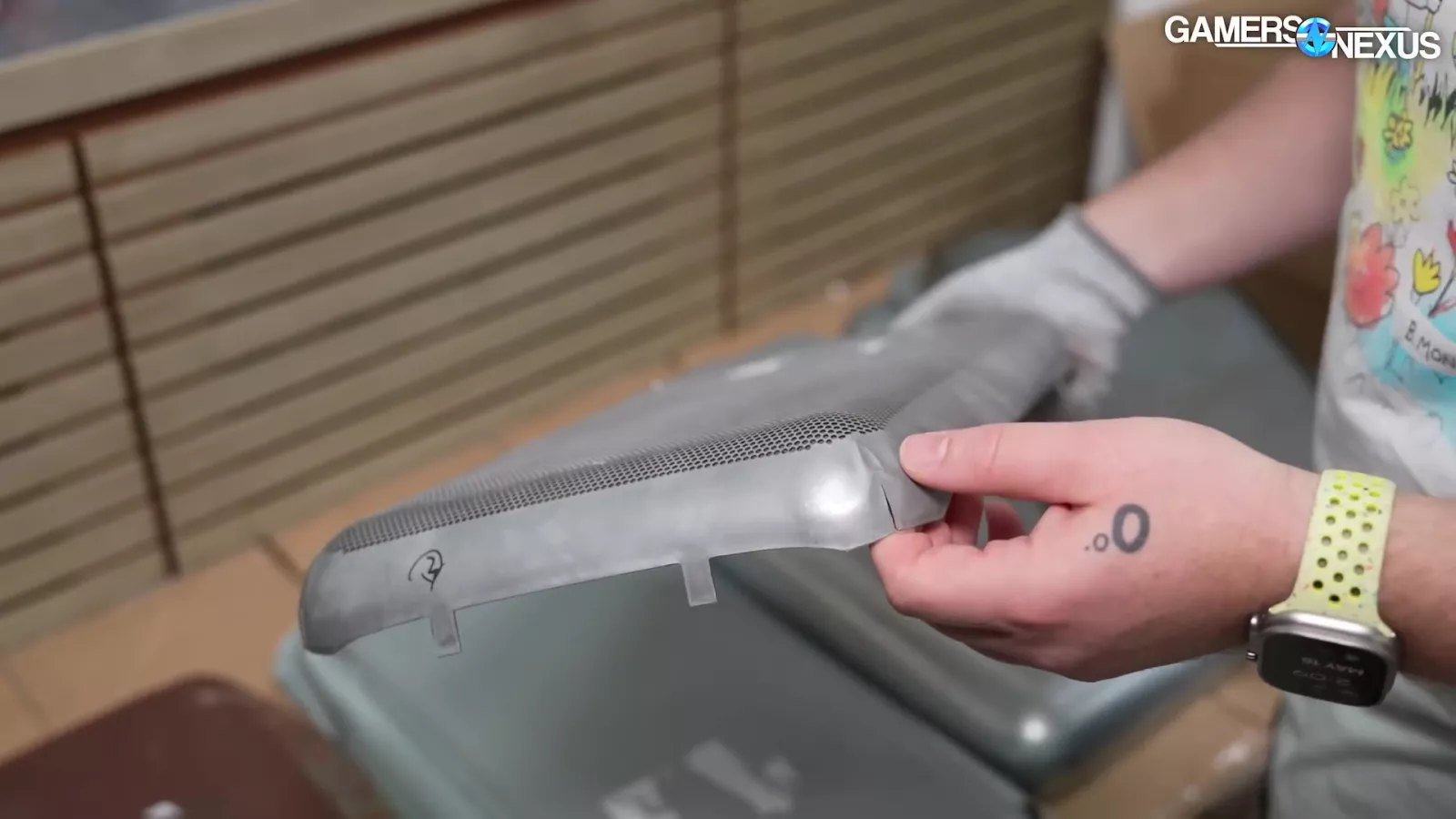 Another unit we looked at used lower porosity mesh on the edges, which is what the factory Hyte worked with said was the limit of what it could do. Hyte couldn’t accept this design, however, as they were targeting over 40% porosity. Teller says the X50’s final design ended up having about 45% porosity with 2mm holes and 3mm spacing.