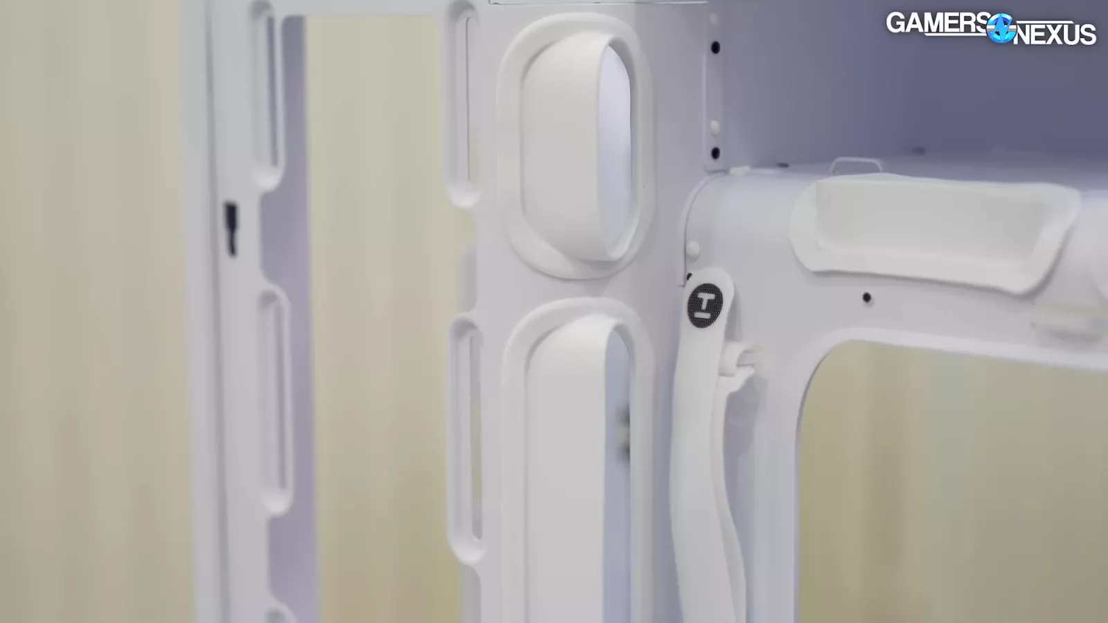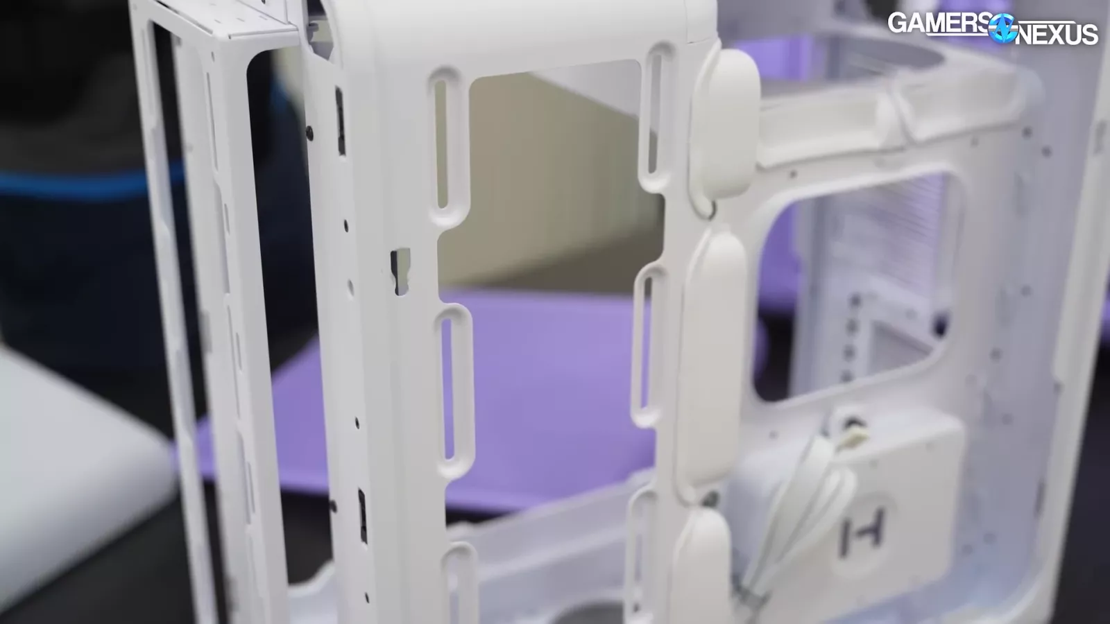 The horizontal louvered vents on the back are mostly straight, even though they may not look like it on camera. There were 2 reasons for its design here. Hyte tells us it was for structural reasons and flow. We often talk about impedance to flow into a case, but impedance to flow going out doesn’t come up as much. There were a few instances in which we have brought it up, like in the Lancool 207 (read our review), where it has a really restricted airflow in one of its panels. In theory, being able to help the air exit faster should help with thermal performance. Hyte is trying to make a thermal performance chart topper and we’ll see how it does in our testing.