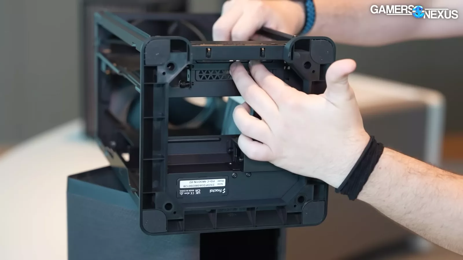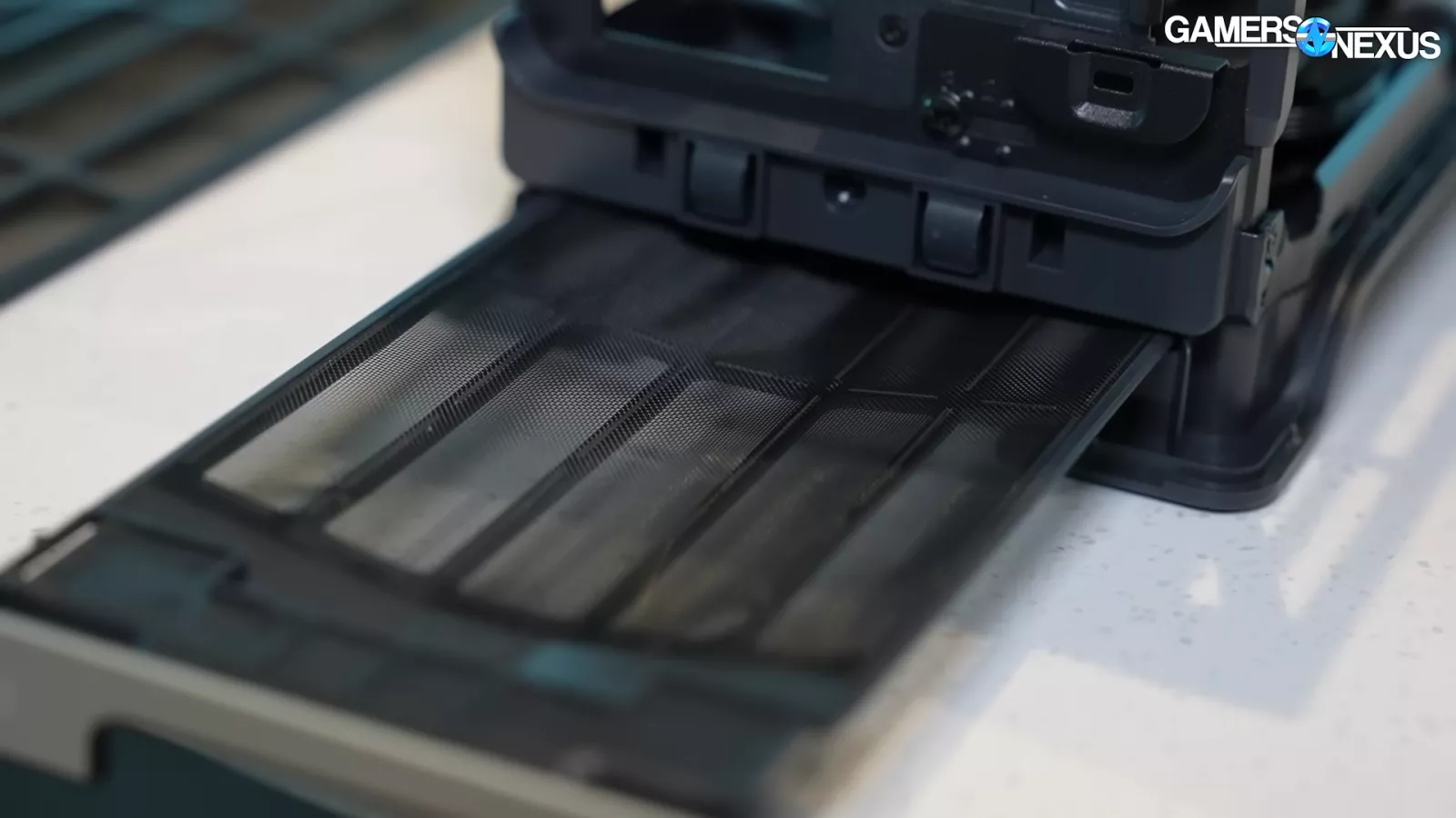 The bottom dust filter pulls double duty as the lock mechanism for the outer shell. Pulling the filter out slightly allows the exterior to pull up, similar to the Mood.