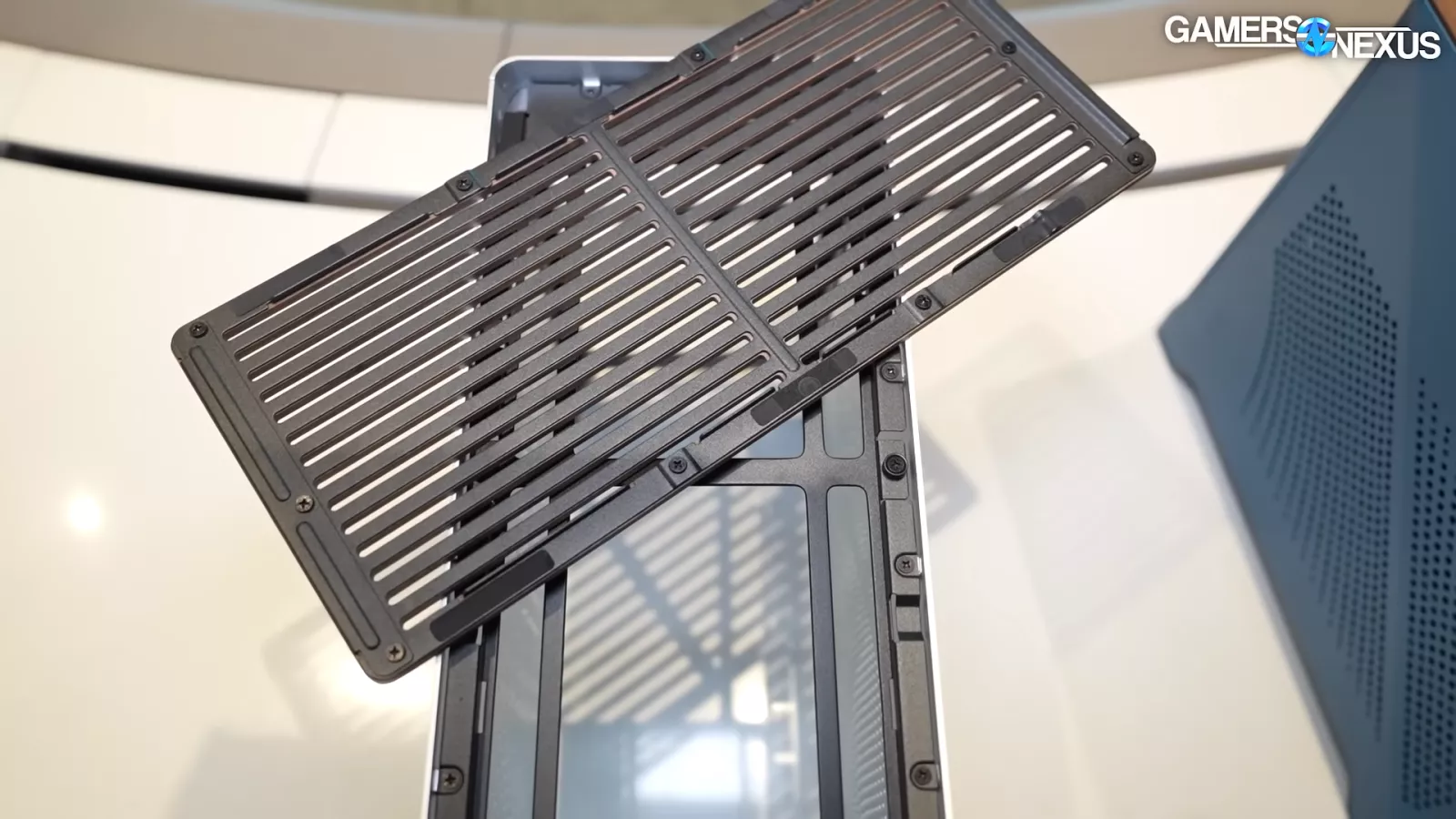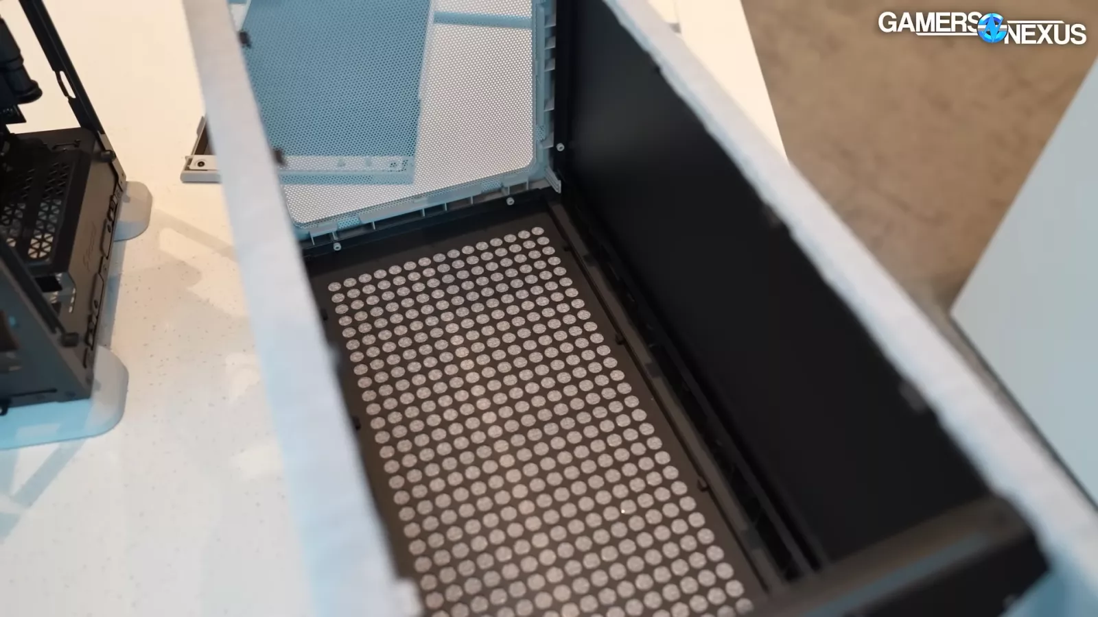 The bottom of the case has a chamfered dust filter coupled with 2 120mm intake fans.