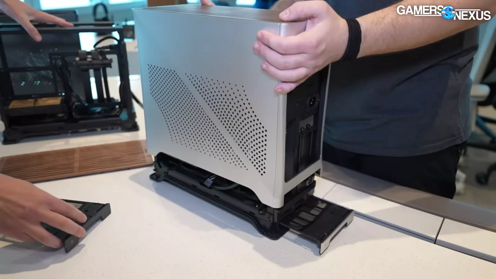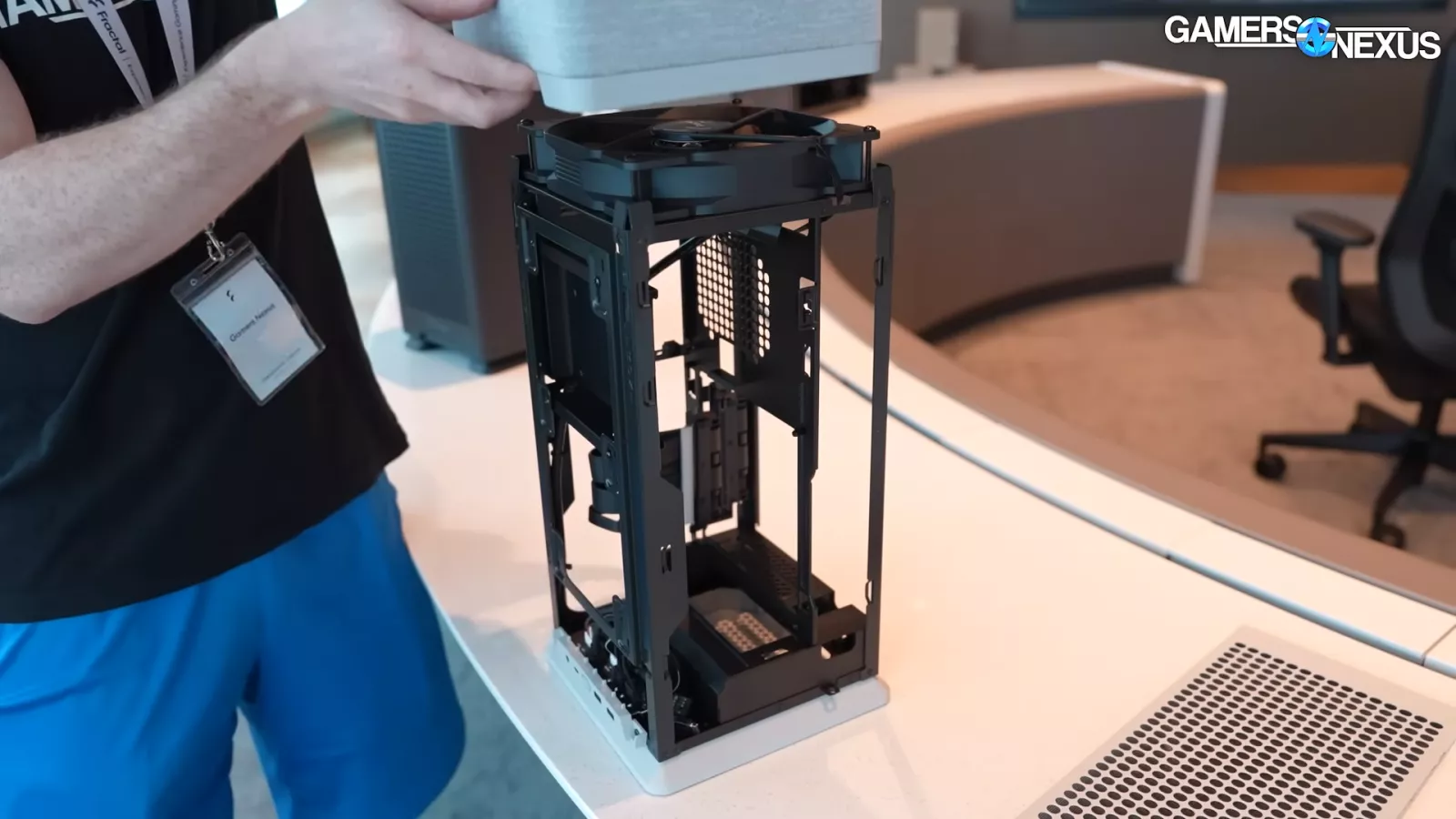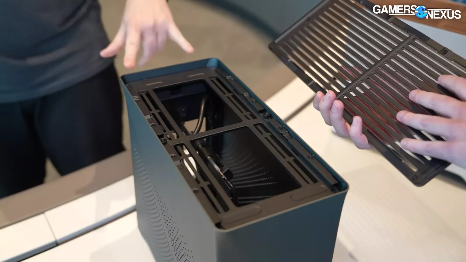 Inside, there isn’t a ton of space for the GPU but it has a PCIe gen 4 riser. There are also perforations within the case for the gpu that point to where the power supply fan would typically go.