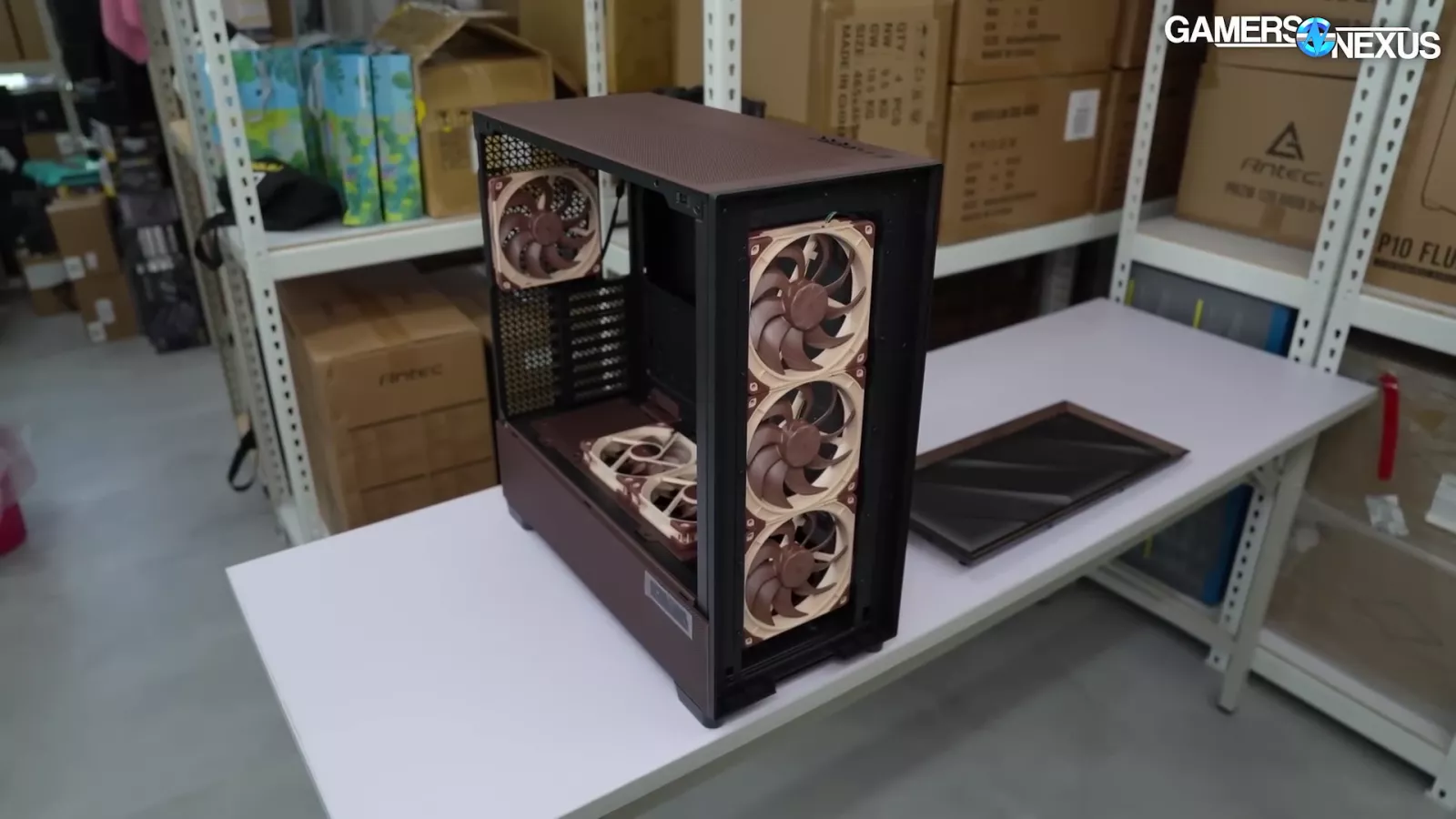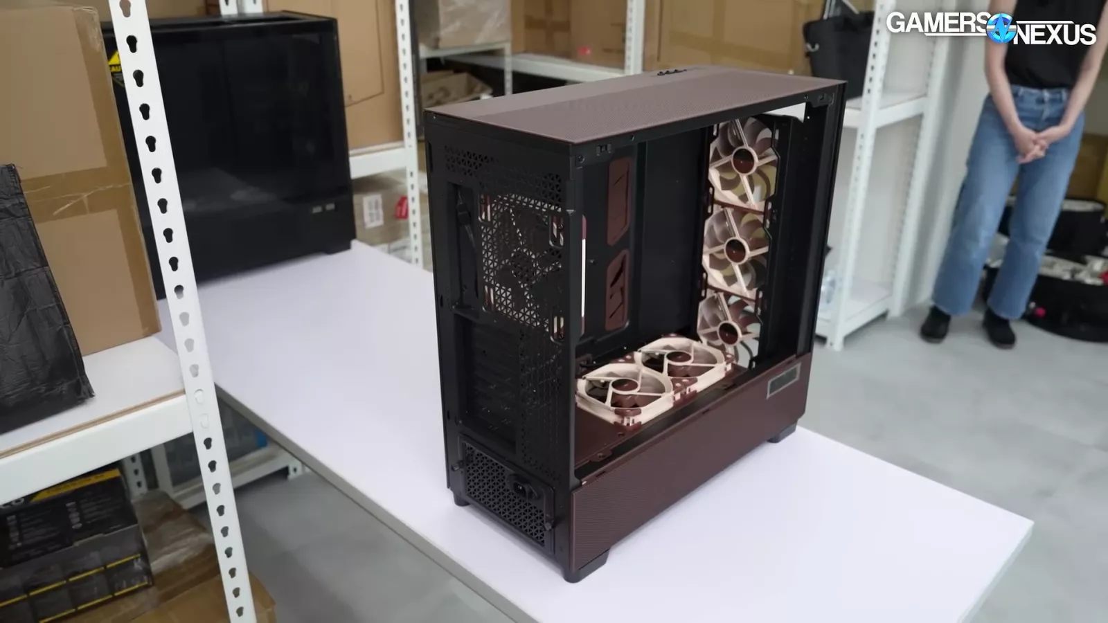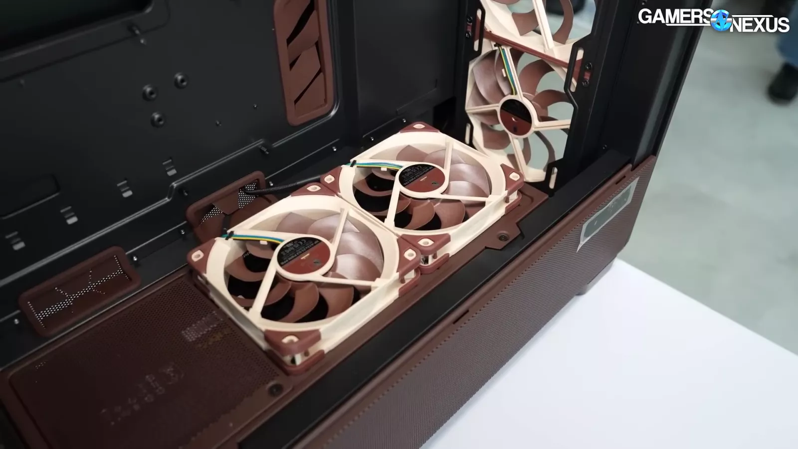 The case has a lot of aluminum in it. The model at Computex also came with Noctua fans, but they’re not brown. Specifically, the case featured Noctua’s black NF-A20s, which are fans we’ve reviewed and benchmarked. They did pretty well in our testing.