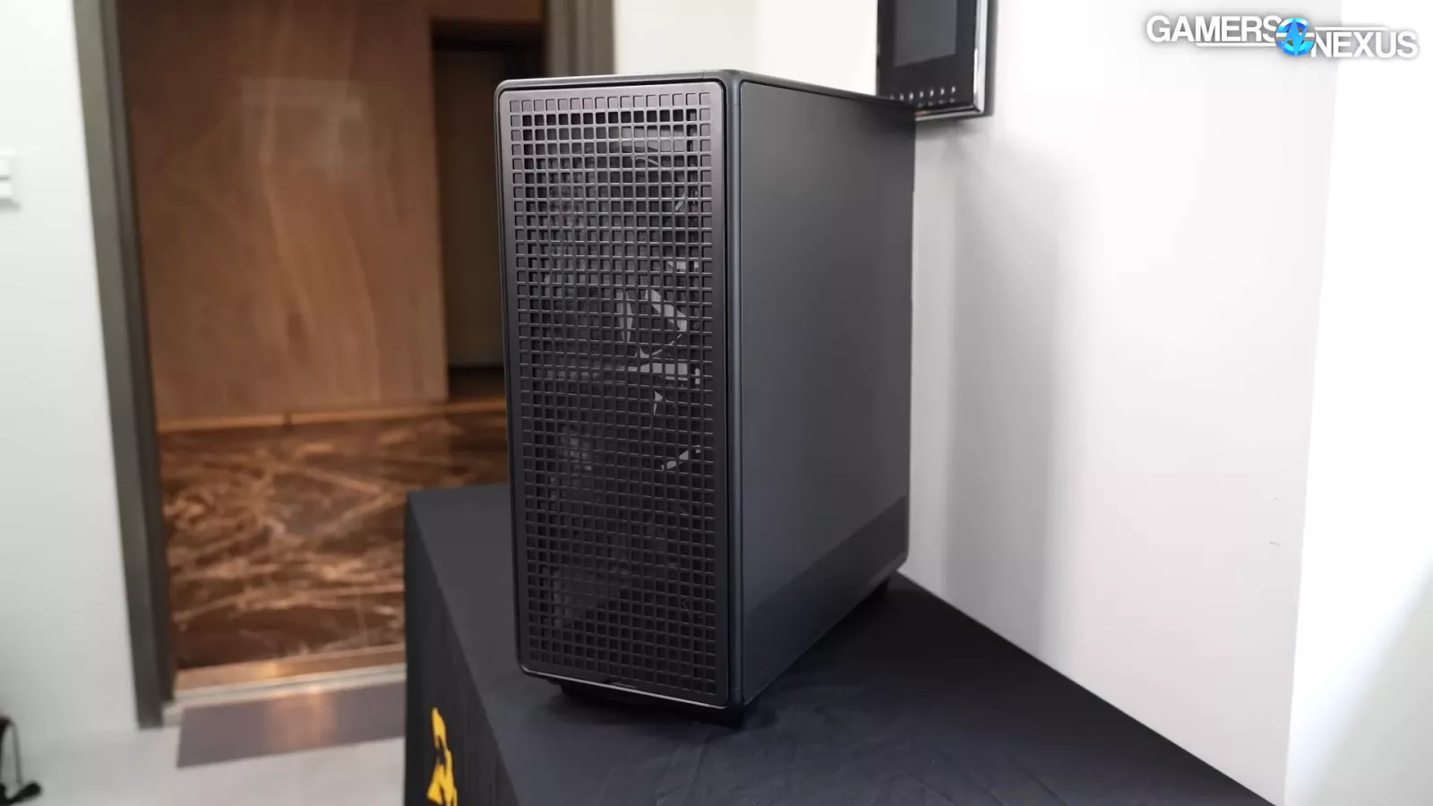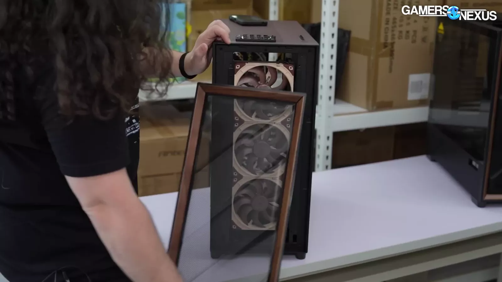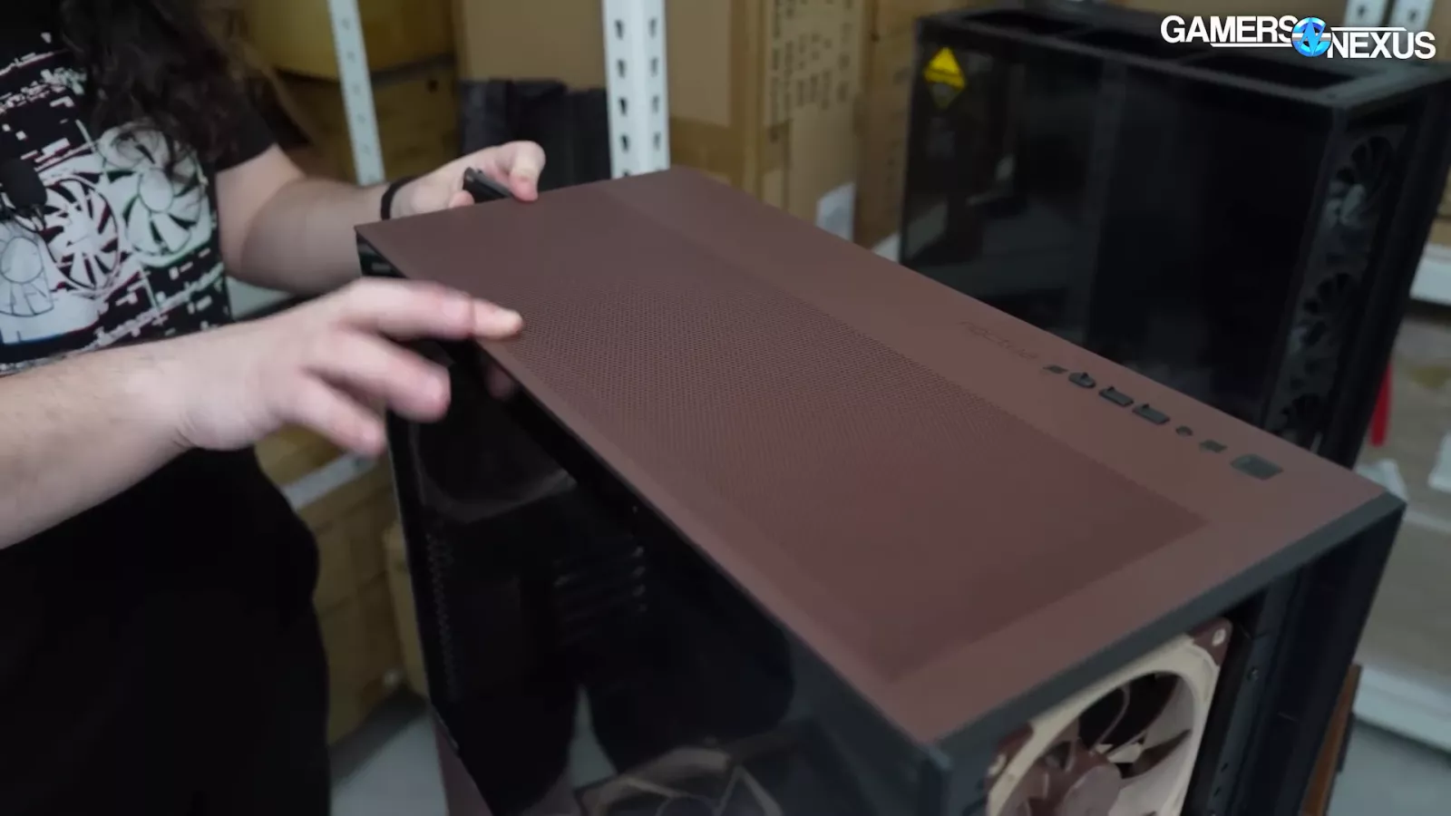 The case has a lot of aluminum in it. The model at Computex also came with Noctua fans, but they’re not brown. Specifically, the case featured Noctua’s black NF-A20s, which are fans we’ve reviewed and benchmarked. They did pretty well in our testing.