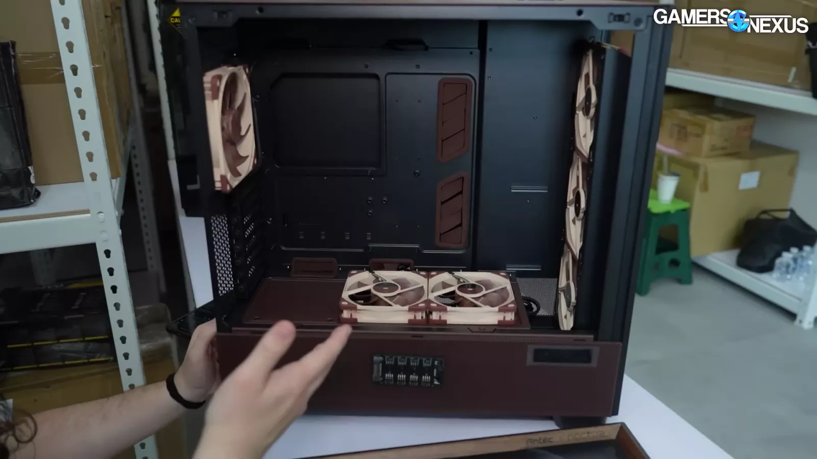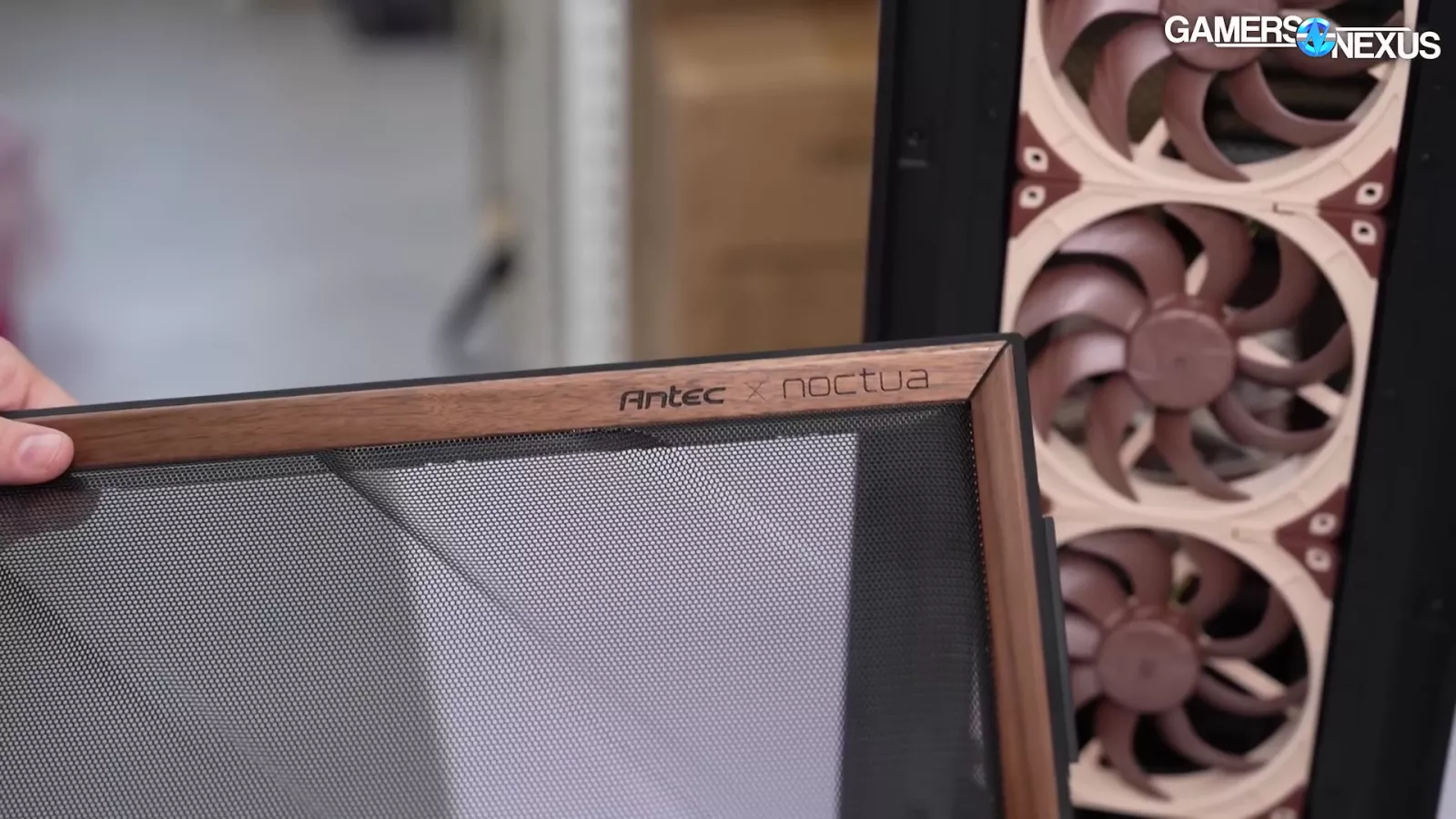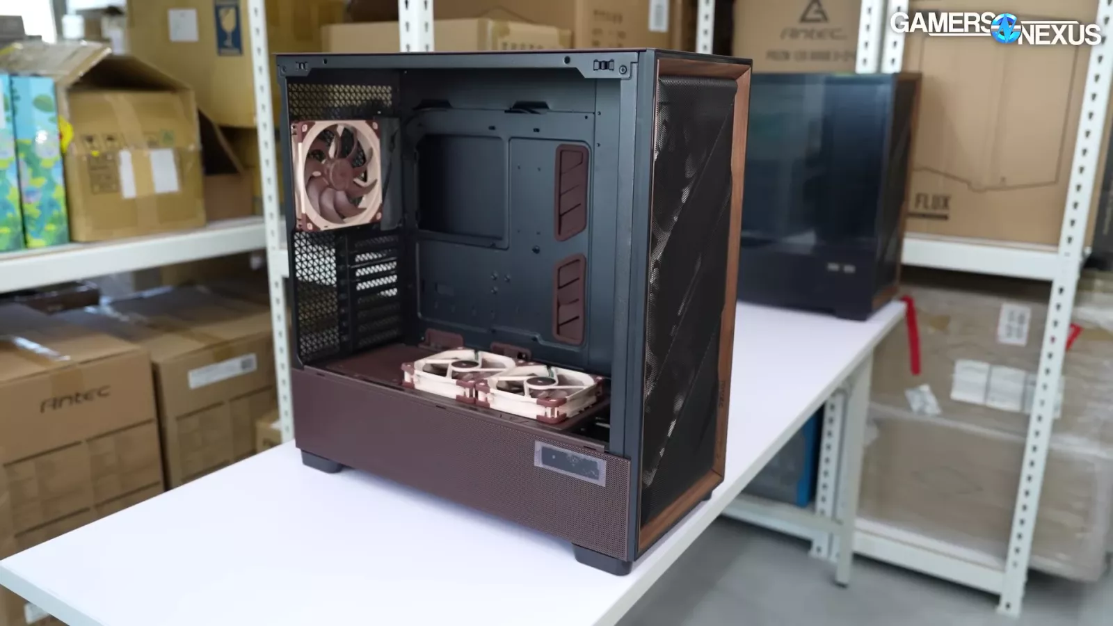 In terms of changes Antec has made, besides changing the fans, they’ve added the word Noctua to it. The panel covering is also different. Antec tells us that the steel brown paneling on the case was difficult to match with Noctua’s brown hue. In general, we’ve heard that color matching for manufacturing is apparently very hard. Pretty much every factory we’ve been to has told us this. Antec told us it spent over a month trying to get the correct brown to make Noctua happy with how the color came out. It sounds like everyone is happy with the end result.
