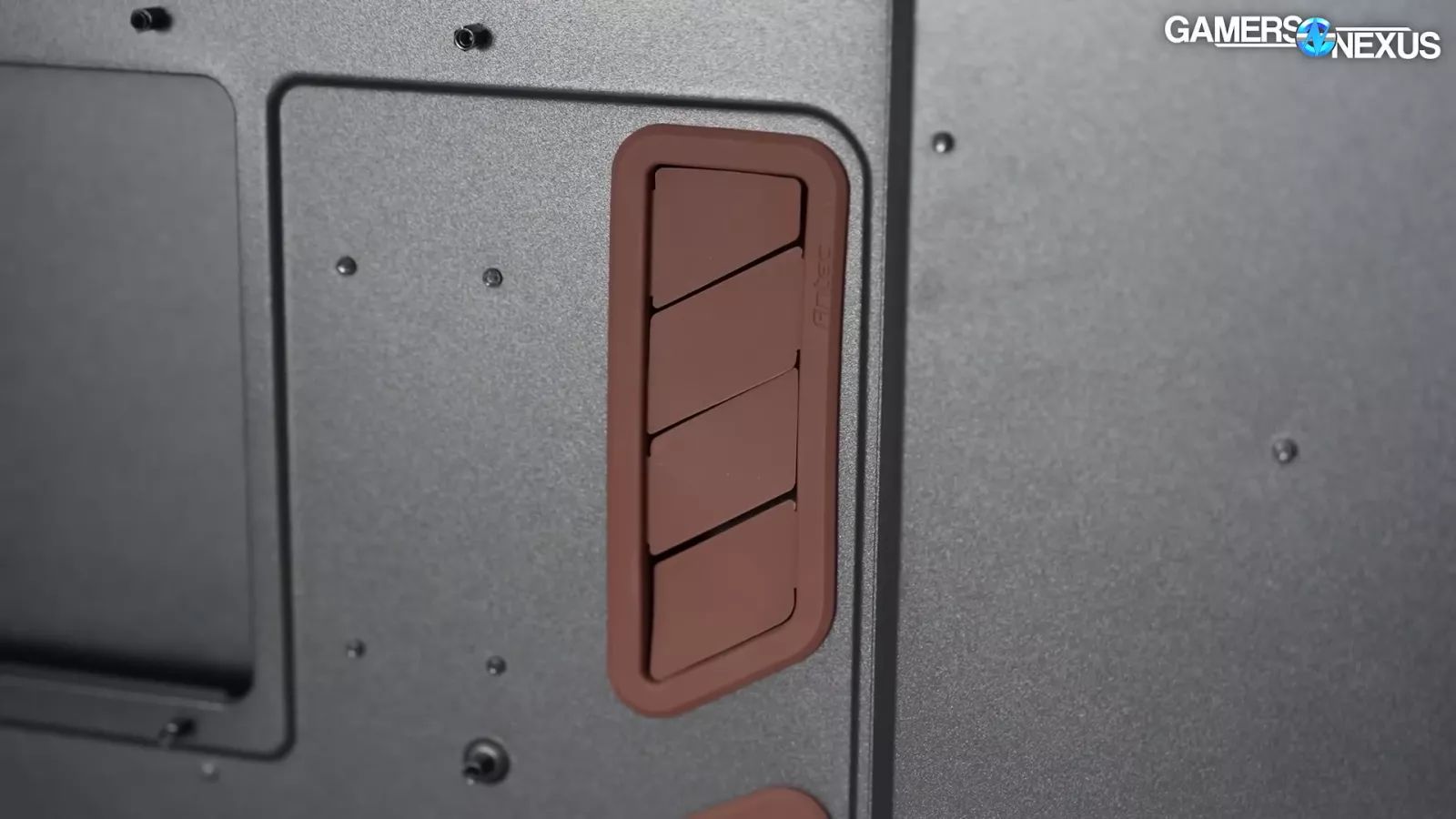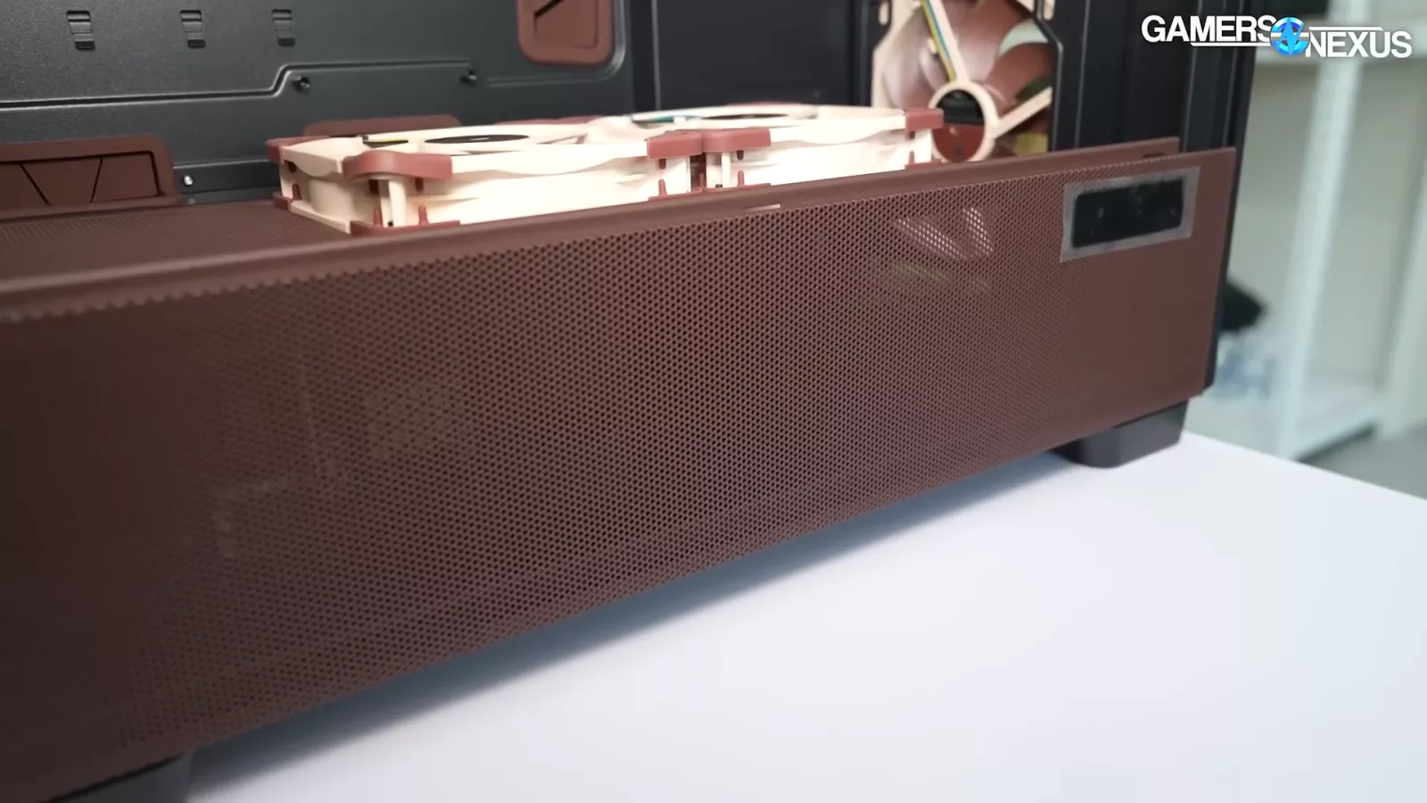 Internally, the brown rubber grommets were apparently more difficult than the steel panels to be the correct shade of brown. You can’t use the same mixture between the 2 materials. The top of the power supply shroud is another steel component that is also brown. They are removable mesh inserts, which we talked about in our review of the Flux Pro. Other than the fans and color difference, the tooling of the case is the same.