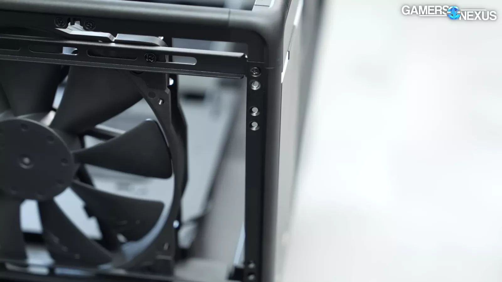 The case will have fan rails for its front fans. The fan rails can be offset to different locations via a couple screws. The case we saw was set up for 200mm fans but they can also be moved to accommodate 180mm, 140mm, and 120mm fans.