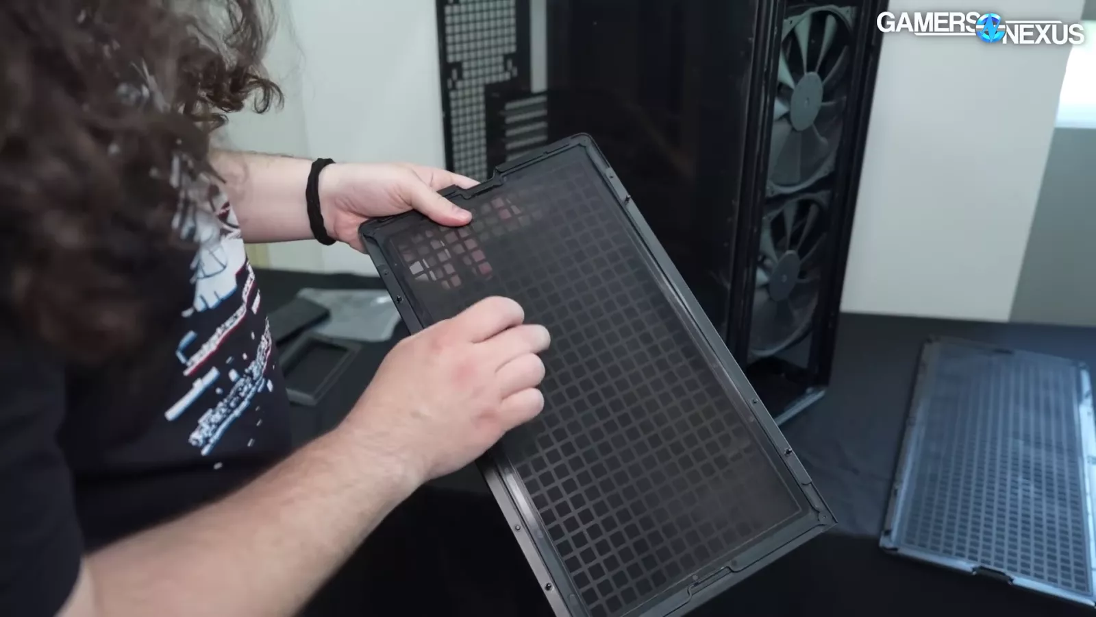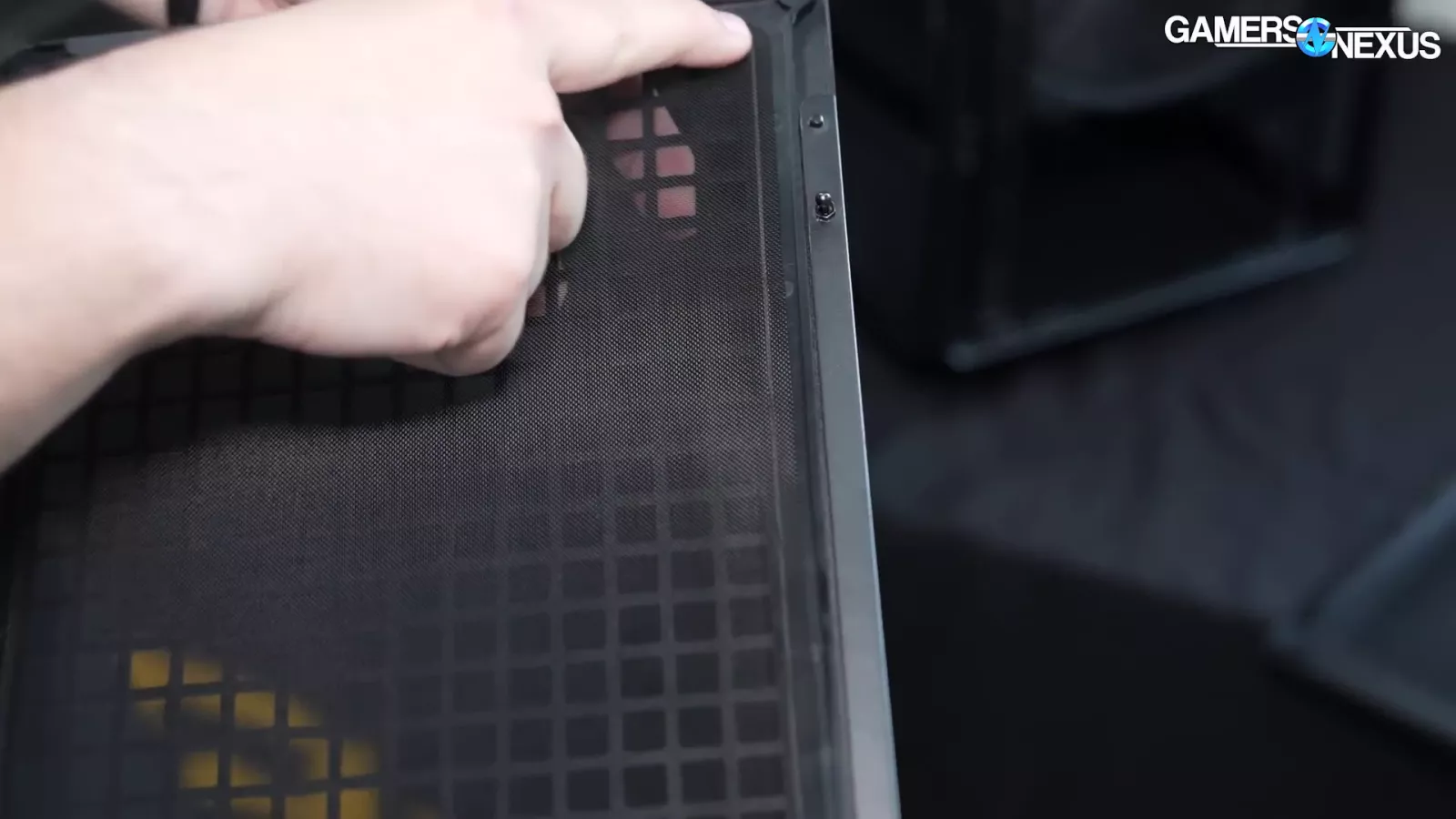 Looking at the top panel, it uses massive holes in its design coupled with a dust filter. In some ways, this is traditional. The upside is that the actual panel itself isn’t doing a whole lot other than just providing the structure, which means it’s not really getting in the way of airflow because of how huge the holes are. It’s really going to come down to the dust filter for how much air can get through. If you’re going to use the top panel for exhaust, we would recommend pulling the dust filter off because it’s not stopping a whole lot of dust.