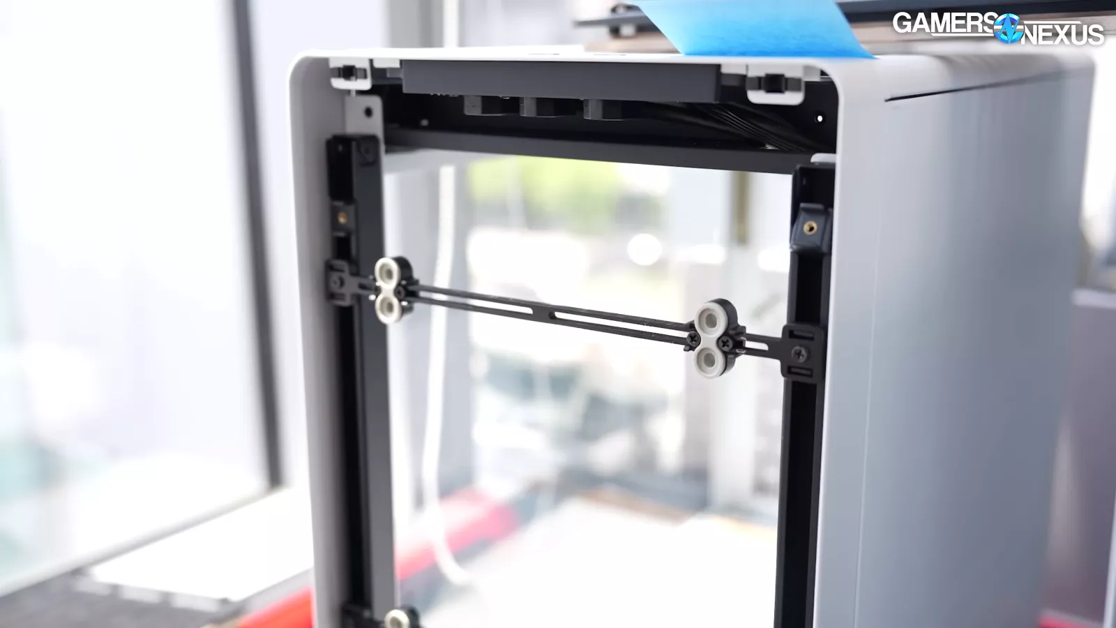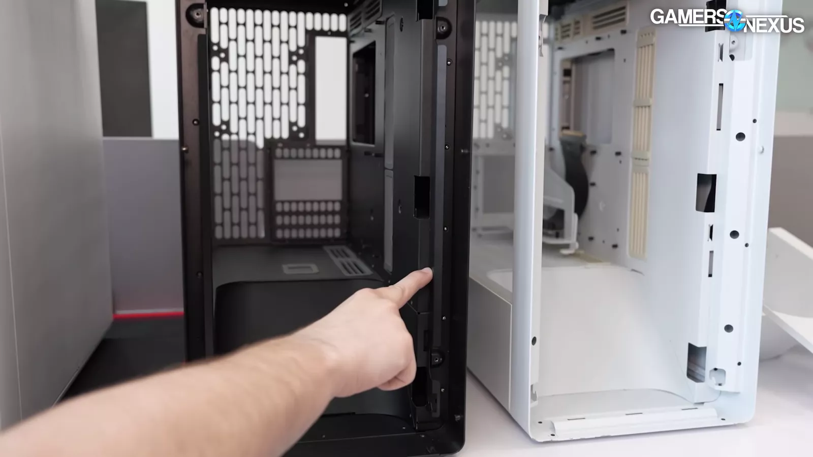 Taking a look at the first mock-up of the case, we can see some rails for the front fans. This design did not progress into the final. It uses a rail system and we’ve seen it in other cases. Corsair has implemented it and has a trademark for it which they call the “InfiniRail.”