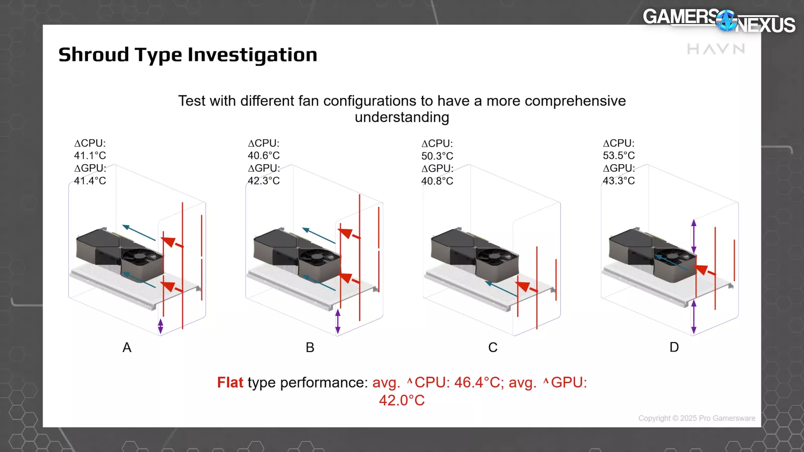 In their next test slide, HAVN tested various fan configurations with the flat shroud. The results were mostly as expected: CPU performance is hurt drastically by having only a bottom intake fan, to no surprise.