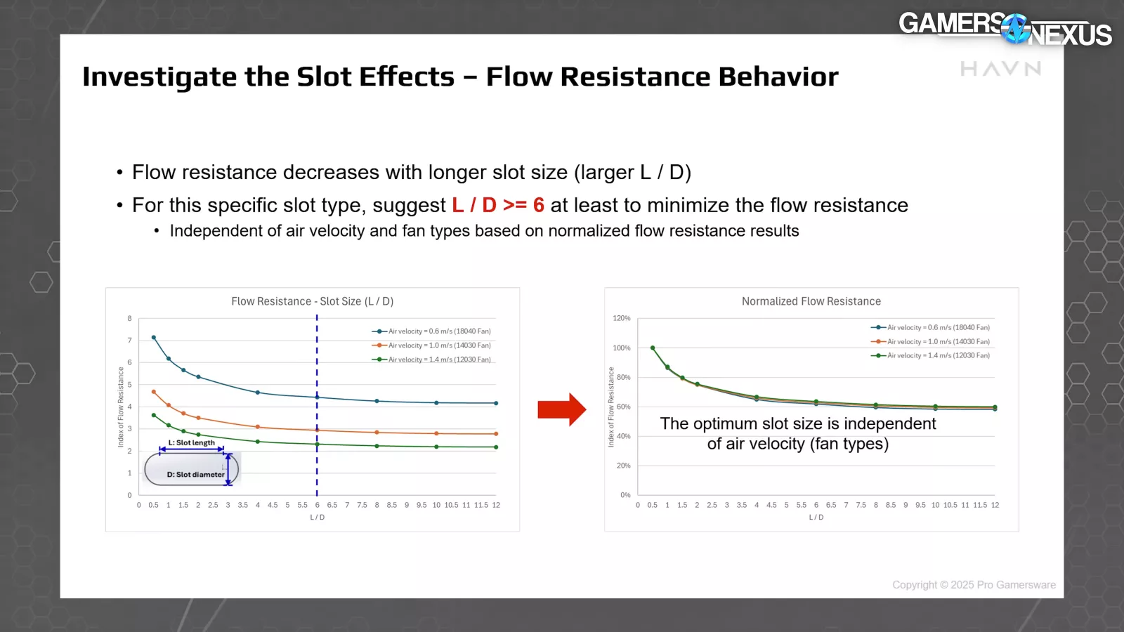 HAVN began studying its slot spacing and porosity of the ventilation slots in the panels next. The company found that a ratio of length divided by depth being ideally about equal to 6 was optimal for minimizing flow resistance, with the only downside being potential structural challenges. These charts show their flow performance with different slot sizes.