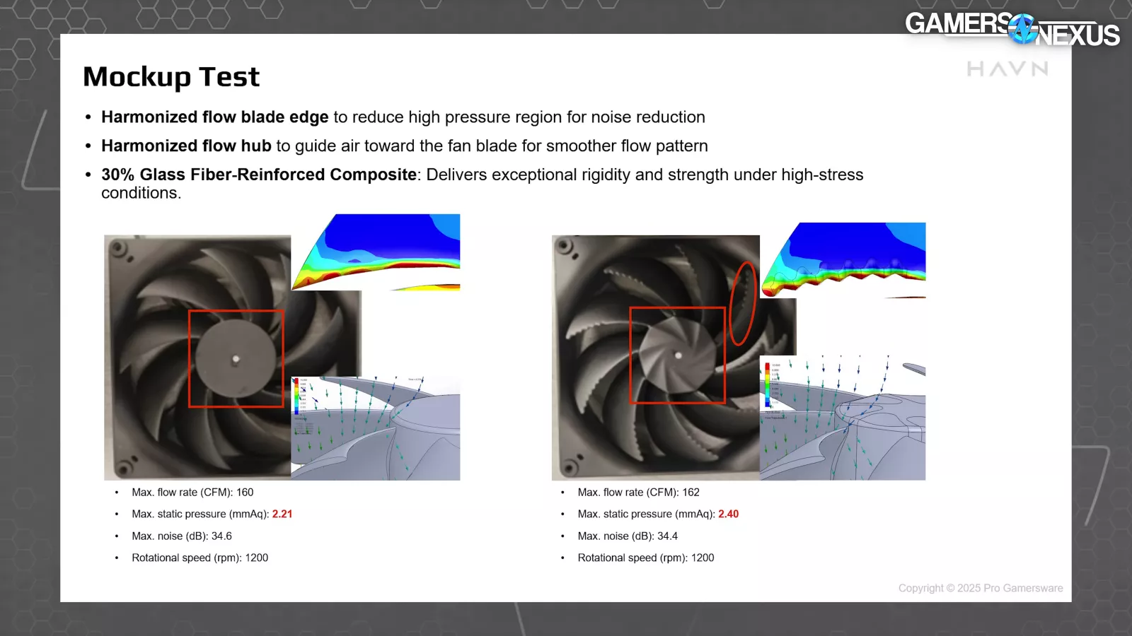 By shaping the fan hub itself to guide flow, HAVN claims that it can better maintain pressure across the hub of the fan and along the inner wall of the blades. This is the area of worst performance in every fan, so optimizing here can also help minimize dead zones behind the hub. HAVN says that the molded flow guide in the hub benefited its noise significantly. The company claims its flow rate also improved significantly for the guided hub.