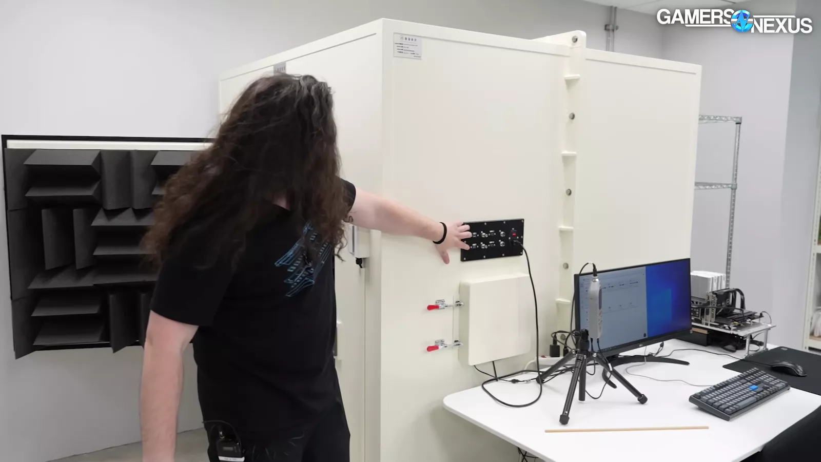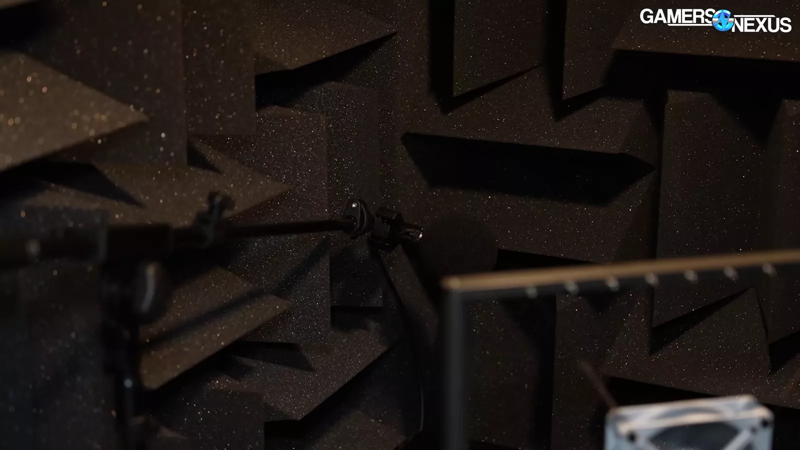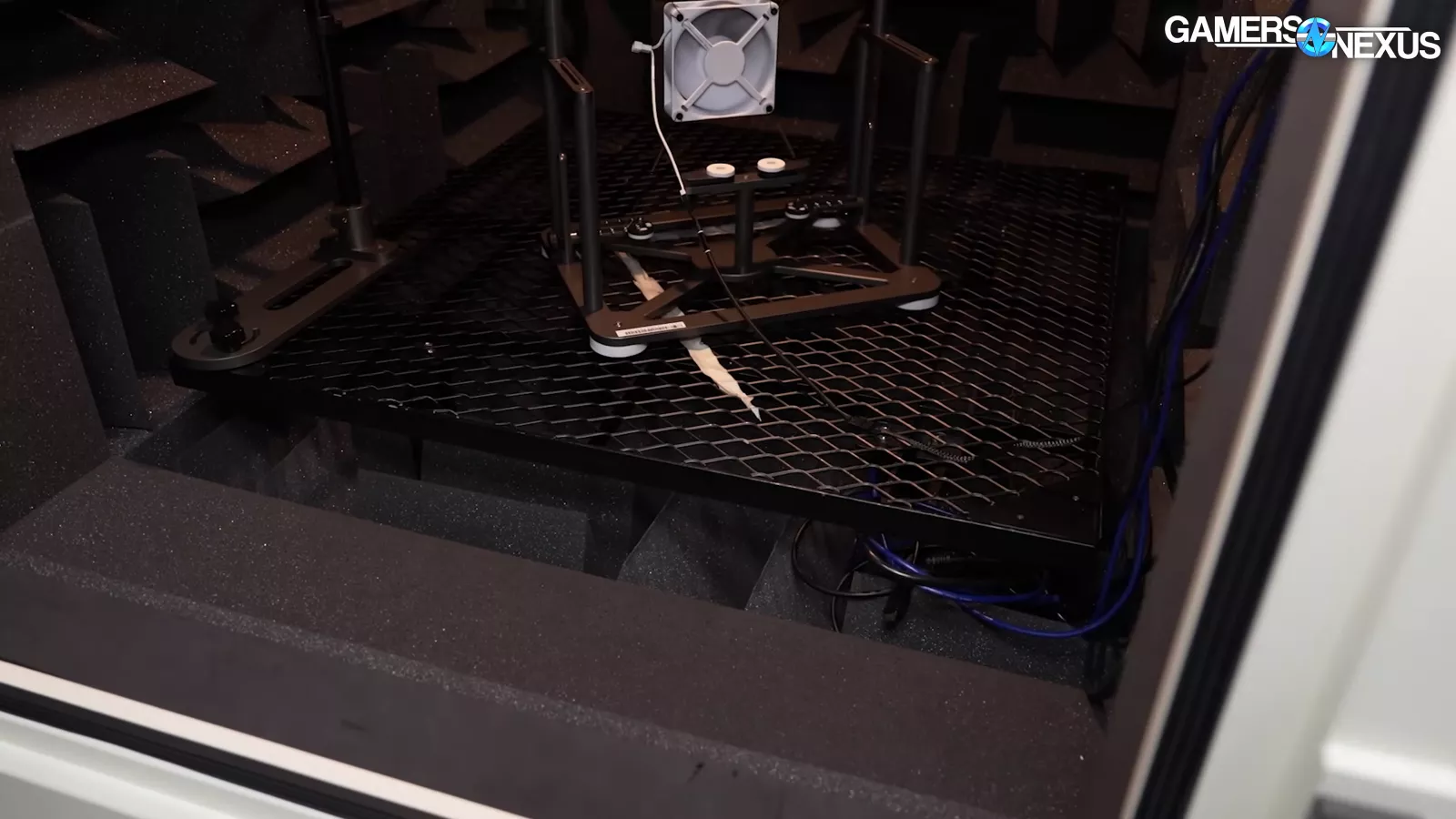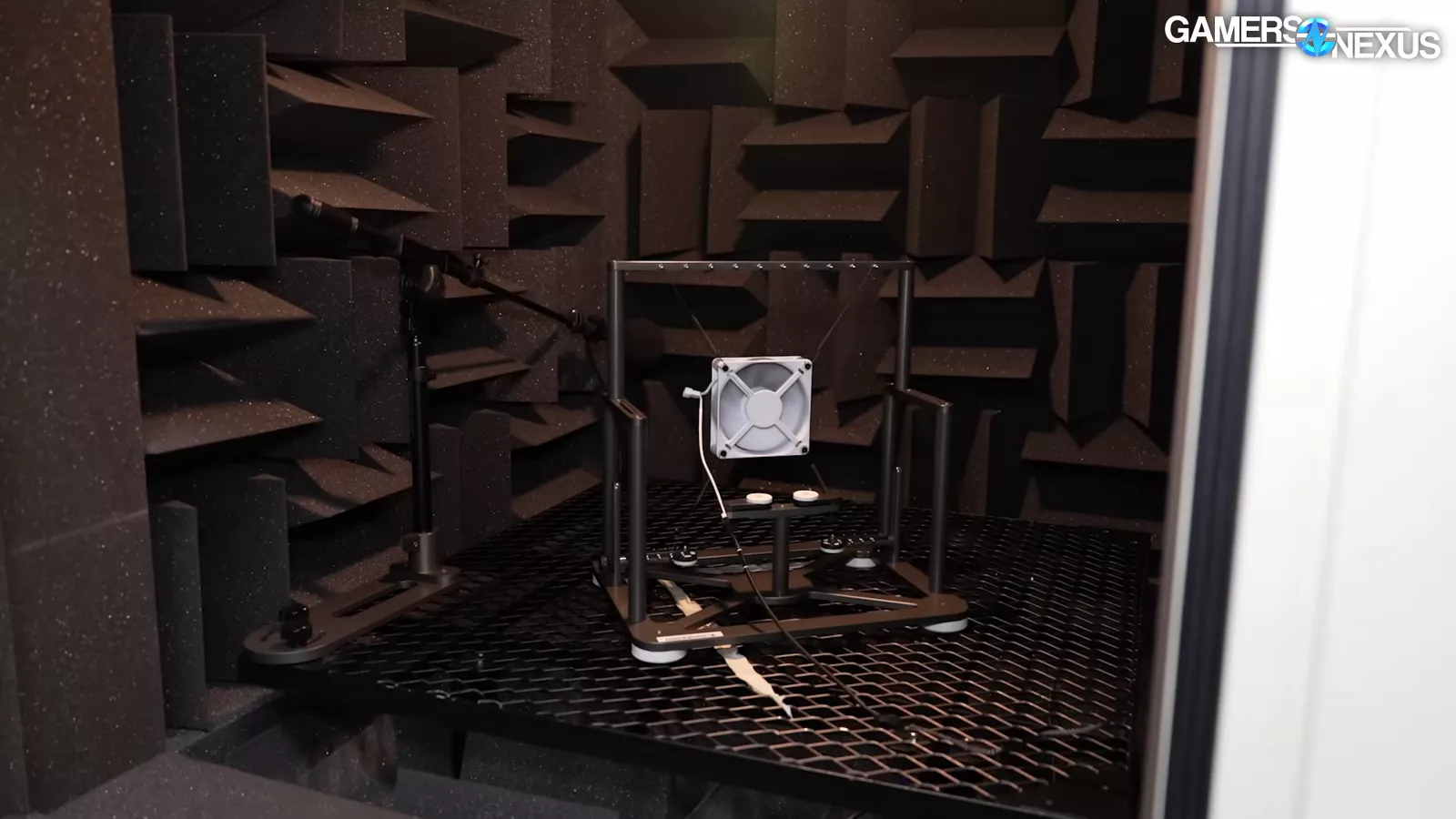 HAVN also has an acoustic chamber, which has a pass-through on the outside coupled with a noise meter, which collects noise levels. One thing we liked seeing once we looked inside the chamber is that we saw a mechanical rigging for the fan, which allows it to be free flowing. They put their microphone in the corner, which we used to do when we had a chamber of a similar size. Putting the mic here allows you to maximize the distance of the chamber by going diagonal, providing maybe a half a meter of space. They also have a foam floor as well, which makes it closer to an anechoic chamber as opposed to something like our hemi-anechoic chamber.