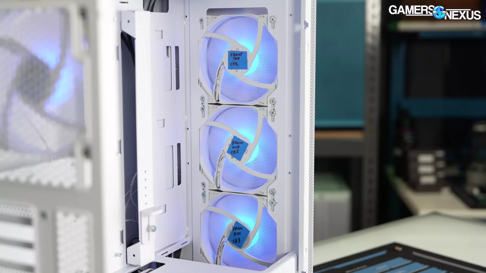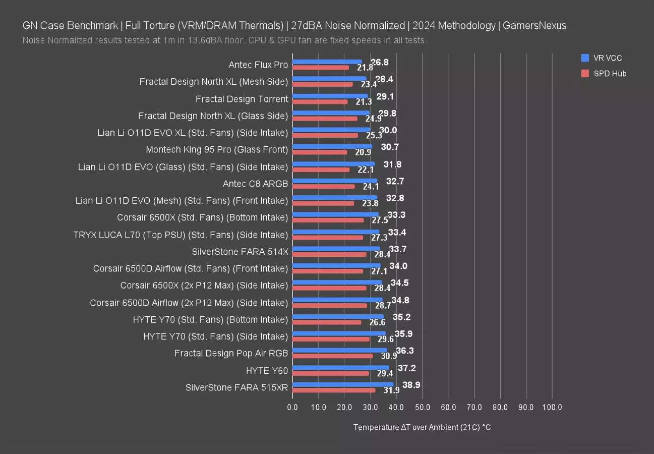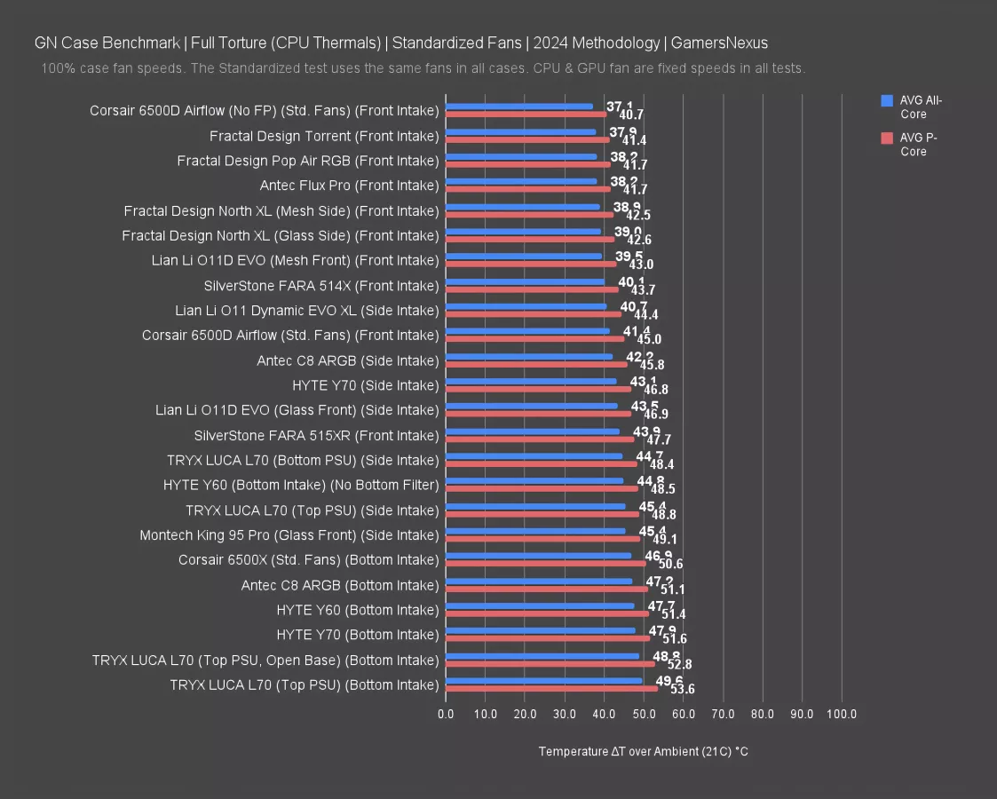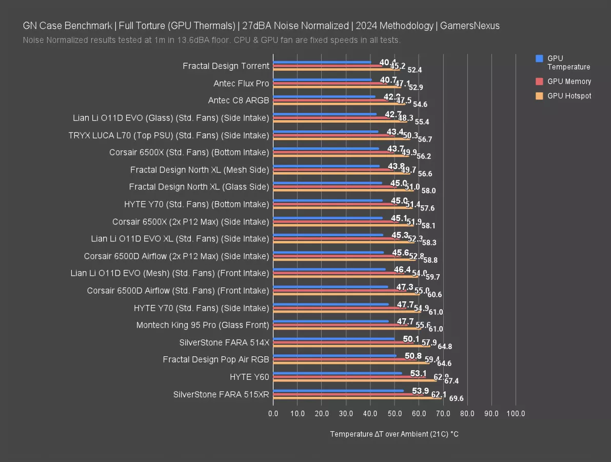 Our standardized fan test replaces all stock fans in each case with the same set of three Noctua fans: two 140mm intake, one 120mm exhaust. We have explained why there are limitations to this testing, such as worsening performance of cases which include more or larger fans. However, we run this test due to popular demand from the audience. You can find our methodology and limitations of this testing linked here.