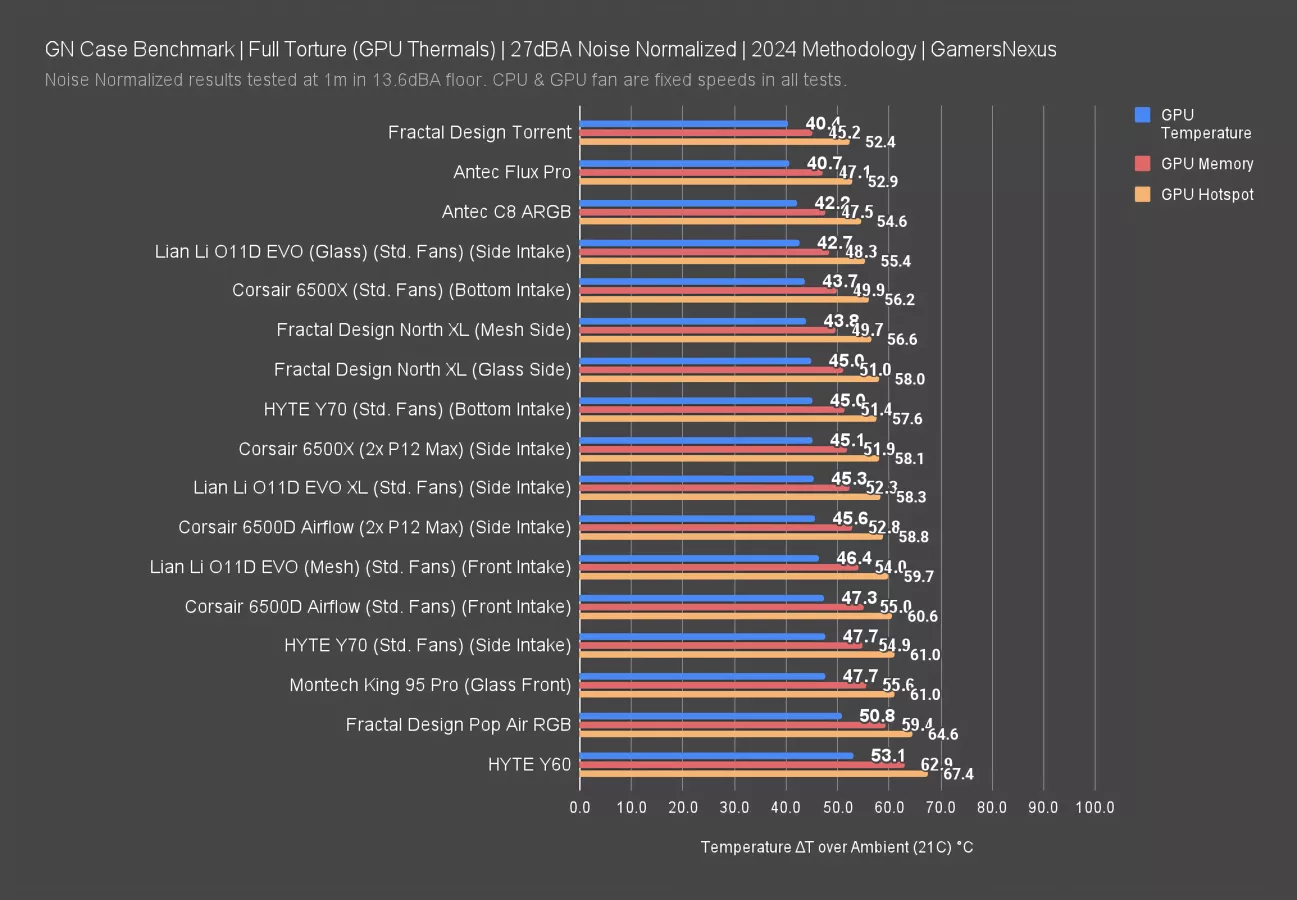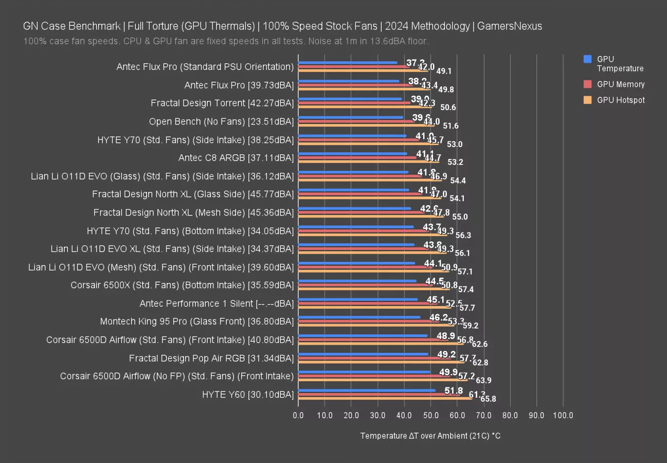 Moving back to the noise-normalized results at 27dBA, the GPU averaged 41 degrees Celsius above ambient, with 53 hotspot and 47 memory. We haven't always had the best results with shroud-top fans; looking back at our old test bench and prior reviews, in the Lancool 215, adding a fan on the shroud was ineffective. The Flux Pro overcomes this by just adding fans until the problem goes away.