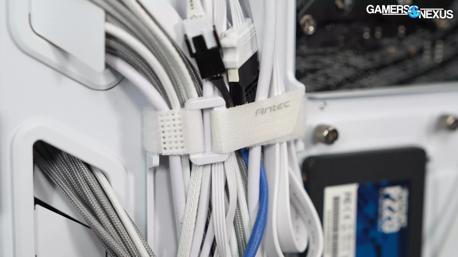 All plastic and rubber pieces like the PSU supports, drive vibration dampers, velcro straps, I/O cables, USB ports, and even the fan/RGB hub are white, while hardware and written labels are silver. There are a few downsides: the white SKU is $5 more expensive, it makes grime and leftover plastic mold release visible, the color matching isn't always perfect (like on the iShift extension cable), and the silver labels are hard to read at certain angles. Despite that, we think it looks good.