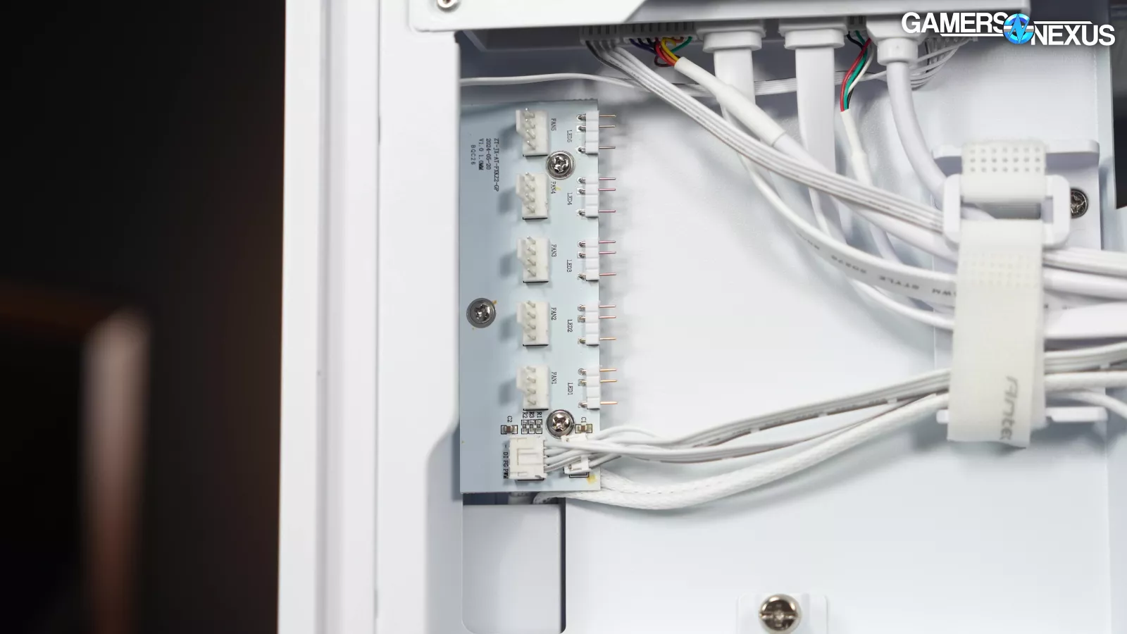 The Flux Pro also comes with a hub. We don't use built-in fan hubs or controllers during thermal testing, but even so, it's strange that the Flux Pro's hub only has five connections available when the case comes with six fans. Five of the stock fans are neatly cable managed and attached to the hub out-of-the-box, but the rear exhaust fan is not. This could be a relic of the original FLUX platform being designed around five fans. The hub is SATA powered and acts as a simple splitter for four-pin PWM fans and three-pin ARGB signals, with five outputs each. The Flux Pro does not contain any LEDs (RGB or otherwise) outside of the temperature monitor.