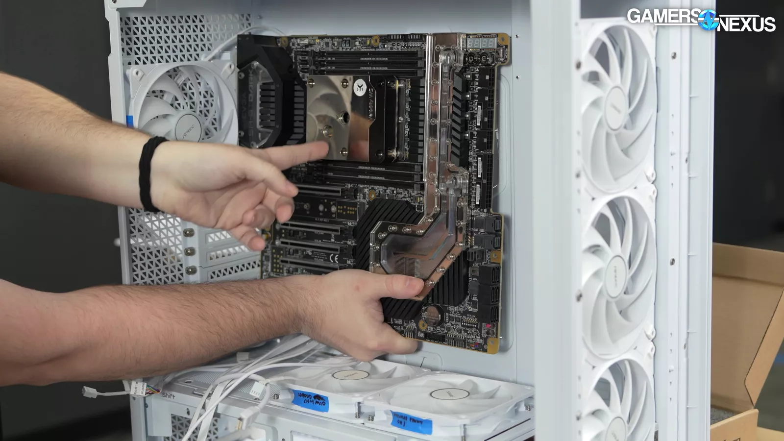 Radiator compatibility is excellent. Having room for three 140mm fans doesn't always guarantee compatibility with 420mm radiators, but because the Flux Pro's front mount can be adjusted up or down by several notches, there's definitely room. This can also allow extra headroom for big pump-on-rad designs.