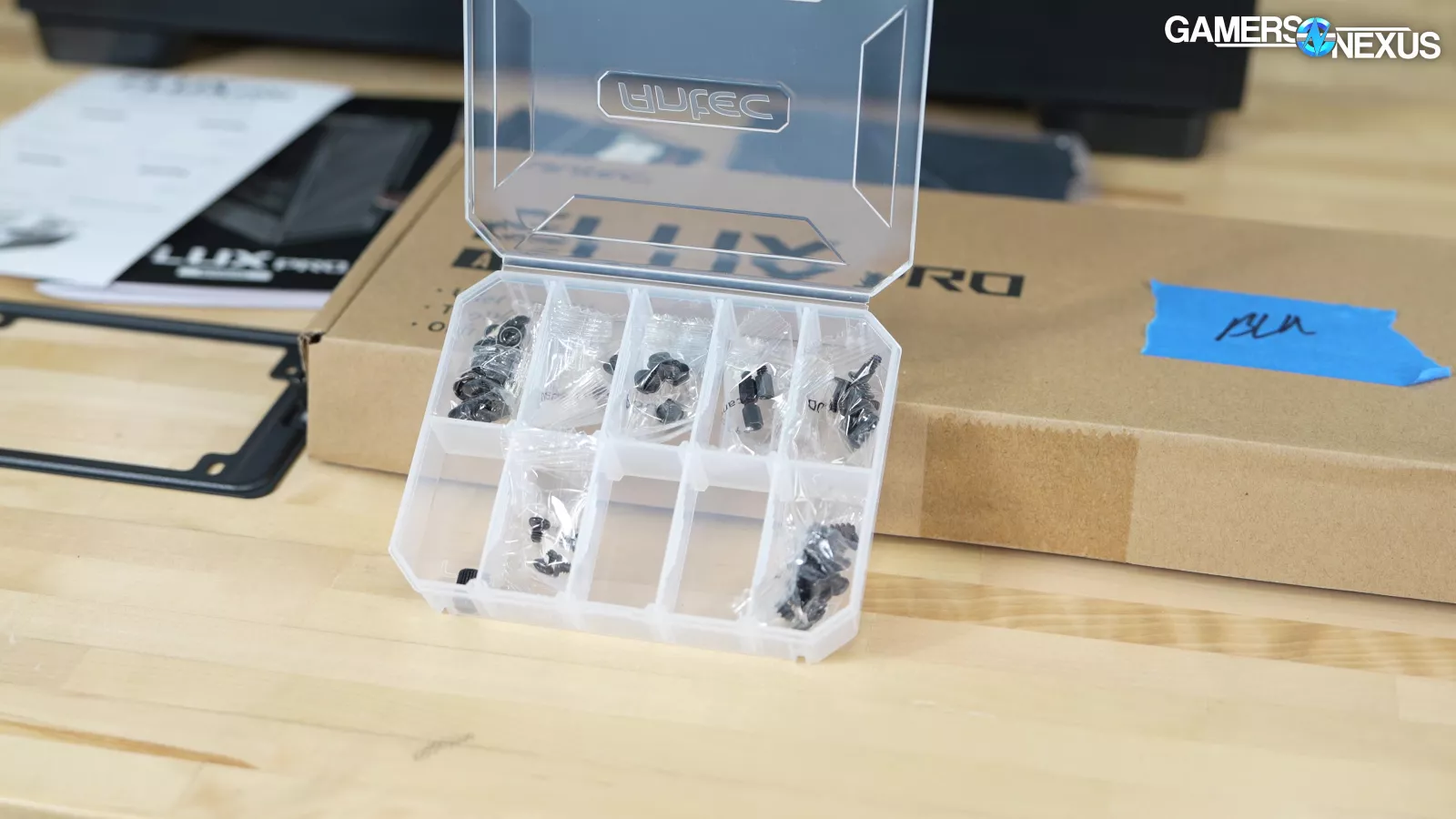 The Flux Pro's accessories include a full set of covers for the top of the PSU shroud, a standard PSU frame (if the iShift system isn't used), and a screw sorter. There are exactly eight screws for the two possible 3.5" drives, and exactly four screws to attach the two additional shroud covers. We'd like a couple spares. There isn't a spare set of dust caps for the top I/O like there was with the C8, but that's fine by us. Taking the top panel off pops every single dust cap out.