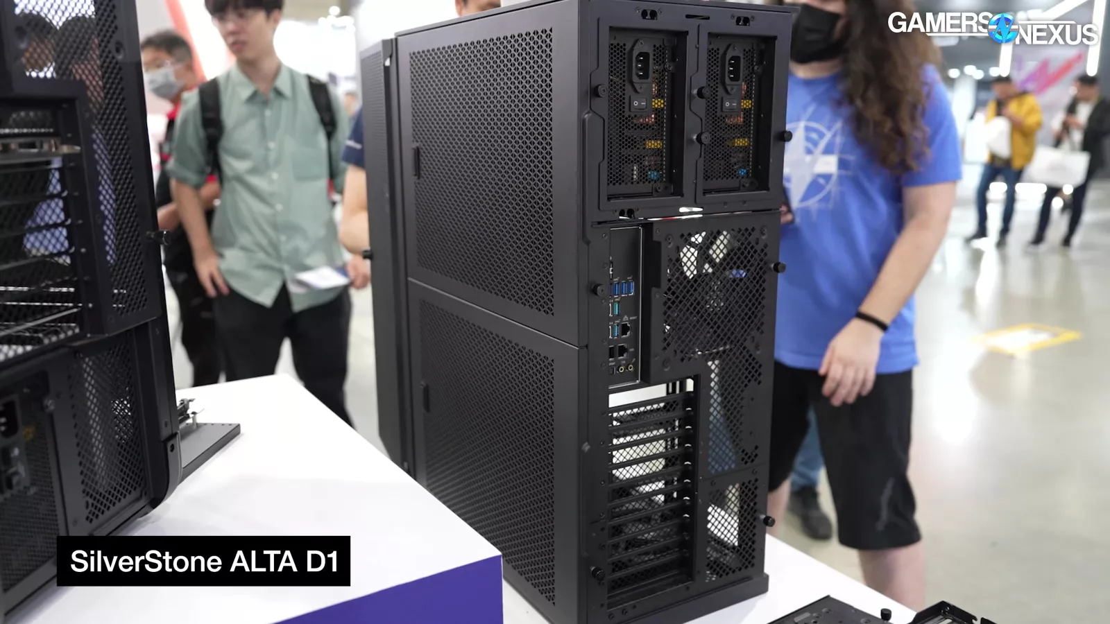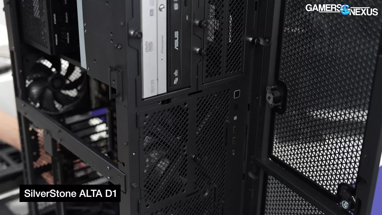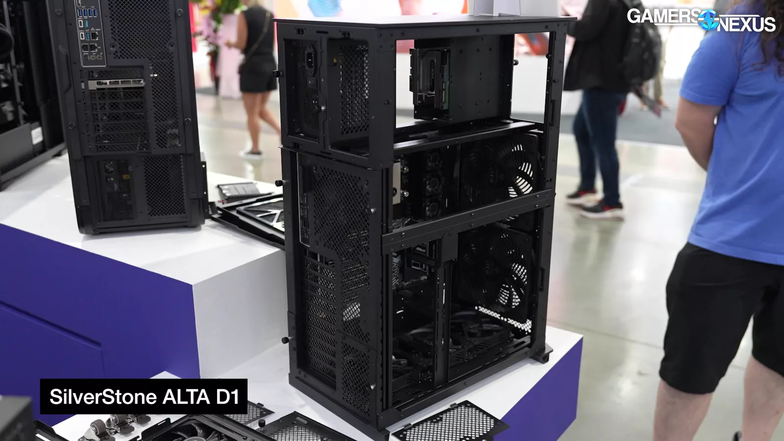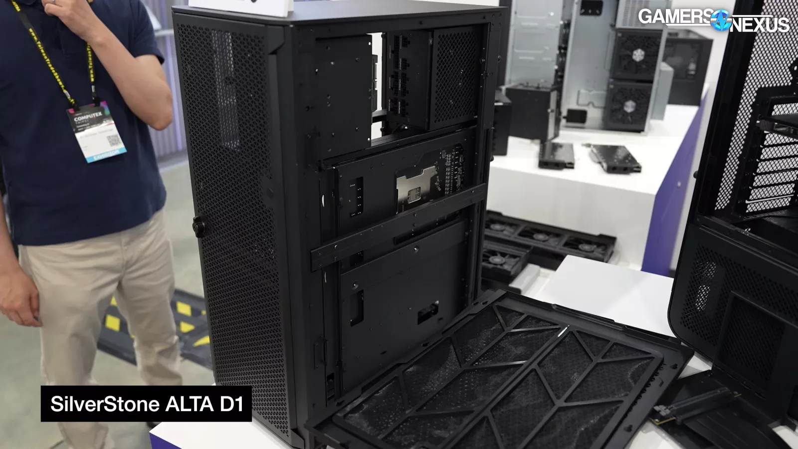 Before closing out this category, we want to give some recognition to SilverStone's ALTA D1. The ALTA D1 is an $800 halo product that's finally hit retail following our first encounter with it at Computex 2023 and again at Computex 2024. The price is ridiculous and very few people will buy the case, but the mechanical design hopefully inspires some more affordable cases: It has modular bays on rails everywhere, including 5.25" drive support, socketable radiators, a slide-out motherboard tray, SSI-EEB support, 11 expansion slots, large fan mounts, repositionable power supplies, and a true home server setup. It's beyond what we could recommend in a serious review if only for the price, but we may come up with a fun project for the ALTA D1 in the future and we respect its mechanical design.