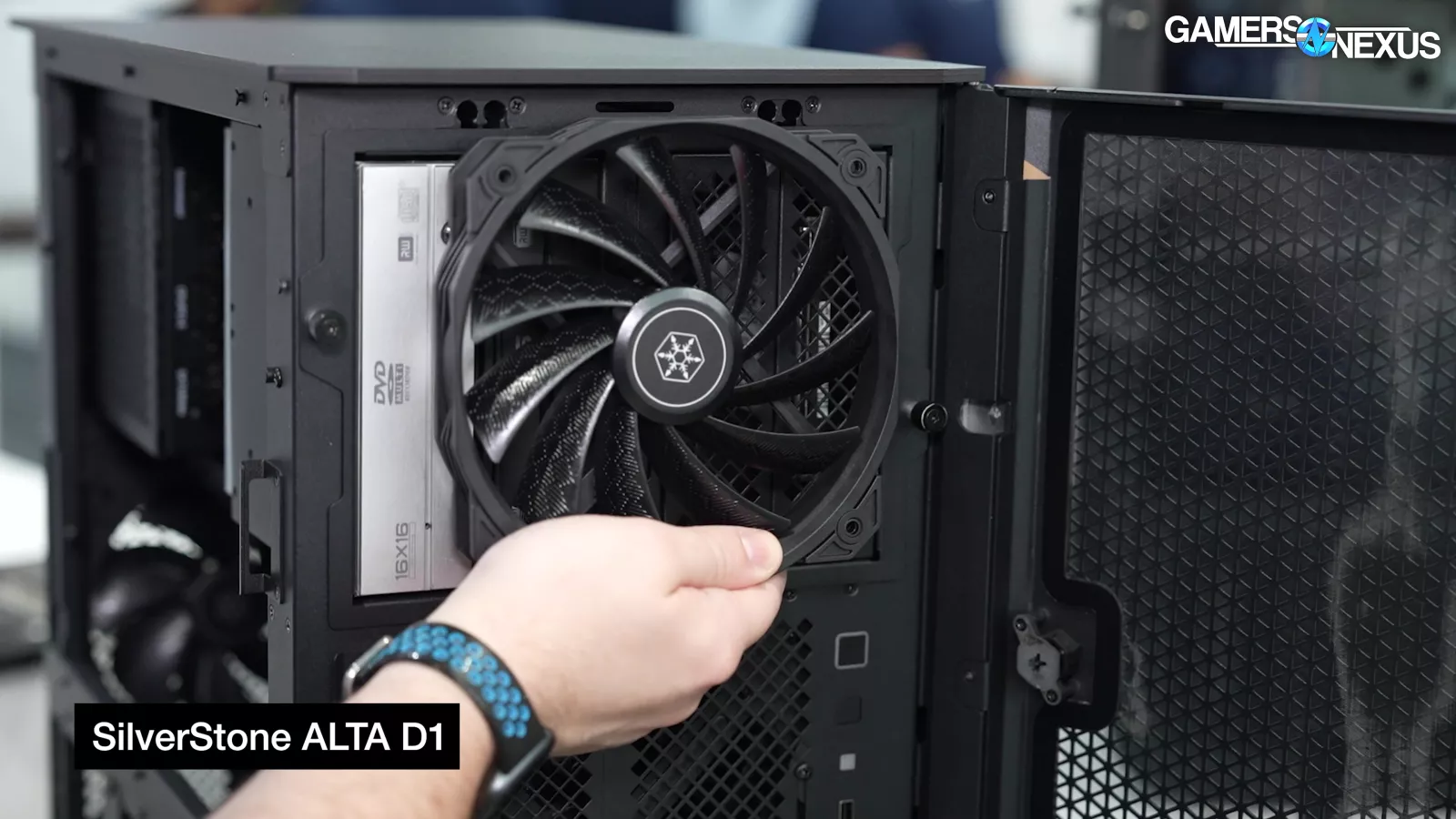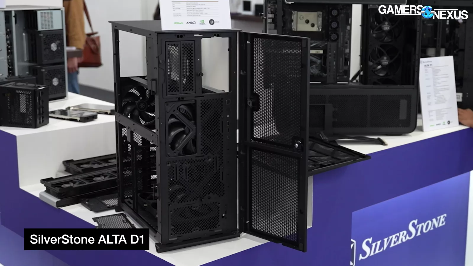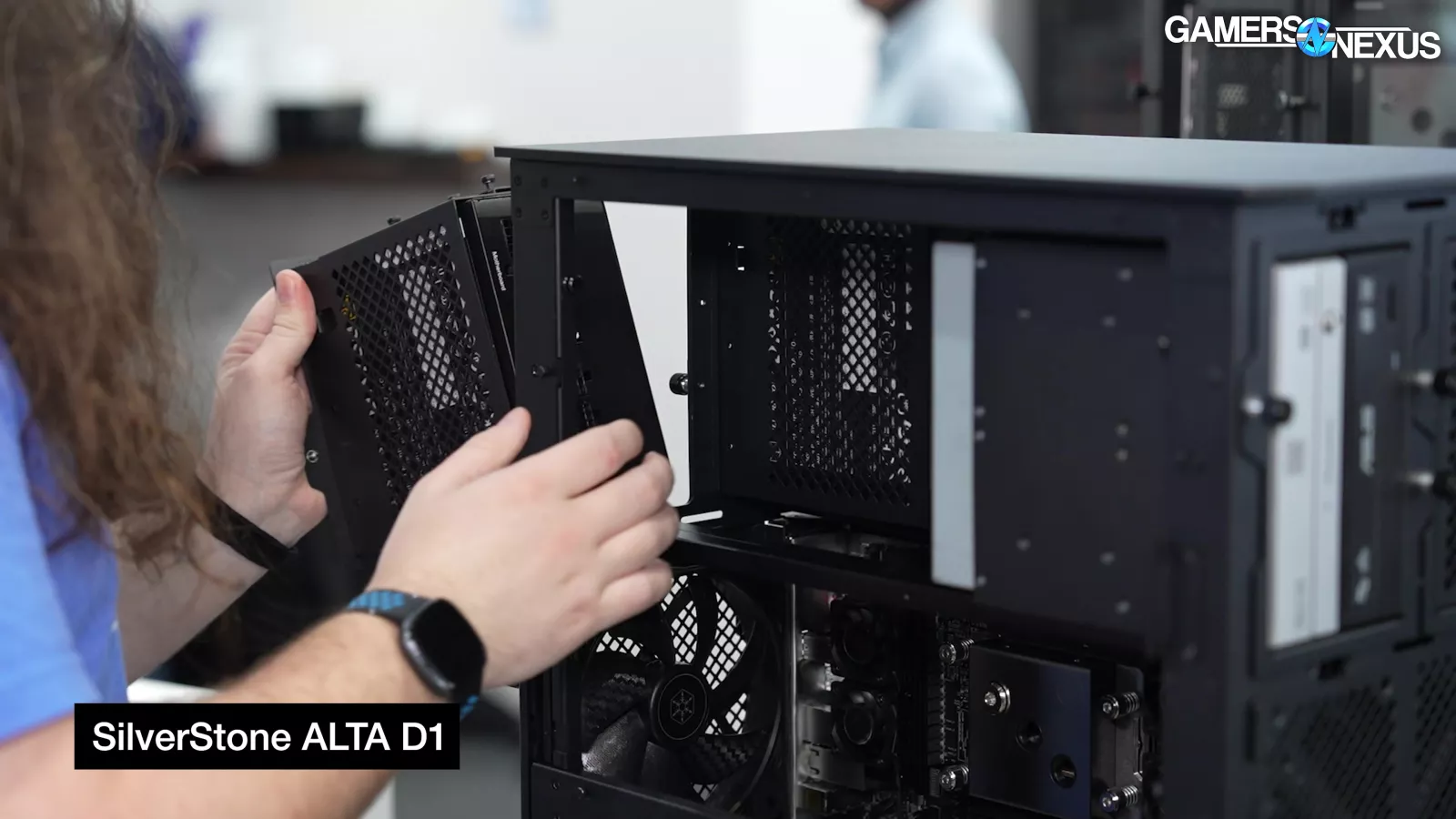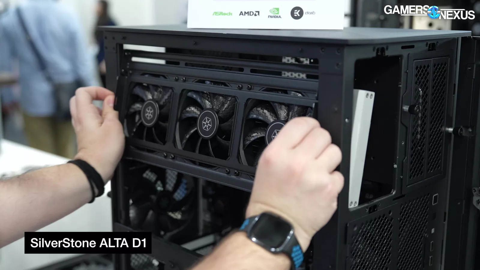 Before closing out this category, we want to give some recognition to SilverStone's ALTA D1. The ALTA D1 is an $800 halo product that's finally hit retail following our first encounter with it at Computex 2023 and again at Computex 2024. The price is ridiculous and very few people will buy the case, but the mechanical design hopefully inspires some more affordable cases: It has modular bays on rails everywhere, including 5.25" drive support, socketable radiators, a slide-out motherboard tray, SSI-EEB support, 11 expansion slots, large fan mounts, repositionable power supplies, and a true home server setup. It's beyond what we could recommend in a serious review if only for the price, but we may come up with a fun project for the ALTA D1 in the future and we respect its mechanical design.