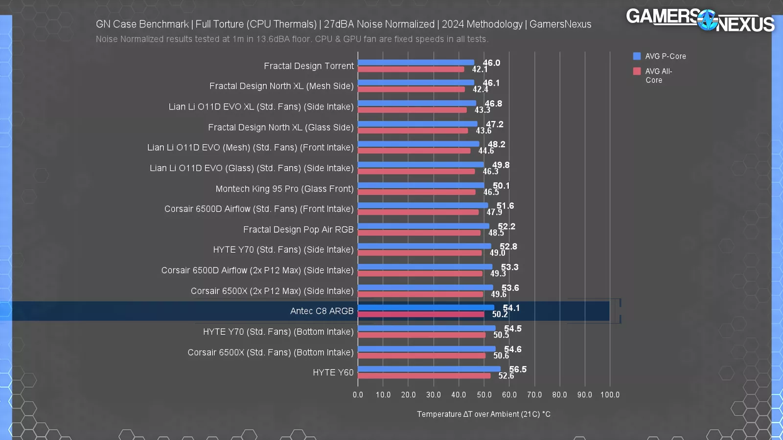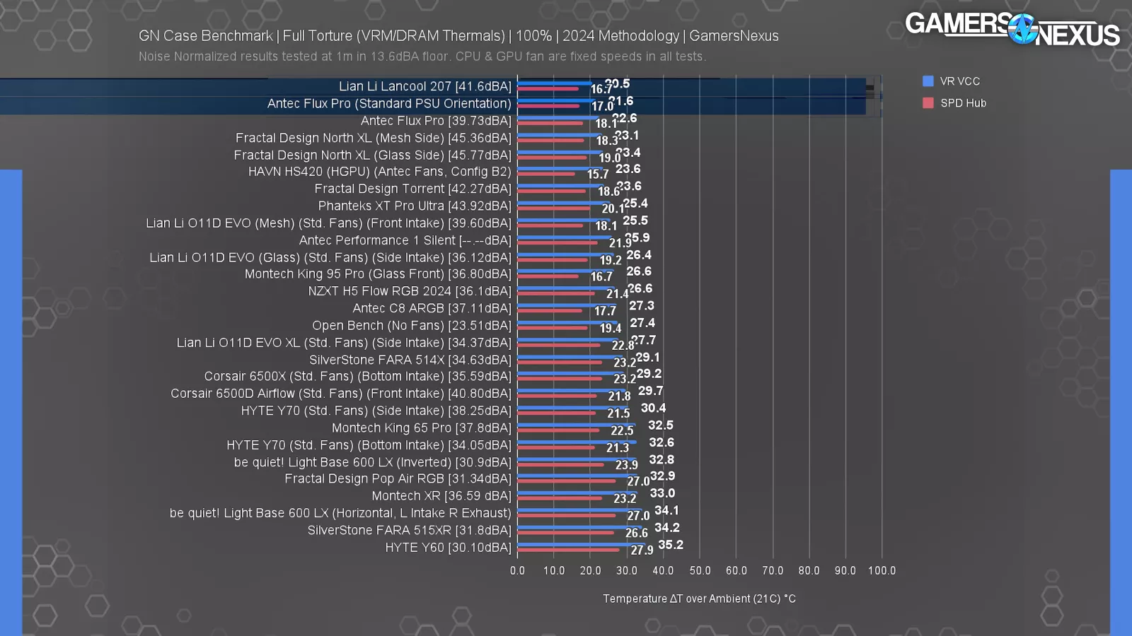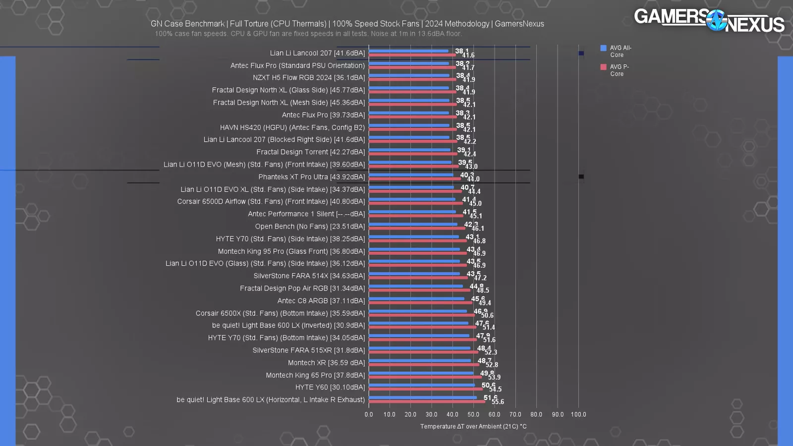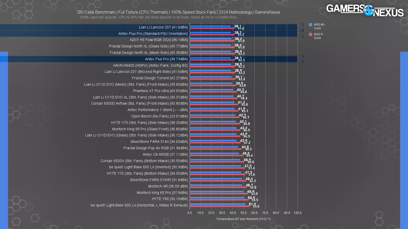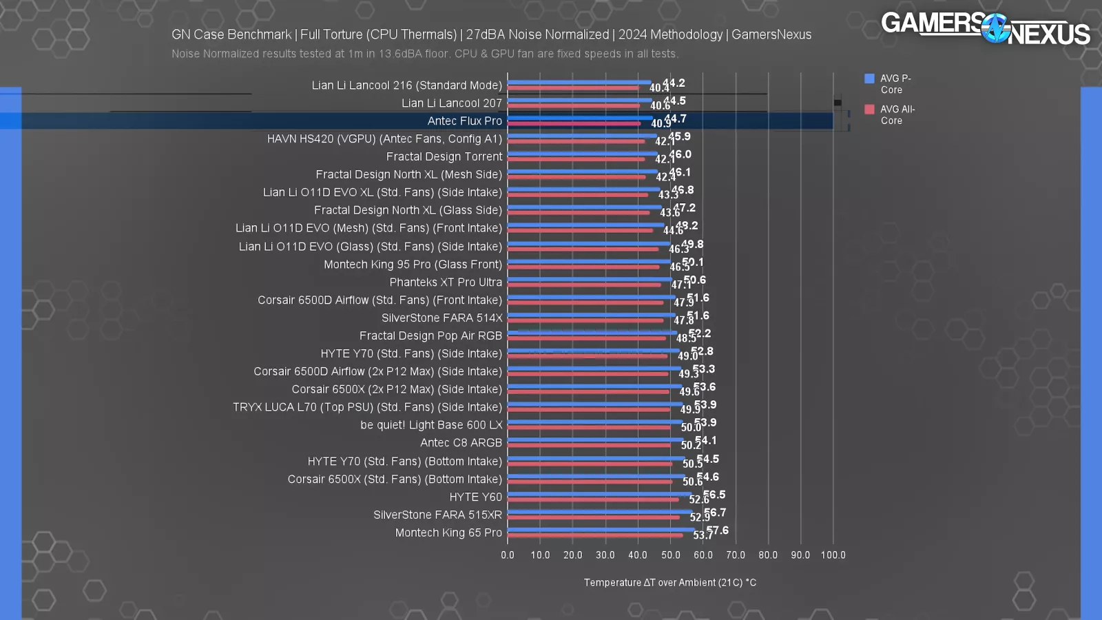 CPU thermals are tied at the top of the chart with the Lancool 207 at 41 degrees Celsius above ambient all-core and 45 degrees on just the P-cores. Some of our other high-performing cases like the North XL and Torrent come close, and the Lian Li Lancool 216 (watch our review) is tied in this one, but the Flux Pro is the best overall when taking all results into account.