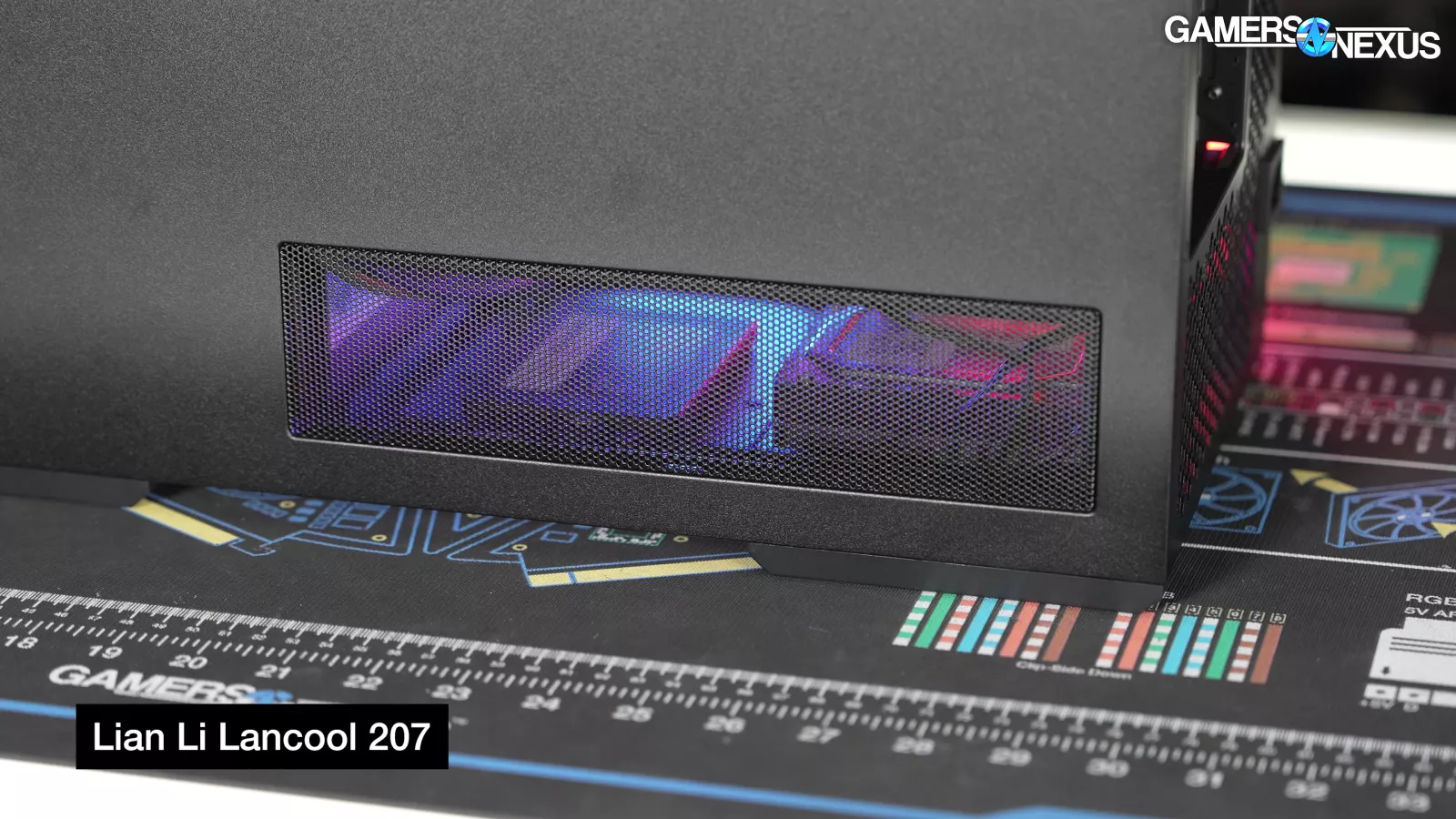 The Lancool 207 is a solidly-built case with sturdy toolless panels, which is unusual at this price point. The most unusual aspect, though, is at the bottom of the case, where two 120mm intake fans are positioned directly underneath the GPU, while the PSU is mounted at the front with an extension cord. The shroud is ventilated on both sides as well as the rear in order to provide an airflow path for the bottom intake fans (although adding drives and cables to the case reduces that ventilation, but the ample intake through the rear counters this). In addition to the two bottom intake fans, 2x 140mm ARGB front intake fans are included with the case.