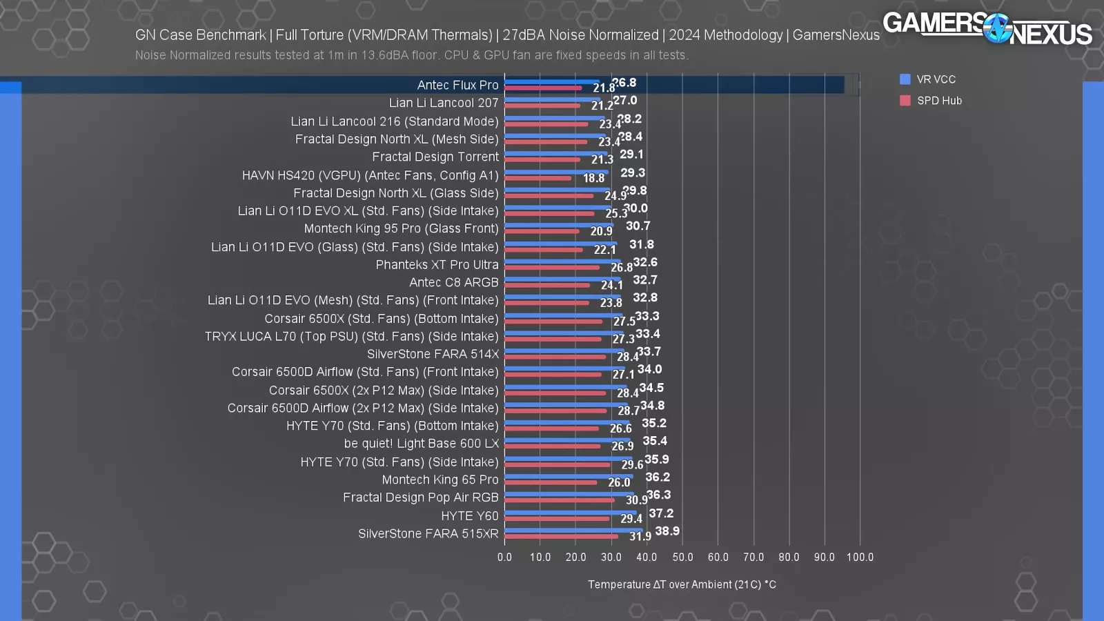 In VRM and DDR5 memory thermals, the Flux Pro is the chart leader by a technicality, but again is functionally tied with the 207. Both the Flux Pro and 207 offer excellent cooling at the noise levels, but the Flux Pro technically takes more lead spots than the 207. But the 207 is well-represented already.