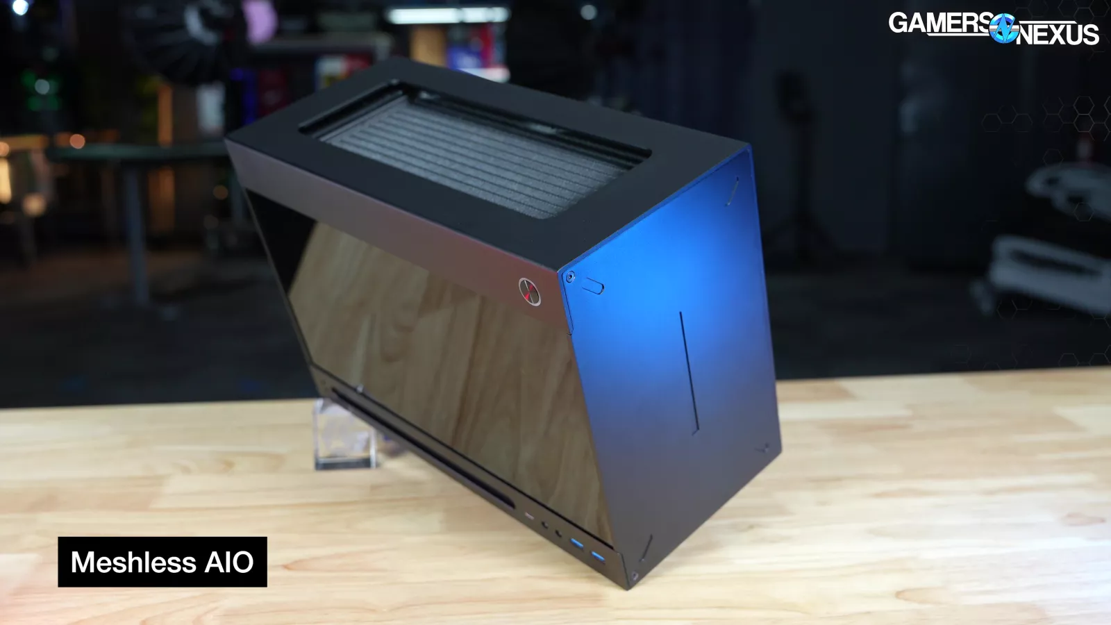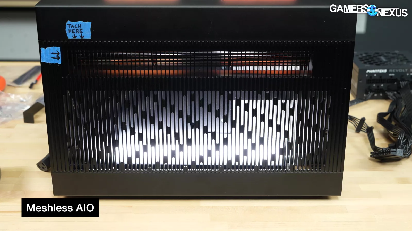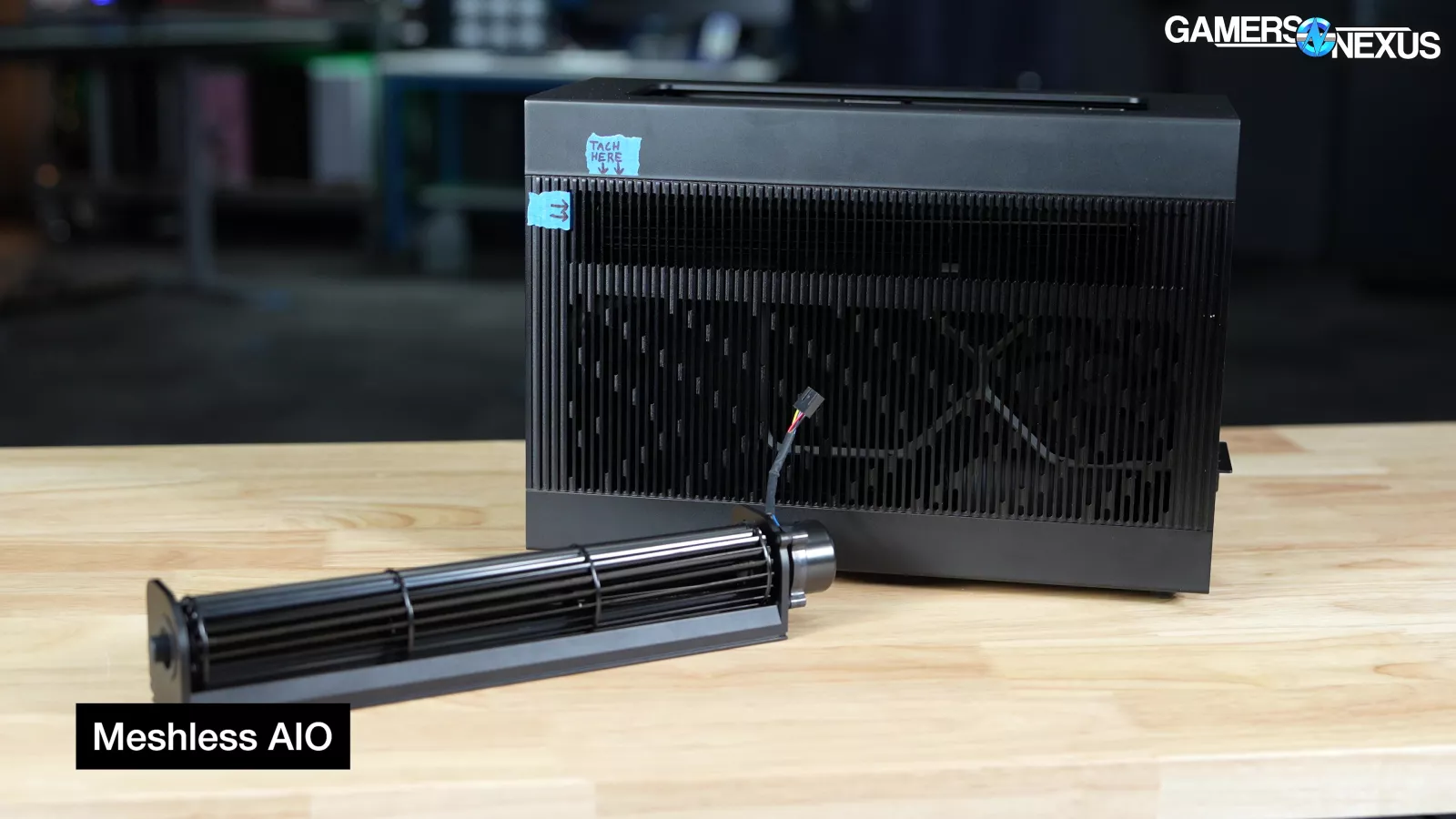 The Meshless AIO (now apparently listed with a formal launch name as the “MD280”) is built around a cylindrical crossflow fan, like a smaller version of the fan in a mini-split wall unit. We found the case design curious enough that we built this 3D animation to help explain and educate on how these work. The basics are that the crossflow fan shoots hot air out at the upper edge of the side panel, and theoretically pulls cool air in everywhere else: towards the GPU fans from the side panel, through the radiator, and over the motherboard and PSU from a tiny strip of ventilation along the bottom edge of the case. In practice, we found that the GPU was better cooled by taping a couple of normal 120mm case fans to the top of the case, but these had other downsides in other tests.