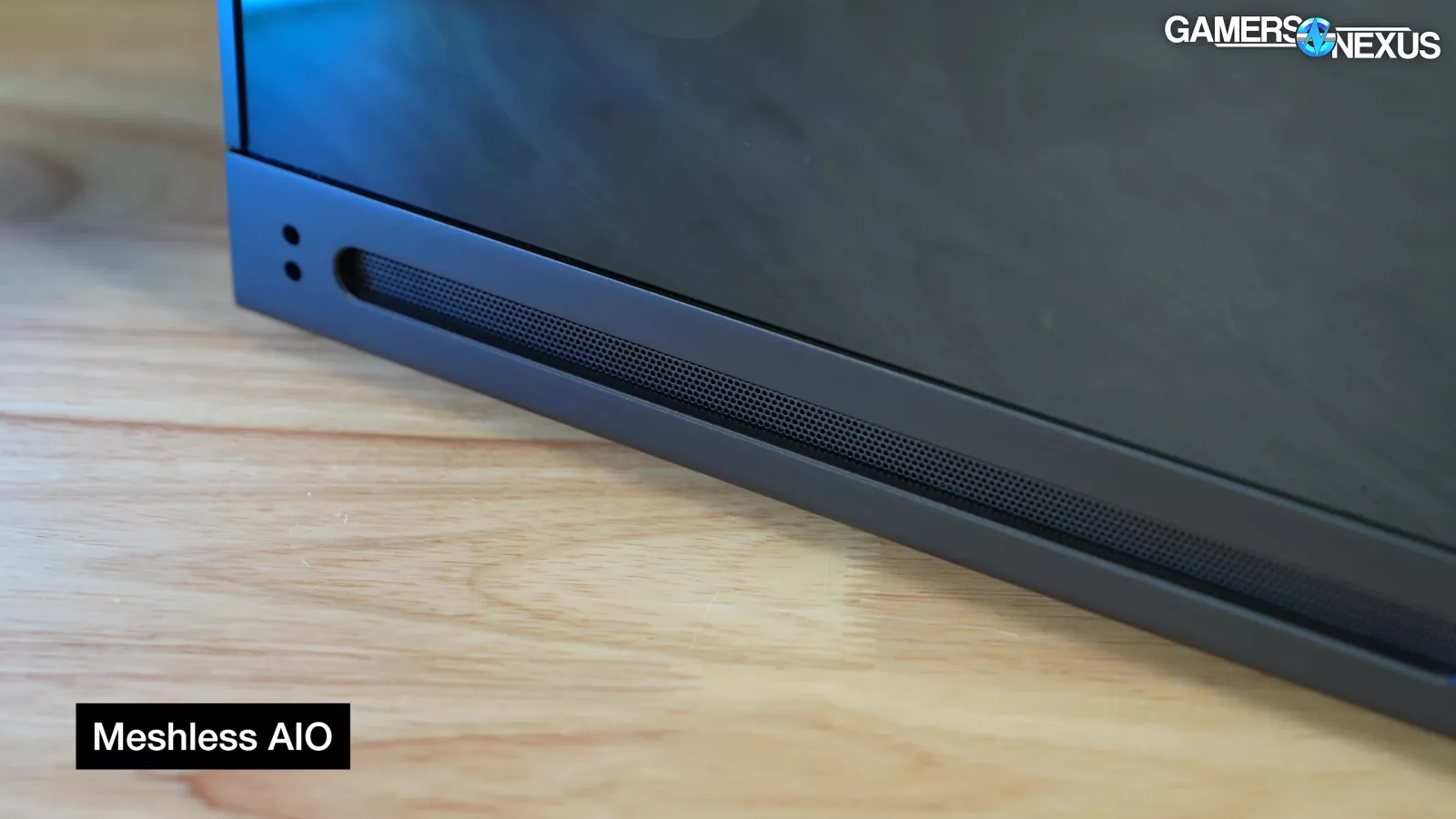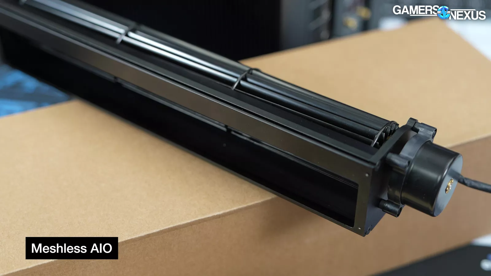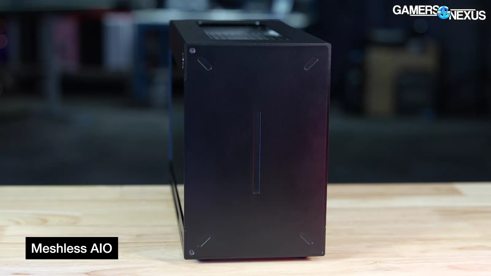 The Meshless AIO (now apparently listed with a formal launch name as the “MD280”) is built around a cylindrical crossflow fan, like a smaller version of the fan in a mini-split wall unit. We found the case design curious enough that we built this 3D animation to help explain and educate on how these work. The basics are that the crossflow fan shoots hot air out at the upper edge of the side panel, and theoretically pulls cool air in everywhere else: towards the GPU fans from the side panel, through the radiator, and over the motherboard and PSU from a tiny strip of ventilation along the bottom edge of the case. In practice, we found that the GPU was better cooled by taping a couple of normal 120mm case fans to the top of the case, but these had other downsides in other tests.