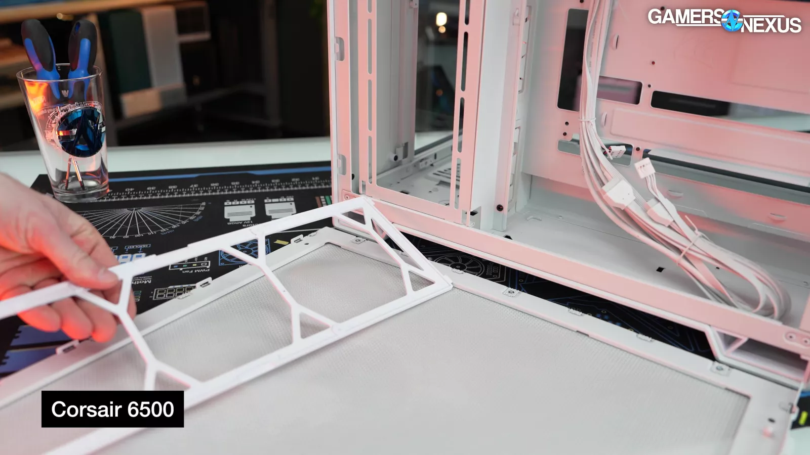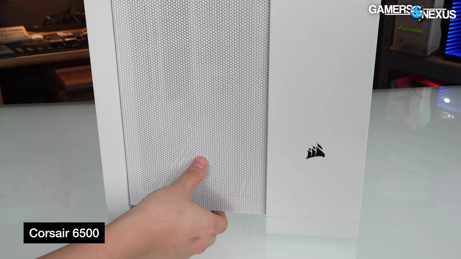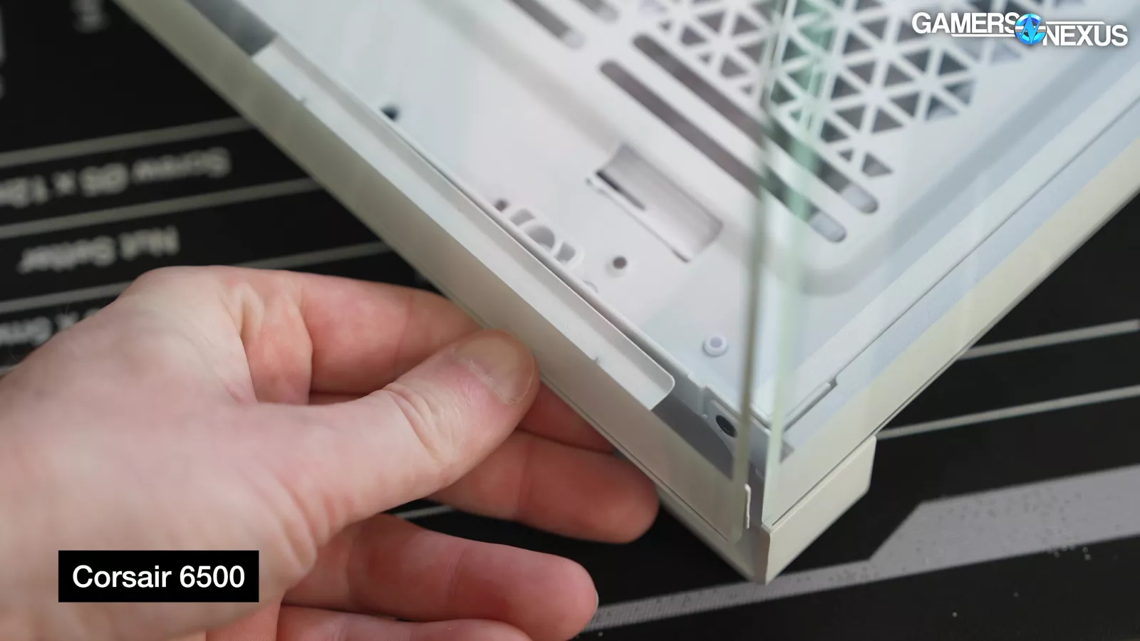 But then it launched the 6500 (read our review) series this year, attempting to jump onto a hype train that had already left the station, and doing so with substandard build quality. The Corsair 6500D and 6500X were $200 without fans, both featuring superbly bendy panels without any reinforcement -- which we found totally unacceptable for a $200 so-called “Premium” case. There were lots of plastics, misaligned panels, and build quality issues.