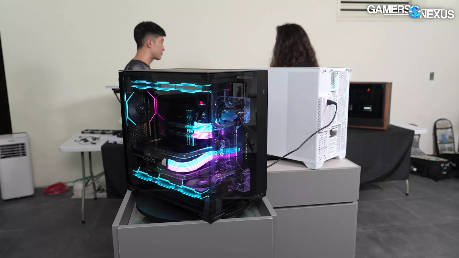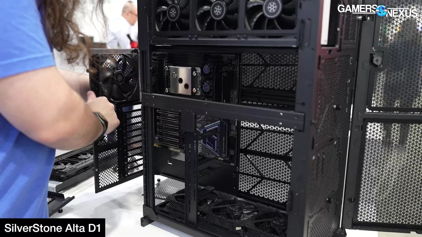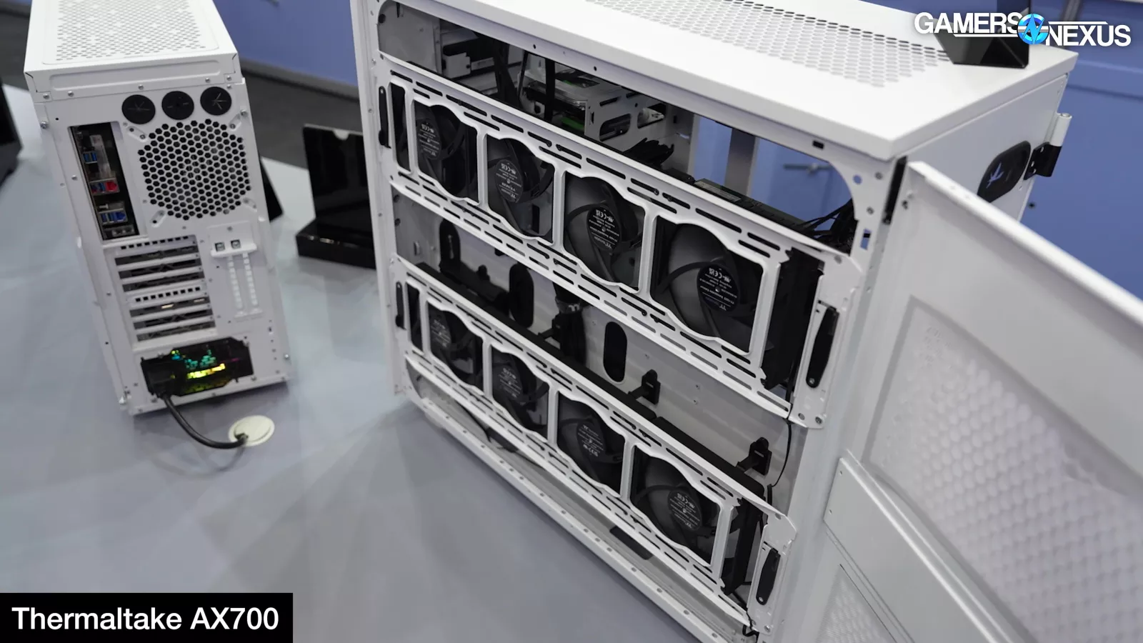 The show build had about 32 fans installed and two systems (one ITX and one ATX), but doesn't focus on the functional storage afforded by the AX700 as much. This is another one where we liked the smaller attention to detail: The pre-greased rails and actuation for the fan and radiator trays were nicely done and the small fan size markings on the rails makes installation clearer, reviving the 1000D highlights of the past. Corsair doesn't reach SilverStone levels of pure mechanical functionality and quality of life features in a huge case, but it also comes in cheaper -- but still not cheap. The 9000D will be around $500, but is expected to be a lot cheaper than Silverstone’s D1.