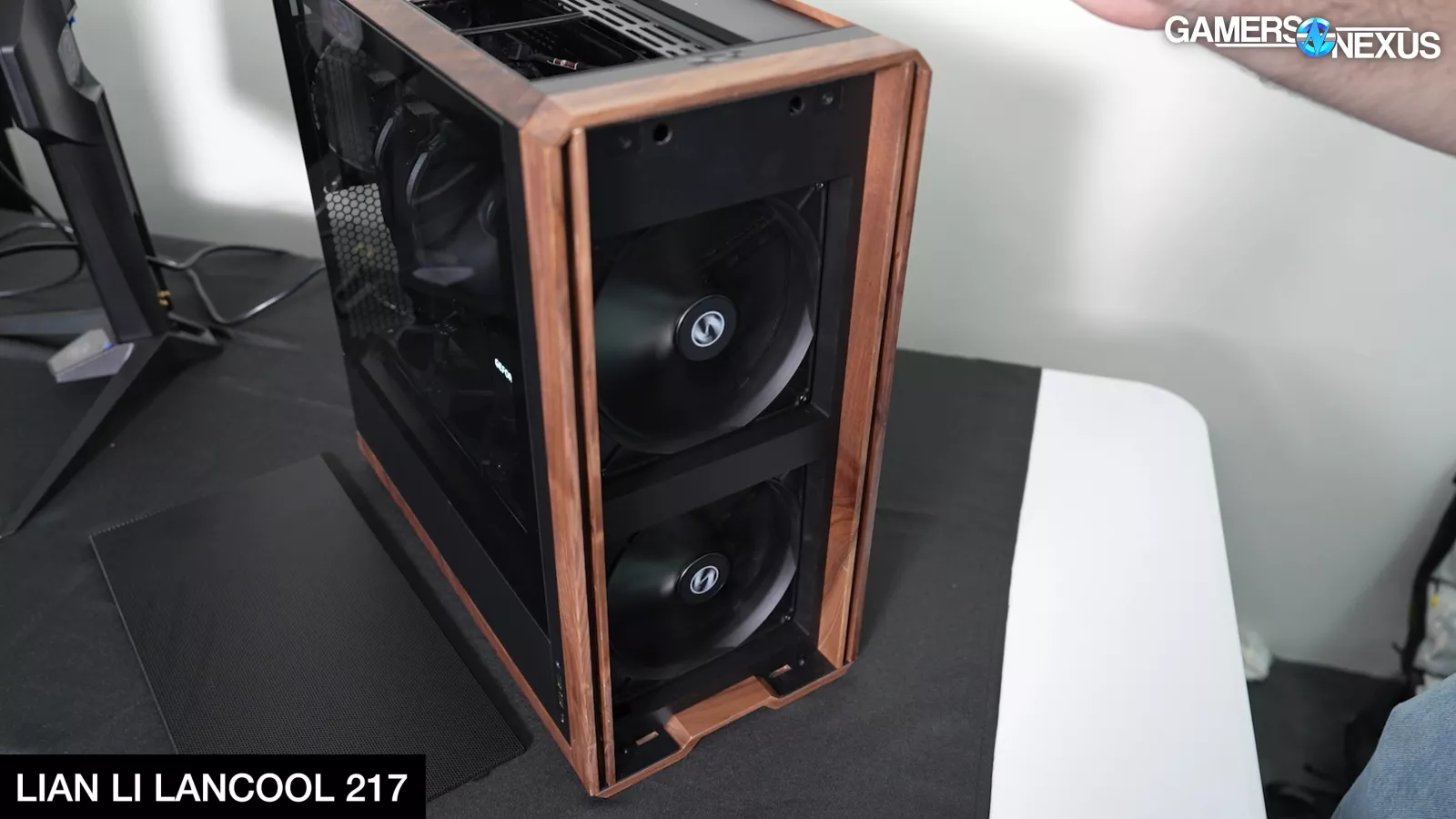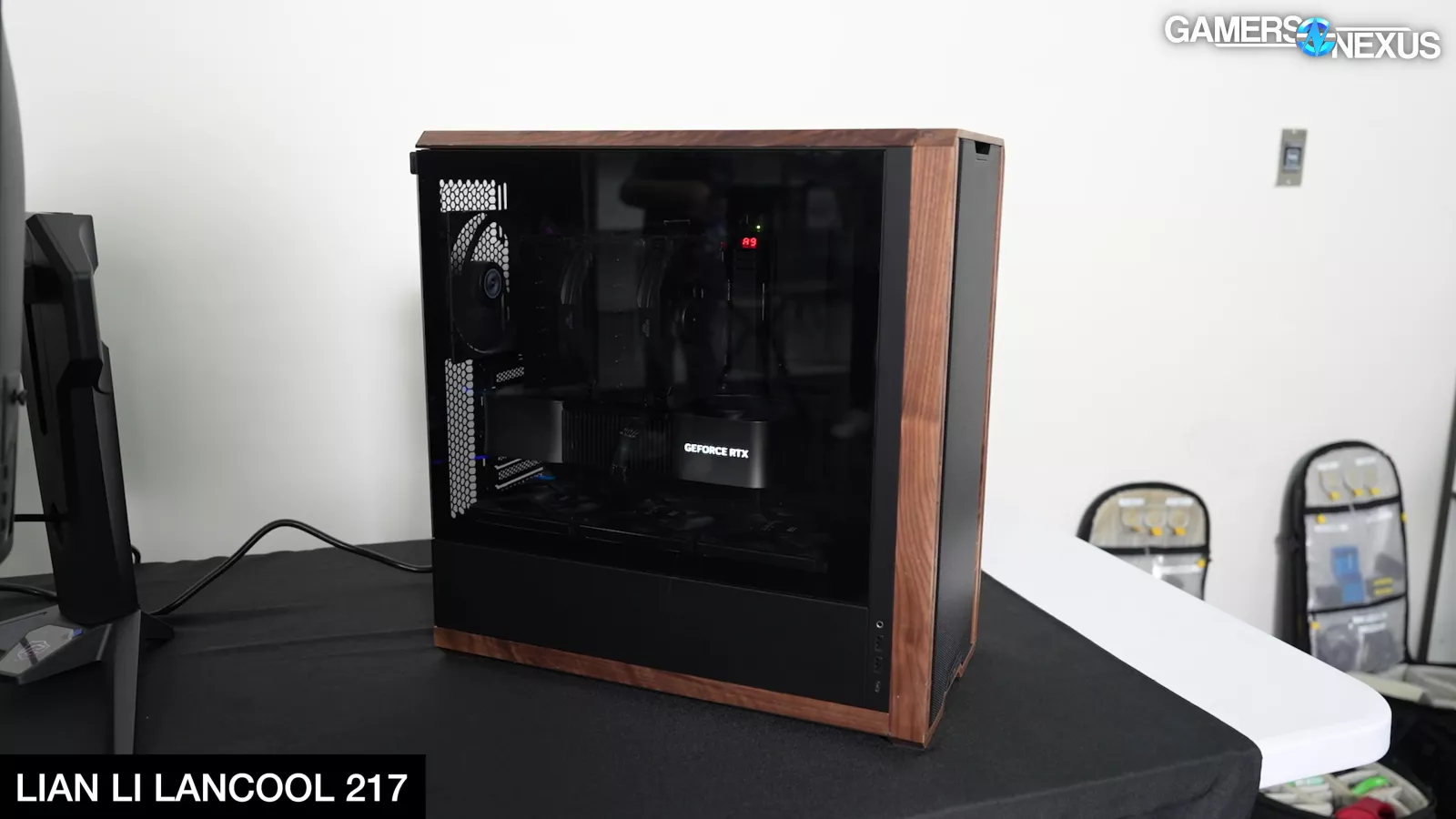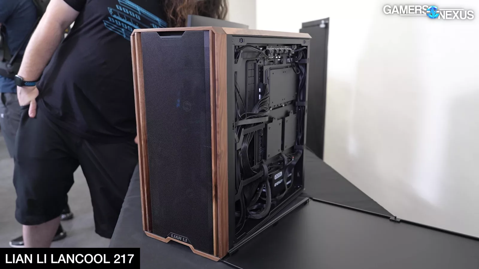 The more interesting of these two is the Lancool 217. The 217 is currently a prototype using walnut wood paneling to match the aesthetic created by (to our knowledge) In Win and later popularized by Fractal. The prototype had several scuffs on its misaligned wood panels, but Lian Li tells us that these are related to the hand-made nature of the prototype unit.