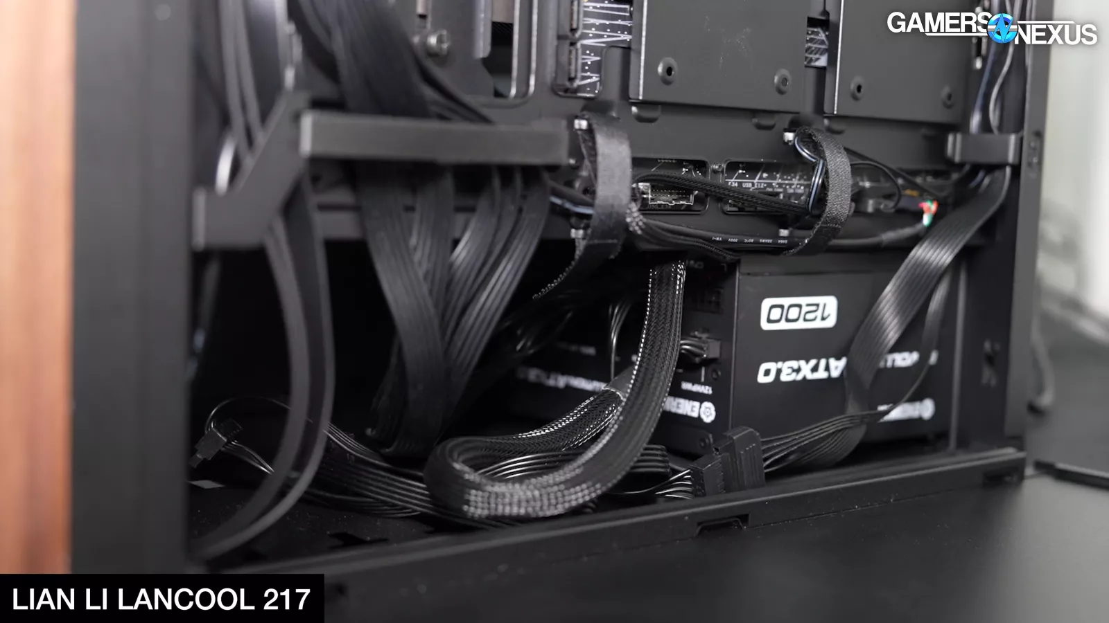 The 217 uses a rear 140mm fan and a strange mix of 2x 170mm large fans in the front panel. We've seen 160mm fans on some cases, including Lian Li's own, and 180s are popular on several popular cases (including the Fractal Torrent), but 170s are rare. Lian Li chose 170s for the simple reason that they're the largest size that'll fit without scaling the case wider to accommodate 180s. The company also lined the fans up with a separating block in between, shifting the lower 170mm fan down further. This forces its air into the PSU chamber to eventually find its way up into the GPU side of the video card, theoretically more evenly distributing air across the full surface of the video card rather than focusing it primarily on the power side.