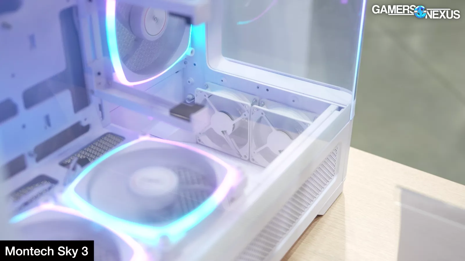 We'll shift focus to the XR first: The Montech XR case comes in either a glass fish tank style with 3 fans or a mesh panel, wood-embellished variant with 4 fans named the "XR Mesh." The fish tank is $64, the Mesh is $70. The XR Fishtank includes 2x 120 reverse side fans and 1x 120 back fan, all ARGB. The tooling is somewhat repurposed: Montech says it took its Sky 2 tooling and scaled it. The Mesh variant has 3x 120mm front fans and 1x 120mm rear fan, with a wood plate that feels thrown on for the trend, but simultaneously doesn’t look bad. The interior chassis is incredibly plain and has no ease-of-installation features that are particularly strong. It’s basic. The strength of the case is brute force air movement as cheap as possible, which has been an underserved market for the last few years. The XR just released and we plan on buying one to review as soon as our schedule clears.